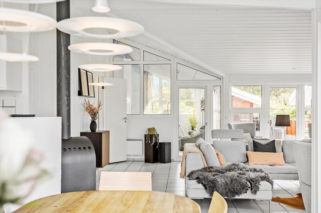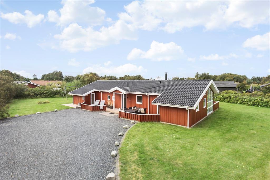 Sommerhuset har et kønt og klassisk ydre med rød træfacade og hvide vinduesrammer – men det skiller sig dog ud fra mængden ved at være en del større end de gængse ferieboliger. Inden døre kan I nemlig brede jer på hele 162 m2, og derfor er der også plads til et selskab på otte feriegæster og to husdyr. Det centrale samlingspunkt er stuen, som er et pænt og velholdt opholdsrum med brændeovn og åbent køkken. En alkove og to hemse er også del af opholdsafdelingen, så der er flere hyggekroge at vælge imellem, hvis store og små familiemedlemmer får lyst til at flade ud med en god bog eller et spil på mobilen. Planløsningen består desuden af fire gode soveværelser og to badeværelser, hvoraf det ene ligger som del af wellnessområdet. Her kan I nyde livet i spabadet og saunaen, og poolen giver jer mulighed for både at plaske rundt for sjov og svømme baner, hvis formen skal holdes ved lige.