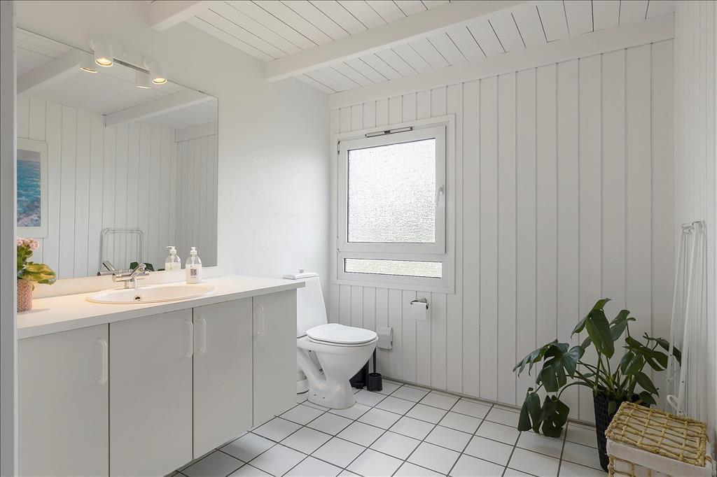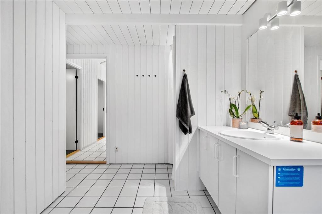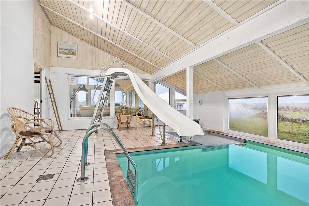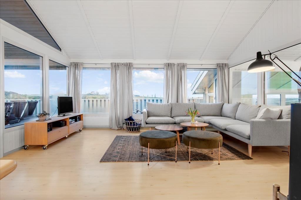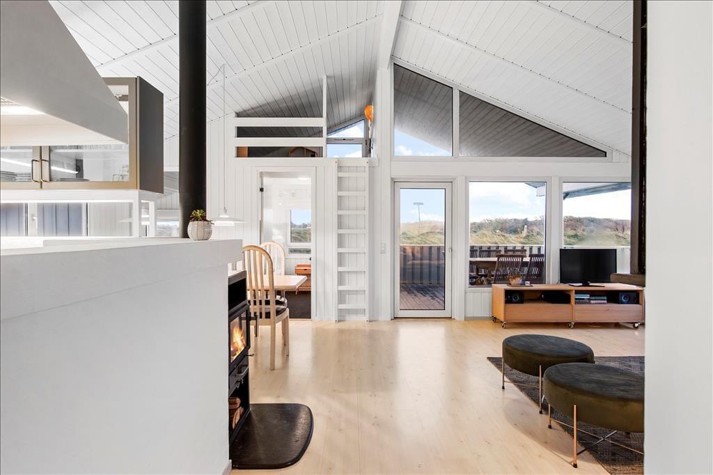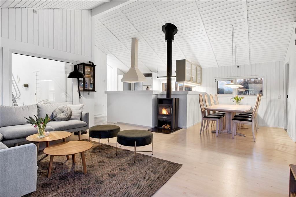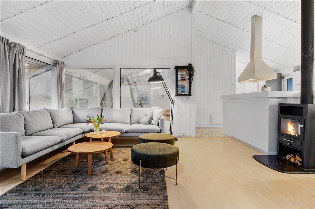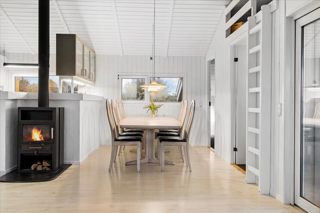 Det føles luksuriøst at bo i et sommerhus på hele 148 velindrettede kvadratmeter – ikke mindst, når en del af pladsen er dedikeret til en lækker poolafdeling. Om morgenen kan I for eksempel starte med at svømme i poolen, mens aftenen kan byde på total afslapning i form af et varmt spabad og en tur i saunaen. Afslapningsstunderne kan alternativt foregå i det tilstødende opholdsrum, der består af køkken og stue i åben forbindelse: Midt i det højloftede, lyse rum står en brændeovn klar til at sprede varme, og hvis I trænger til underholdning, er der blandt andet TV med Chromecast og DVD-afspiller at fornøje sig med. Det moderne møblement giver jer en både flot og komfortabel ramme om hyggestunderne, og så sørger de store vinduespartier for, at I har frit udsyn til Lønstrups smukke naturomgivelser. Den velfungerende planløsning byder desuden på to badeværelser og fire soveværelser med i alt 10 sengepladser, og helt i top finder I en hems, der hurtigt kan blive børnenes favoritplads, når der skal leges og hygges.