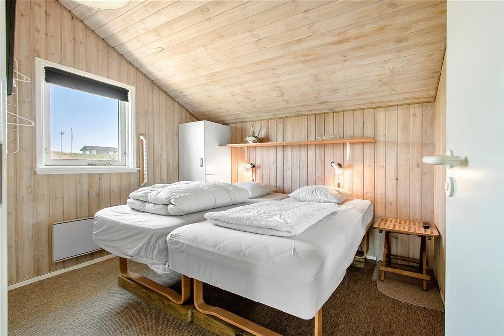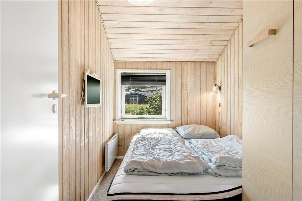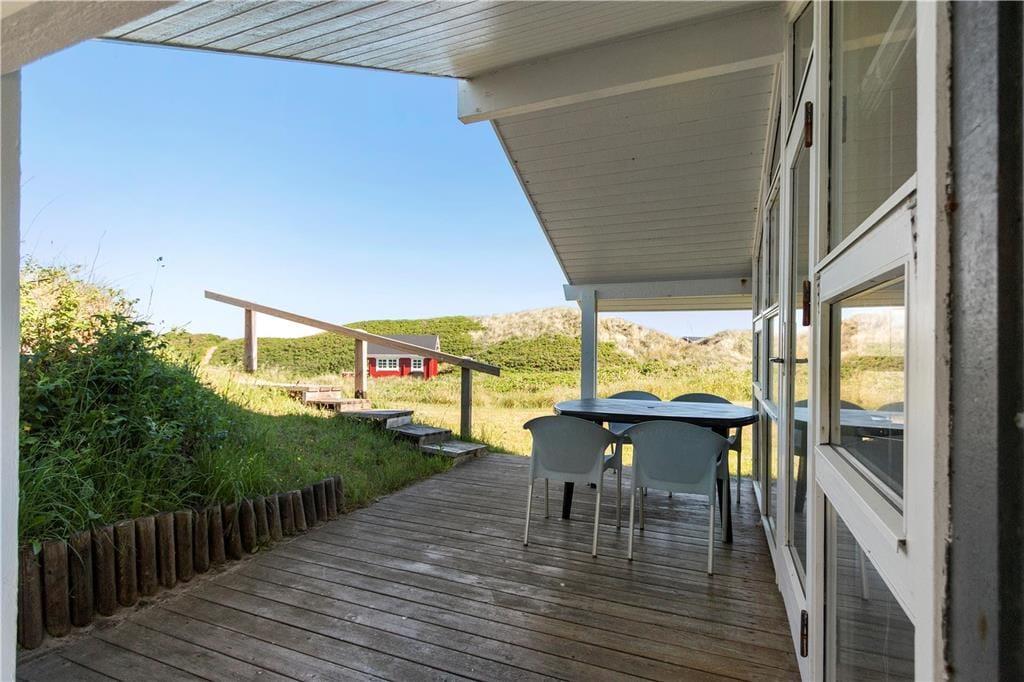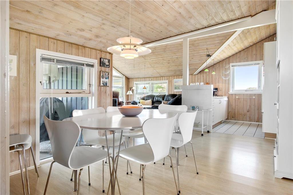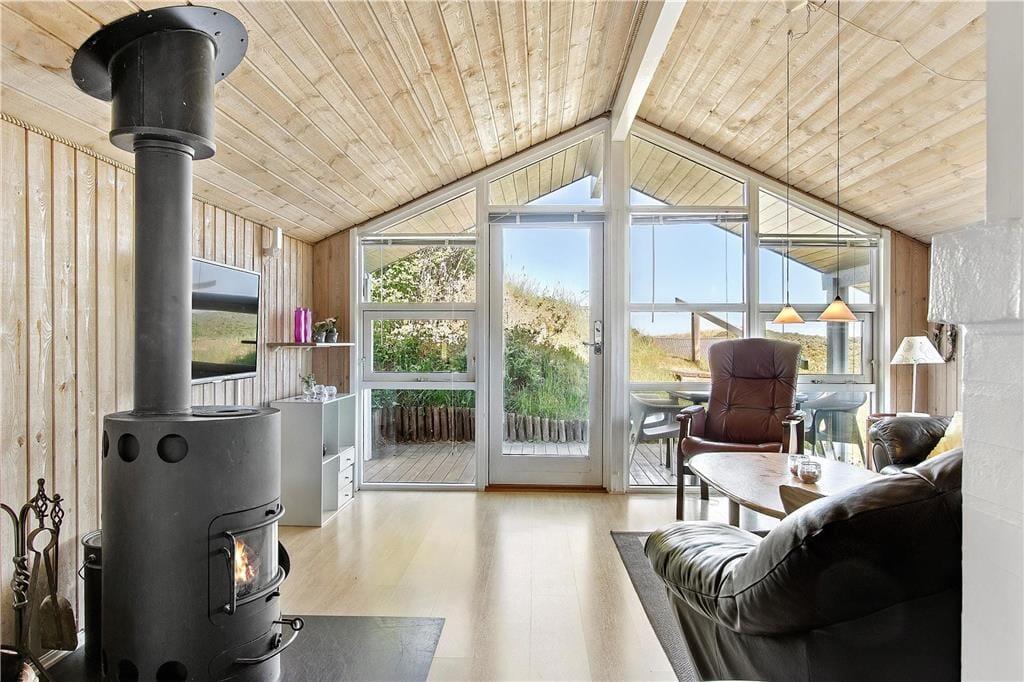 Hvis I ikke allerede er kommet i sommerhusstemning, når I kører gennem lokalområdet med duftende hybenbuske, vippende marehalm og bløde klitter, skal feriefreden nok indfinde sig, når I ankommer til huset. Atmosfæren er nemlig helt i top inden døre i sommerhuset, for her er der lyse trælister på væggene, loft til kip, brændeovn og andre klassiske sommerhustræk – og gennem vinduerne kan I selvfølgelig nyde at der er havkig og udsigt til de naturskønne omgivelser. Planløsningen byder på tre gode soveværelser med dobbeltseng og et pænt badeværelse, der er indrettet med vaskemaskine og bruseniche. Stue og køkken ligger i åben forbindelse, så selvom aftensmaden skal forberedes, kan I sagtens tage del i familiesamværet.