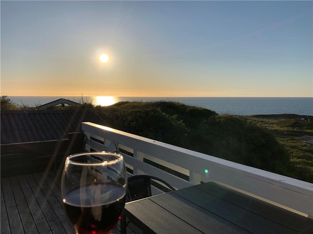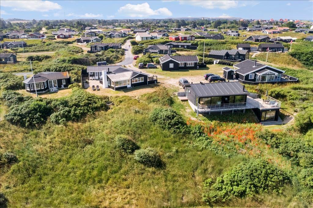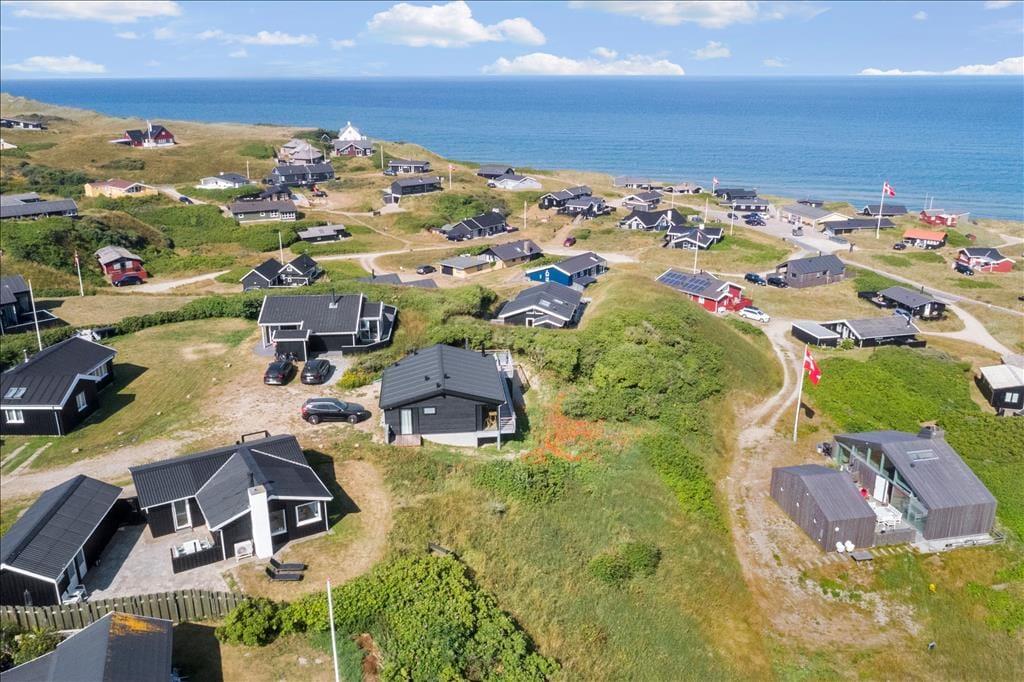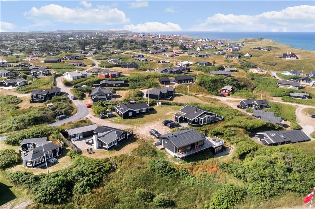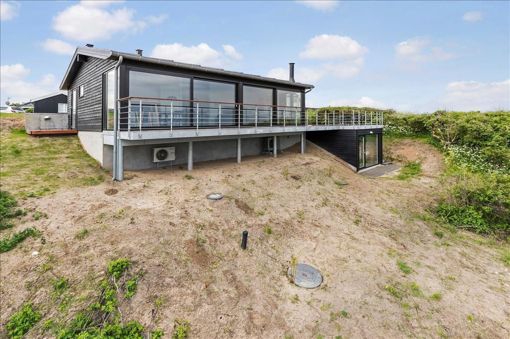 Ved ankomsten til huset vil man opdage at huset er integreret ind i den høje klit, det ligger på toppen af. Først når man kommer ned til huset og den store terrasse, med forskellige niveauer og muligheder, vil man opdage den exceptionelle udsigt og se hvordan huset er orienteret mod havet. Man står 23 meter over havet, og med kun godt 200 meter til vandkanten giver det en helt unik udsigt både over havet, men også sommerhusområdet og kystlinjen helt til Hirtshals 16 km væk. Huset har en ugenert placering i sommerhusområdet "Harerenden", hvor man kan være privat, og på trods af den høje placering ligger huset lige ved en klit, der yder læ for vestenvinden på terrassen.