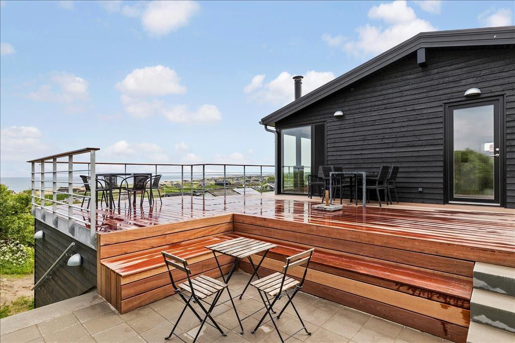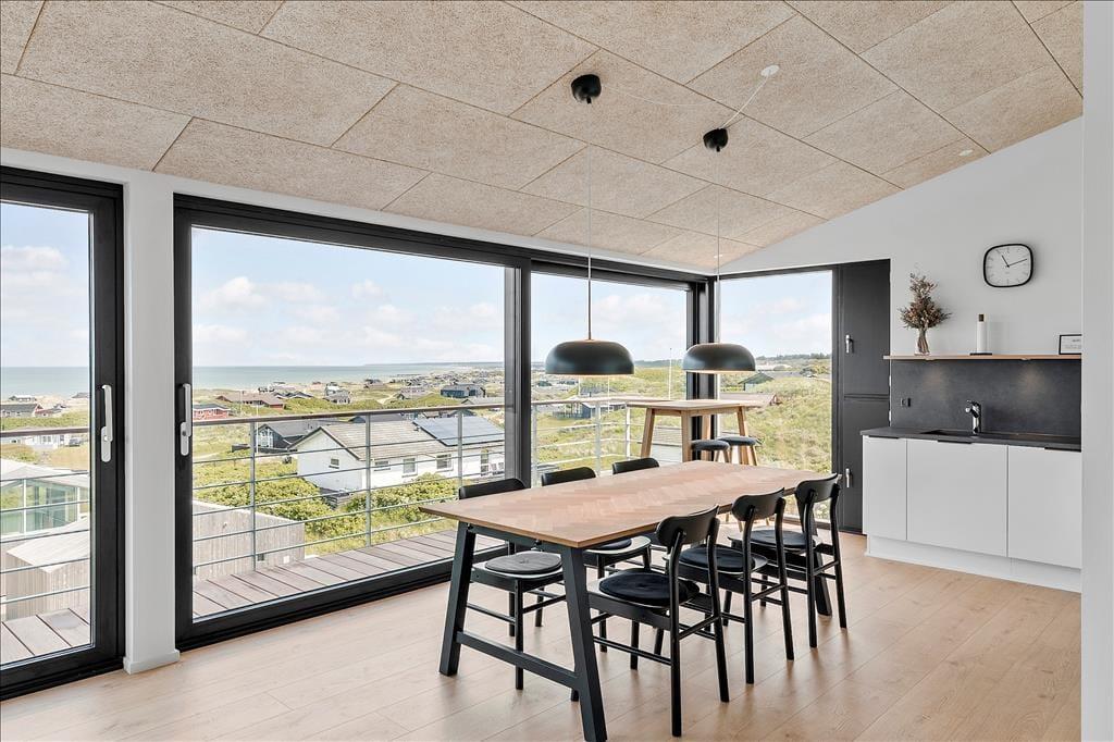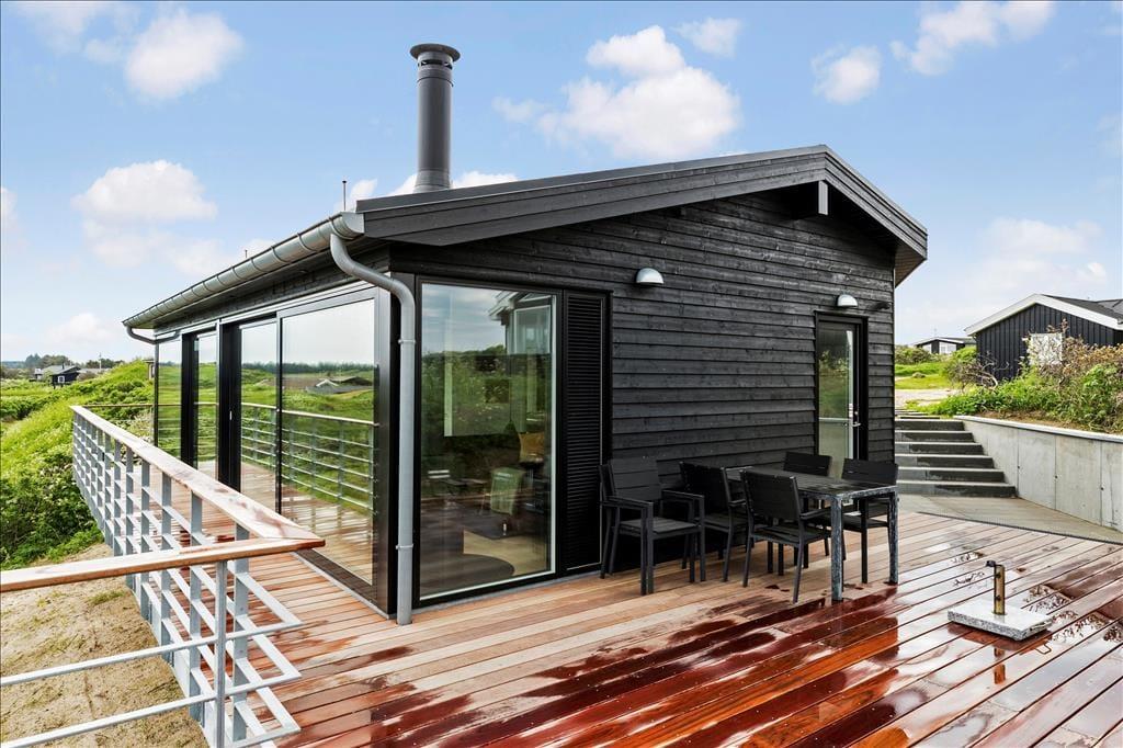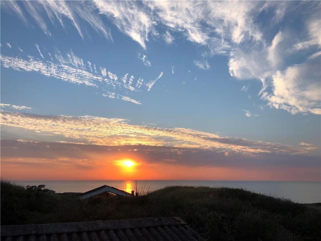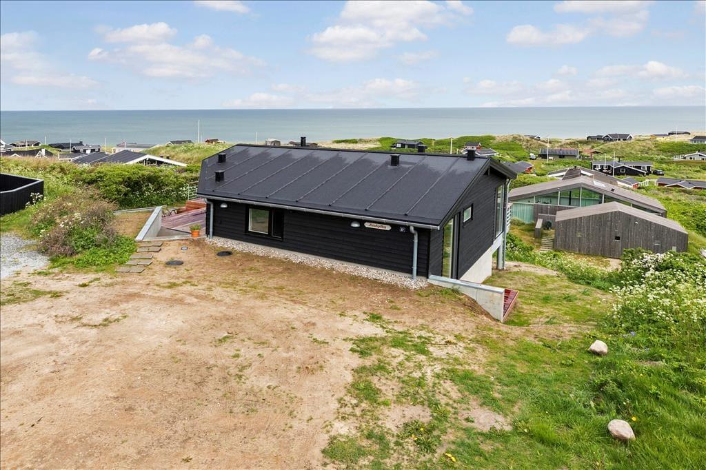 Ved ankomsten til huset vil man opdage at huset er integreret ind i den høje klit, det ligger på toppen af. Først når man kommer ned til huset og den store terrasse, med forskellige niveauer og muligheder, vil man opdage den exceptionelle udsigt og se hvordan huset er orienteret mod havet. Man står 23 meter over havet, og med kun godt 200 meter til vandkanten giver det en helt unik udsigt både over havet, men også sommerhusområdet og kystlinjen helt til Hirtshals 16 km væk. Huset har en ugenert placering i sommerhusområdet "Harerenden", hvor man kan være privat, og på trods af den høje placering ligger huset lige ved en klit, der yder læ for vestenvinden på terrassen.
