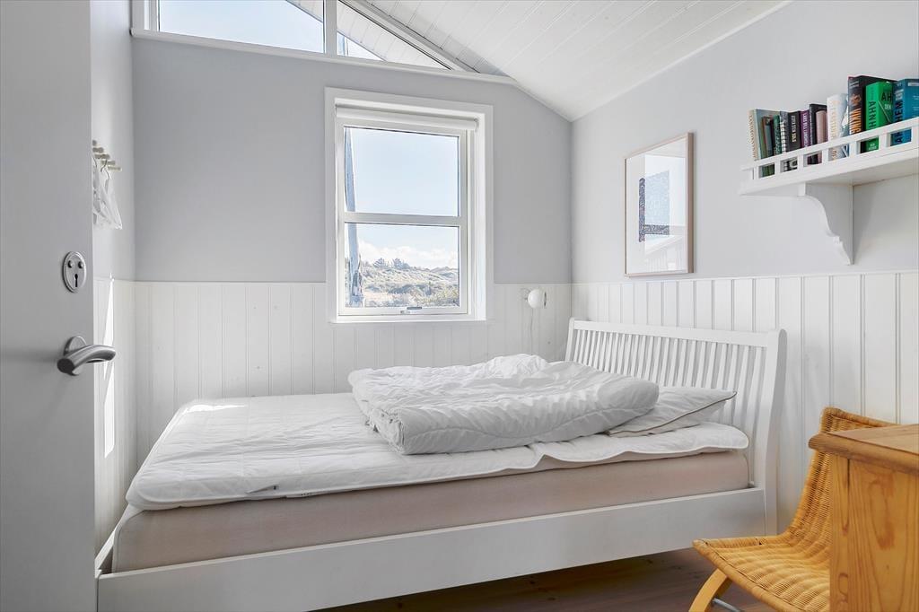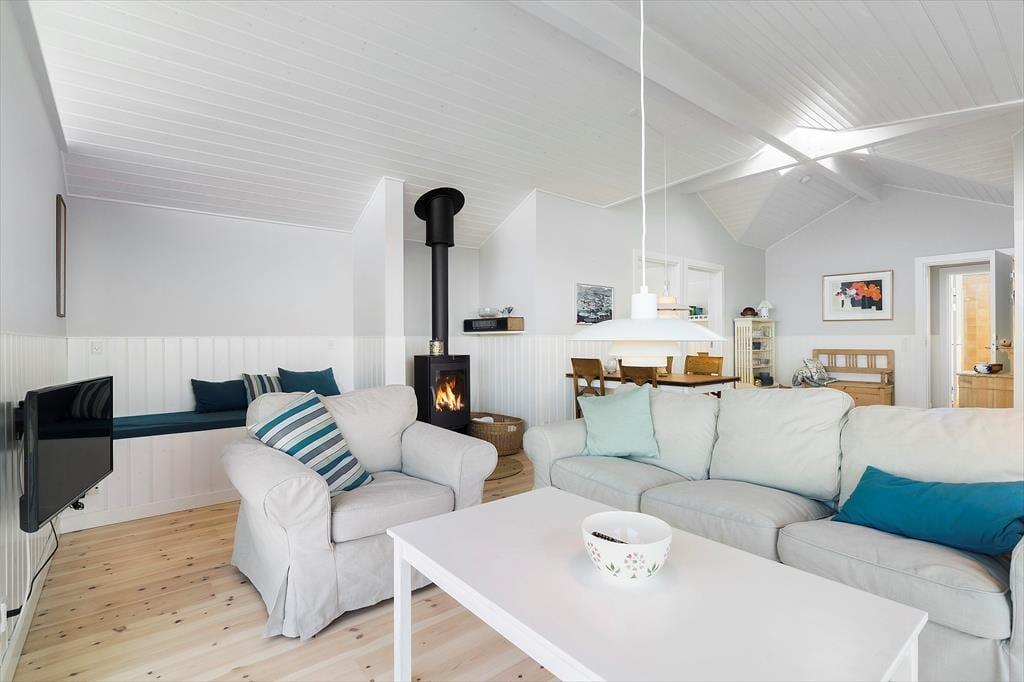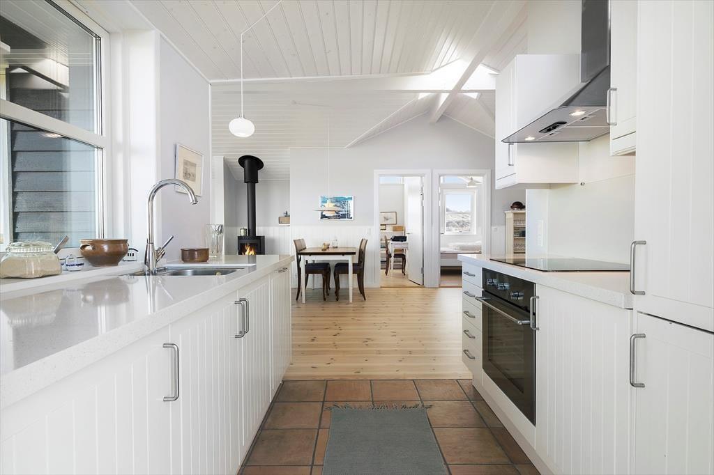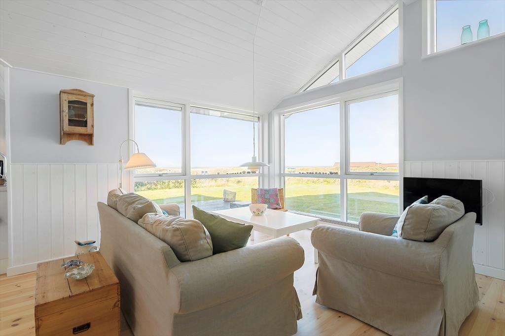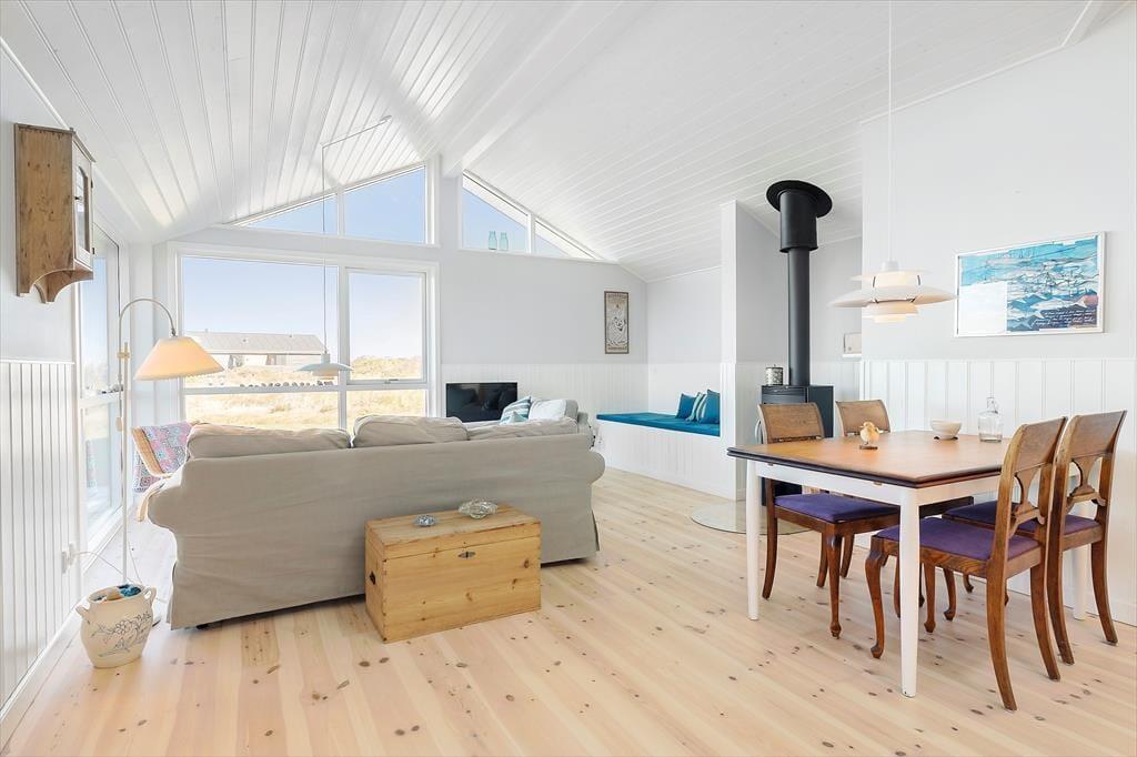 Det 100 m2 store sommerhus er opført i 2010 på ganske klassisk vis. En skøn atmosfære hviler i de velindrettede rum, der har loft til kip, høje træpaneler, pæne gulve og charmerende møblement. Farvetonerne er lyse, og de mange vinduer bidrager til rummenes luftige og lette fornemmelse – og så sørger de selvfølgelig også for, at I har god kontakt til Vesterhavet, når I slapper af inden døre nær brændeovnen. Køkken og stue ligger samlet som et stort og indbydende opholdsrum, og derudover består planløsningen af et bryggers, et badeværelse med gulvvarme og tre gode soveværelser med i alt seks sengepladser.