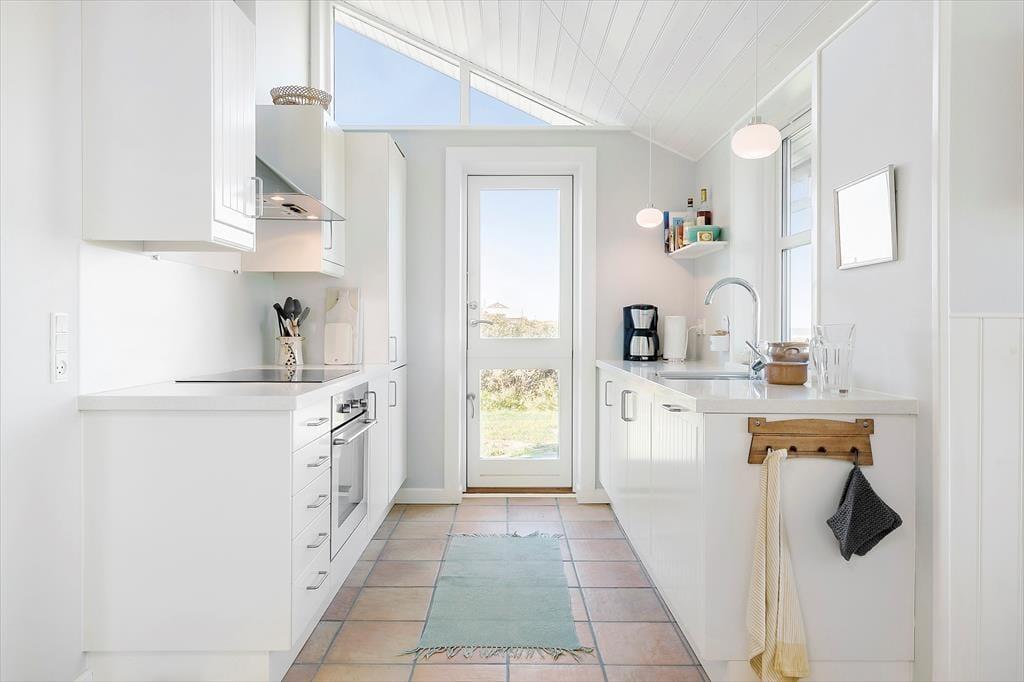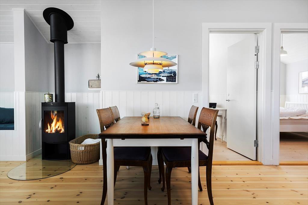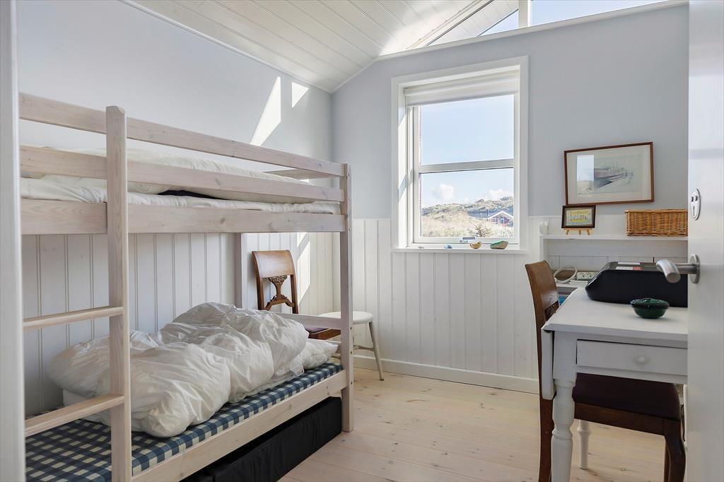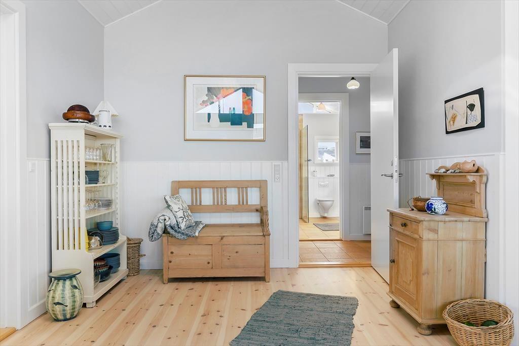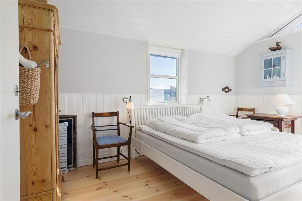 Det 100 m2 store sommerhus er opført i 2010 på ganske klassisk vis. En skøn atmosfære hviler i de velindrettede rum, der har loft til kip, høje træpaneler, pæne gulve og charmerende møblement. Farvetonerne er lyse, og de mange vinduer bidrager til rummenes luftige og lette fornemmelse – og så sørger de selvfølgelig også for, at I har god kontakt til Vesterhavet, når I slapper af inden døre nær brændeovnen. Køkken og stue ligger samlet som et stort og indbydende opholdsrum, og derudover består planløsningen af et bryggers, et badeværelse med gulvvarme og tre gode soveværelser med i alt seks sengepladser.