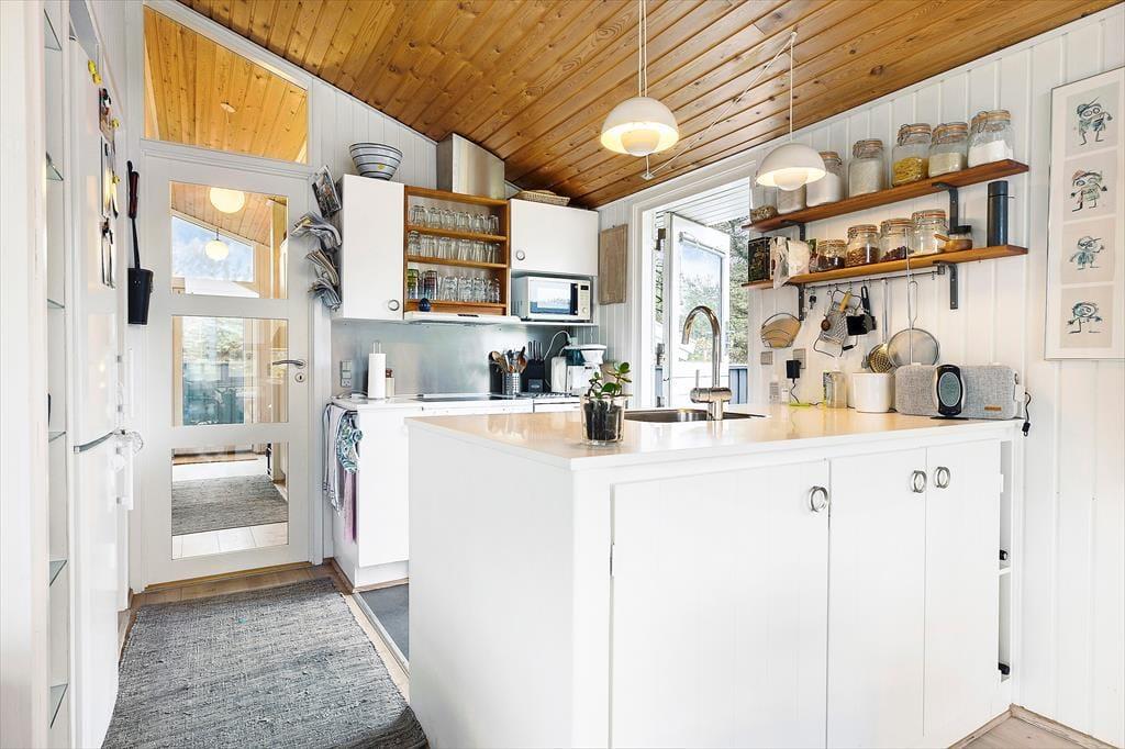 Sommerhuset er på 73 m2 og har en glimrende planløsning til fire personer med et badeværelse, to soveværelser og et hyggeligt opholdsrum. Der er dobbeltseng på begge soveværelser, hvoraf det ene er et ekstra stort rum med god skabsplads. I stuen finder I desuden en hyggelig alkove, som er perfekt i løbet af dagen, hvis I vil flade ud med en spændende krimi eller have en middagslur efter en god frokost. Dagens måltider kan I trylle frem i det åbne køkken og indtage ved spisebordet, og bagefter kan I sætte jer over i sofaafdelingen for at nyde varmen fra brændeovnen og den naturskønne udsigt gennem vinduet.