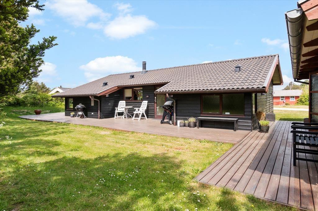 Når vejret er godt, fungerer den store terrasse som en herlig forlængelse af husets opholdsmiljø. Fra stuen kan I smutte lige ud i solen og slå jer ned i liggestolene eller ved havebordet – og hvis madlavningen også skal foregå herude, er der både gas- og kulgrill til rådighed. Terrassen er stor, så I kan sætte jer lige der, hvor solforholdene er bedst, og ellers har I masser af plads til at lege og slænge jer på grundens store græsplæne.