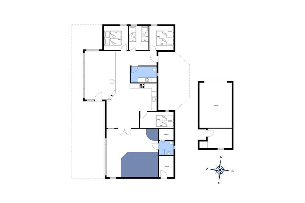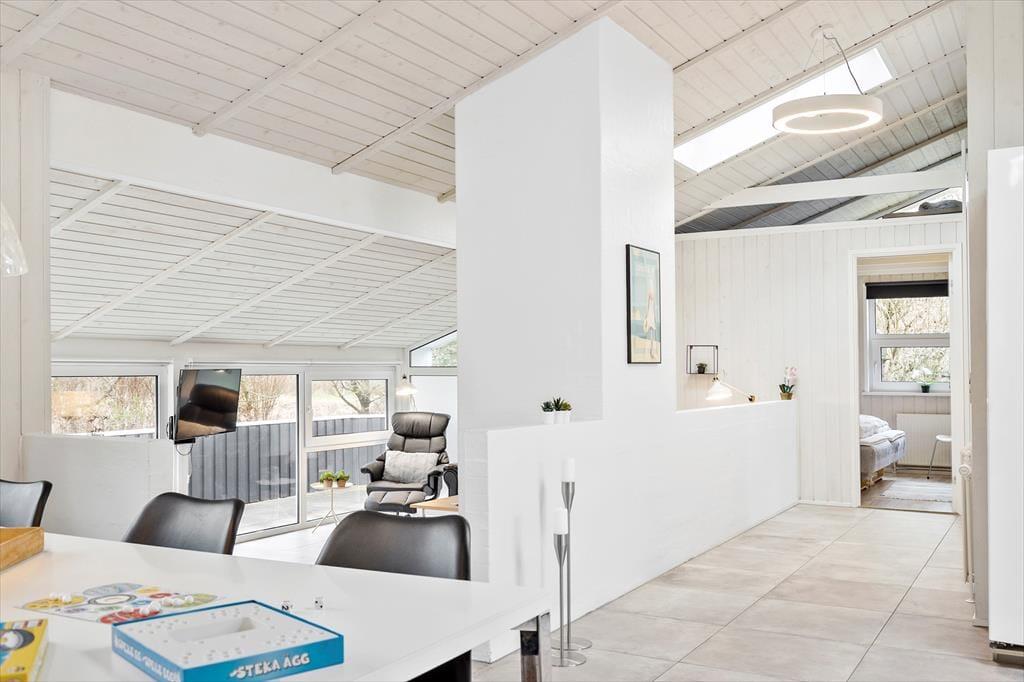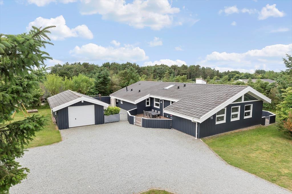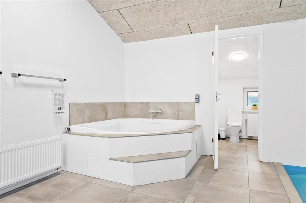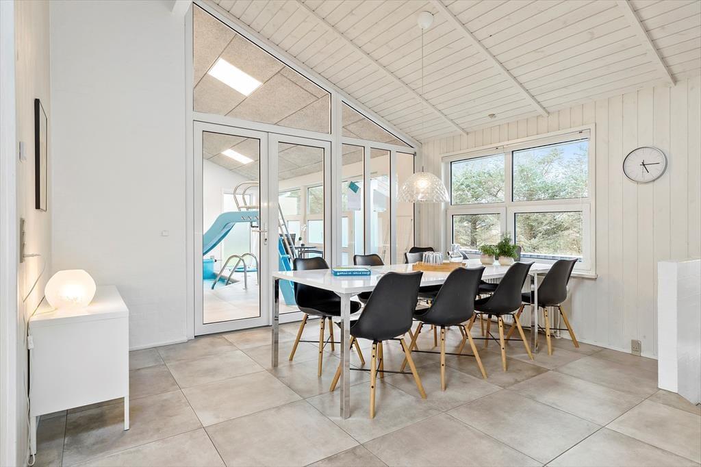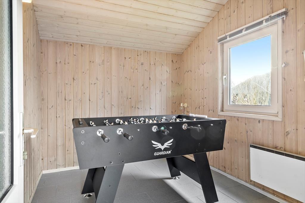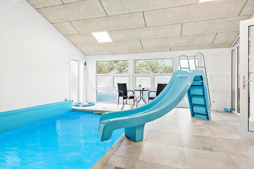 Det 152 m2 store sommerhus kan oplagt bruges af to børnefamilier, for der er fire soveværelser at gøre godt med plus en hems med ekstra madrasser. Badeværelser er der to af, hvoraf den ene ligger som del af poolafdelingen. Her er der for øvrigt både sauna og spabad, når I trænger til en rolig pause i varmen, mens der er lagt op til mange timers sjov i swimmingpoolen og på vandrutsjebanen. Poolen har et smart system, der automatisk holder klor niveauet på et behageligt lavt niveau, så vandet altid er friskt og indbydende. Derudover bliver poolen opvarmet af en energivenlig varmepumpe, så du kan nyde en dejlig temperatur i vandet hele året rundt. Udover det har poolen også et modstrømsanlæg, så du kan svømme mod strømmen, hvis du har lyst til en ekstra udfordring eller bare vil have lidt mere bevægelse i vandet. Er det ved at være spisetid, har I gode arbejdsforhold i det lækre køkken, der ligger som del af en lys og velindrettet opholdsafdeling. Et stort spisebord er placeret i samme niveau som køkkenet, og går I et par trin ned, kommer I til opholdsstuen, der har indbygningspejs, fladskærms-tv og komfortable siddemøbler. Som en skøn tilføjelse finder I et anneks i forlængelse af garagen, og her kan legebørn i alle aldre hygge sig med et slag bordfodbold.