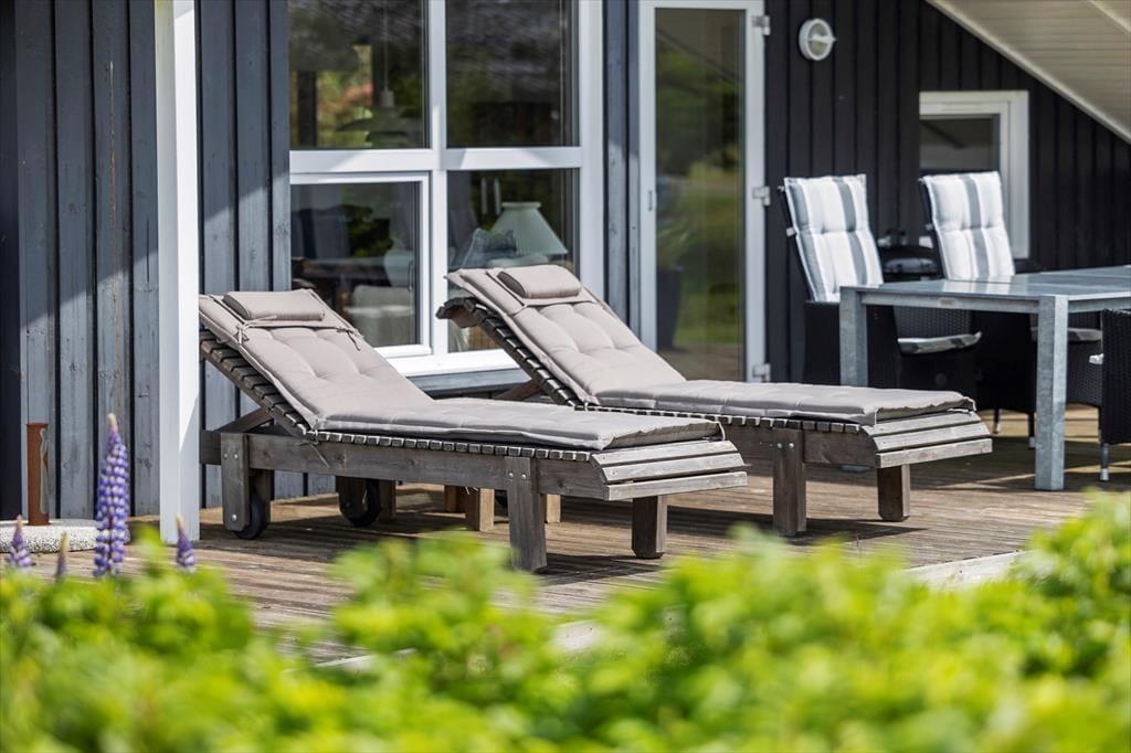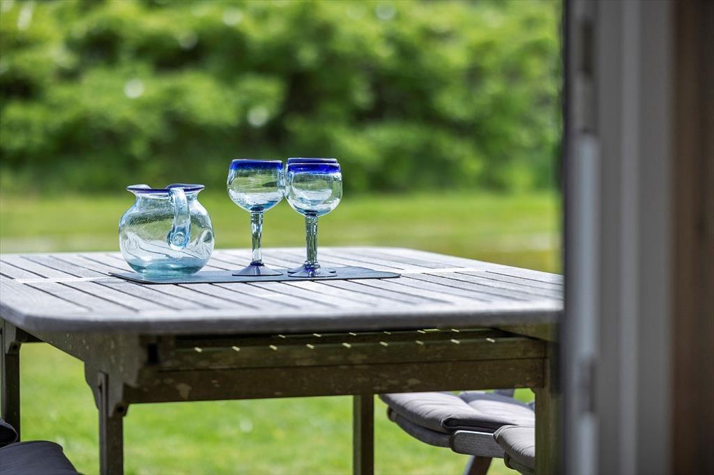 Terrassen, der ligger øst for sommerhuset, og den kan hurtigt blive en favoritplads, hvis I gerne vil drikke kaffe i dagens første solstråler. Senere kan I rykke over på den sydvestvendte terrasse, der har en dejlig udsigt og tilmed er delvist overdækket, så den gør sig godt som opholdsplads om aftenen – med mindre I hellere vil rykke sammen om bålstedet for at riste skumfiduser i mørket.