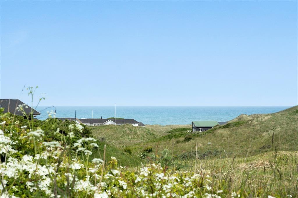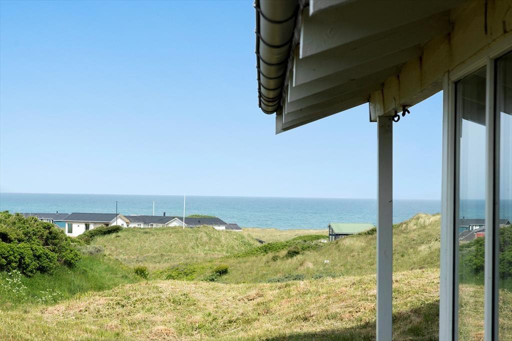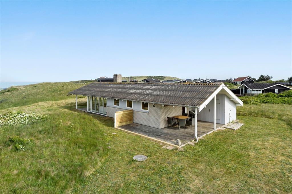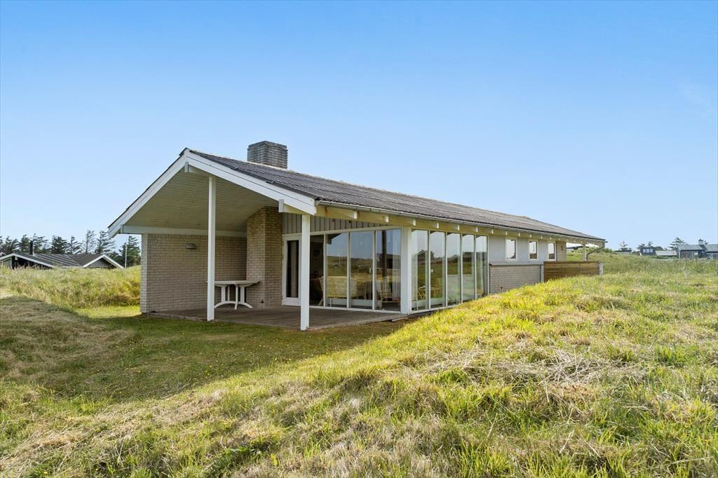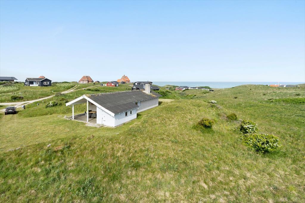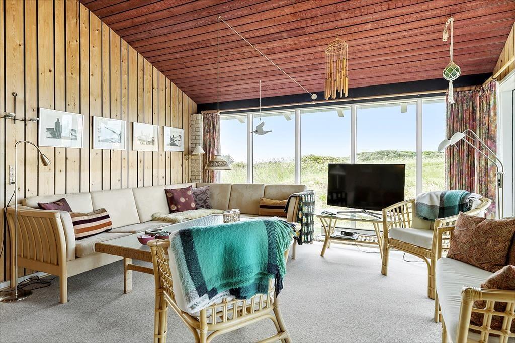Sommerhuset har stået her i det kuperede kystlandskab lige siden 1971, og det har fået lov til at beholde mange originale detaljer, lige fra det klassiske forrammekøkken og de blå vægfliser i brusebadeværelset til det rustikke trælisteloft, der er ført op til kip. Udsigten har selvfølgelig ændret sig en smule i takt med, at sommerhusene er skudt op i området – men kigget ud over klitterne og Vesterhavet er fortsat lige så betagende. Det giver altså ro i sindet at holde ferie med sådan en udsigt fra stuen! Den hyggelige stue har brændeovn og direkte adgang til terrassen, og ved entréen ligger tre soveværelser side om side.