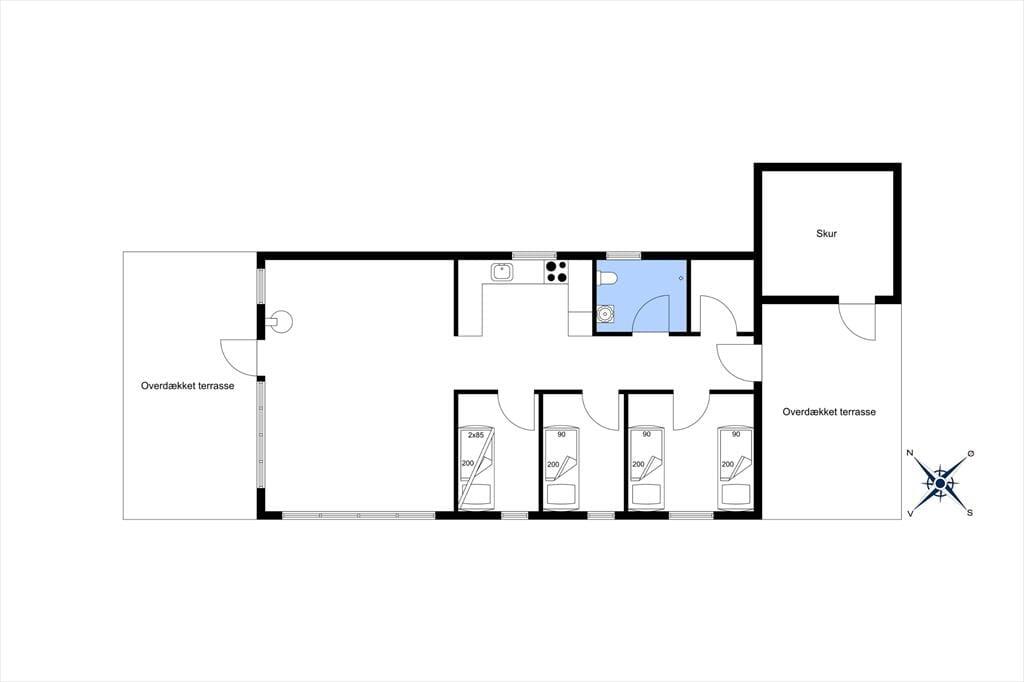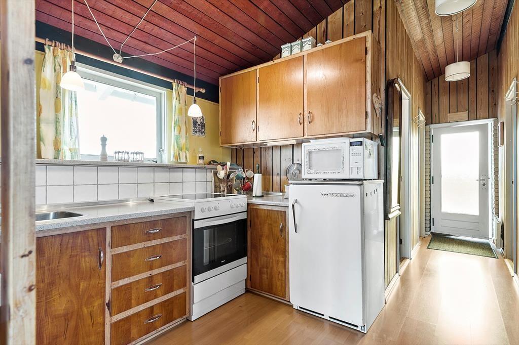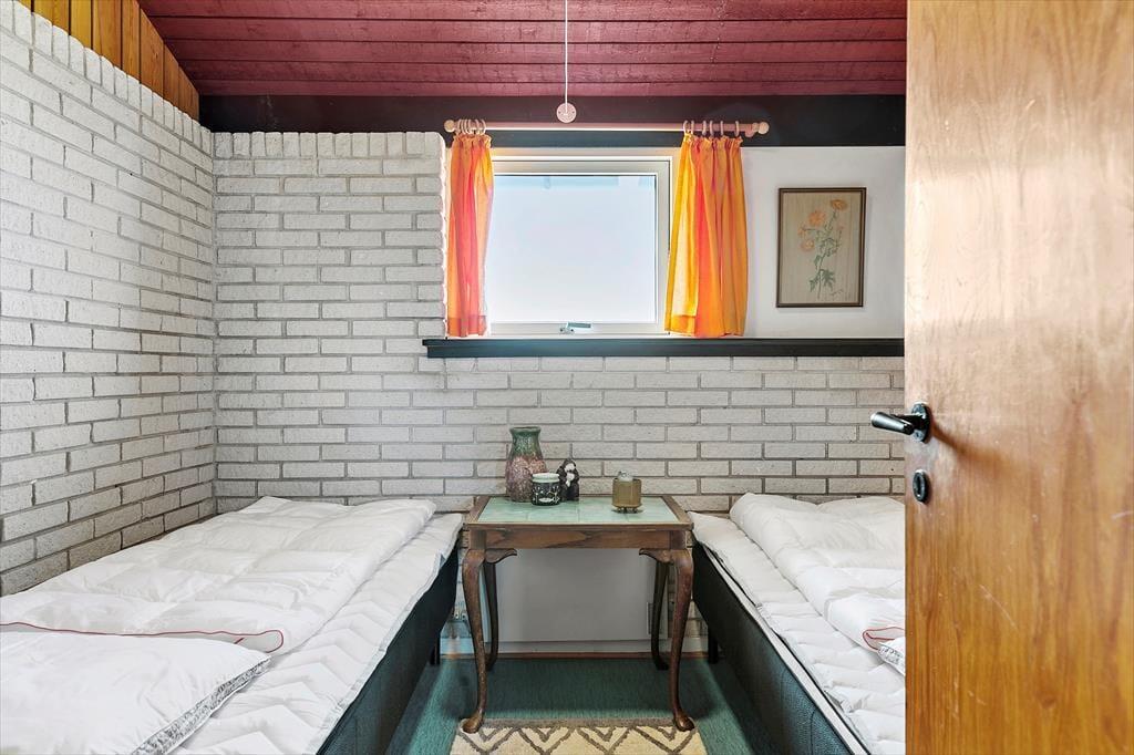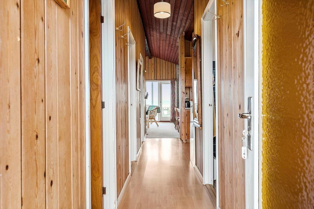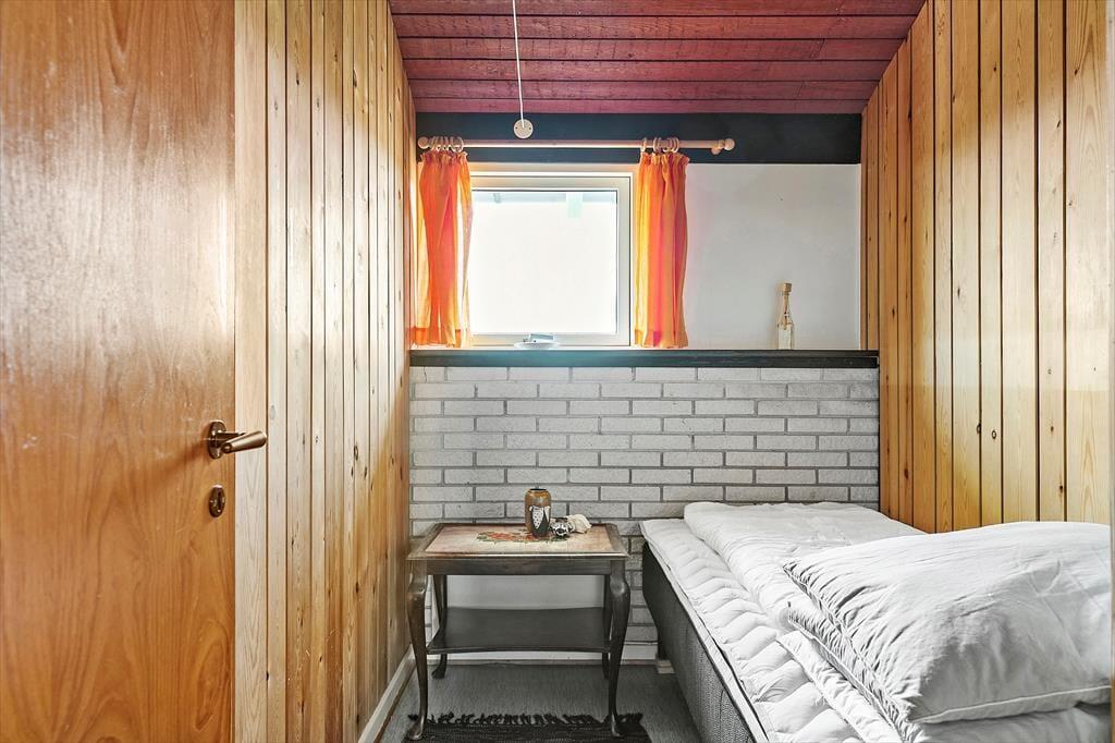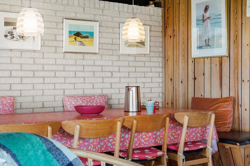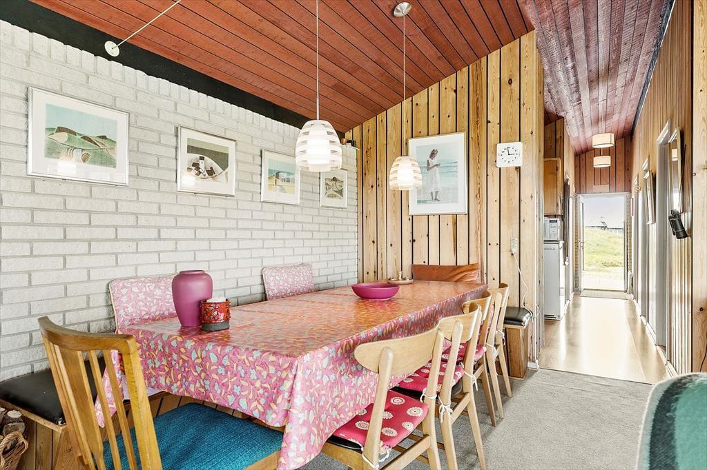 Sommerhuset har stået her i det kuperede kystlandskab lige siden 1971, og det har fået lov til at beholde mange originale detaljer, lige fra det klassiske forrammekøkken og de blå vægfliser i brusebadeværelset til det rustikke trælisteloft, der er ført op til kip. Udsigten har selvfølgelig ændret sig en smule i takt med, at sommerhusene er skudt op i området – men kigget ud over klitterne og Vesterhavet er fortsat lige så betagende. Det giver altså ro i sindet at holde ferie med sådan en udsigt fra stuen! Den hyggelige stue har brændeovn og direkte adgang til terrassen, og ved entréen ligger tre soveværelser side om side.