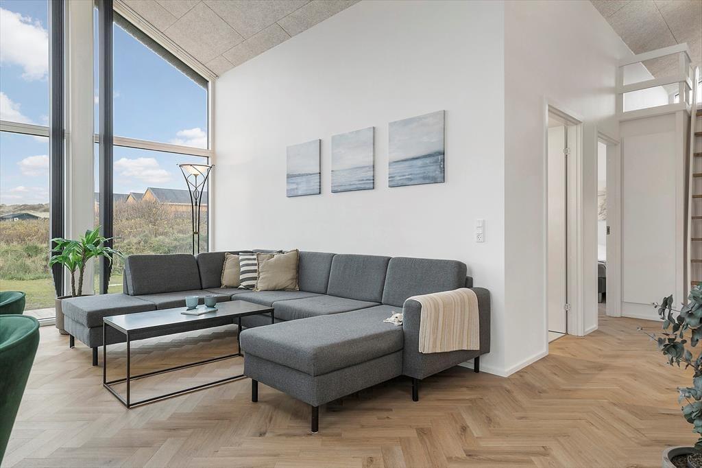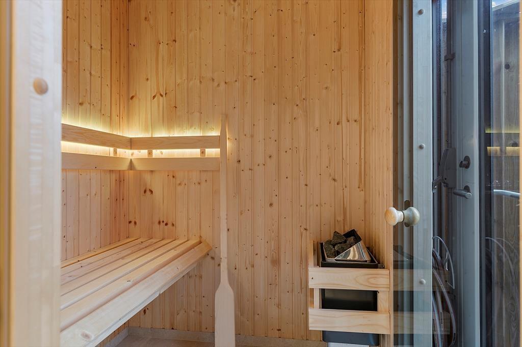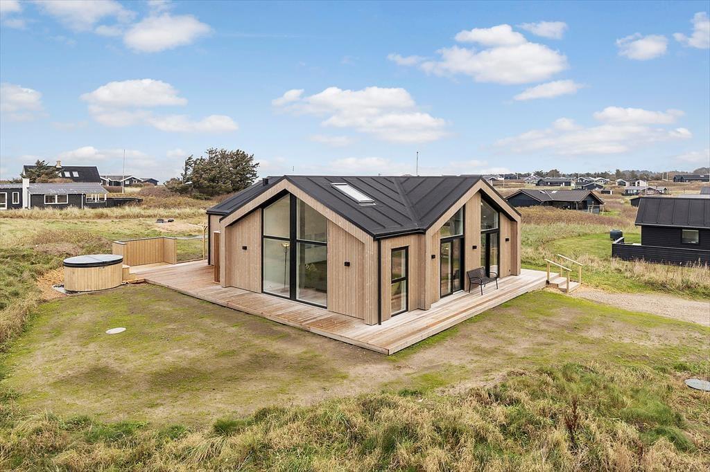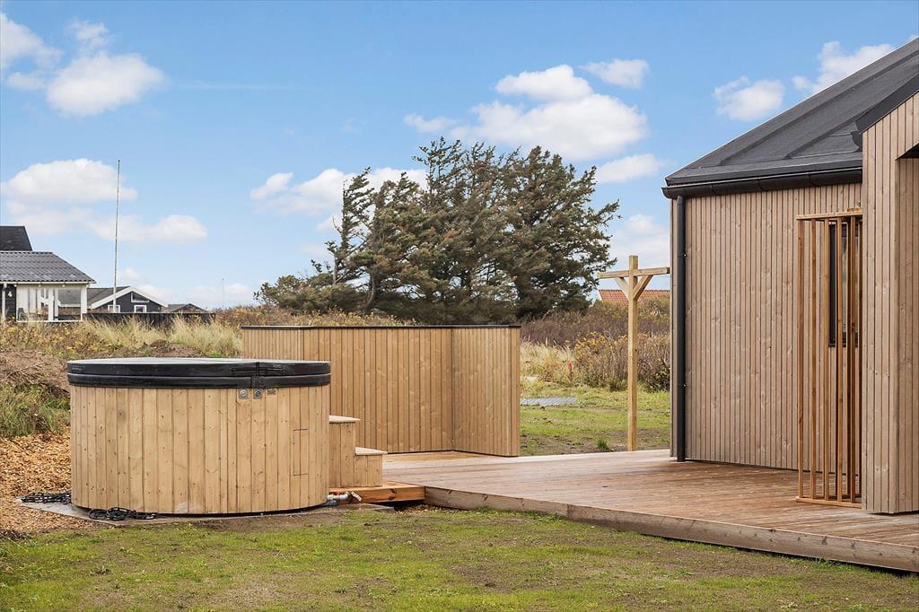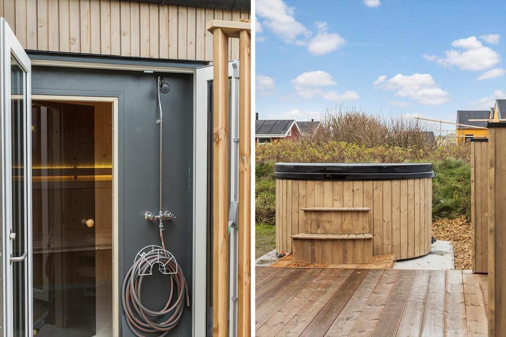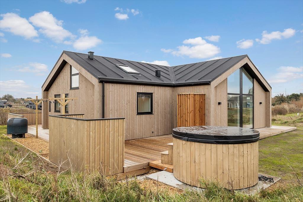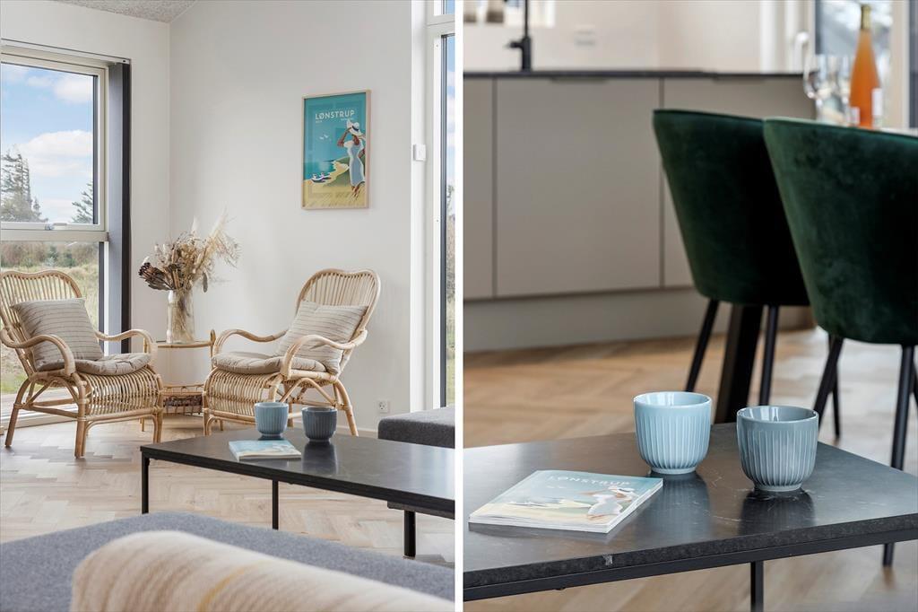 Uanset om vejret indbyder mest til indendørs hygge eller udendørs afslapning i solen, får I en fantastisk ramme om ferien i dette nybyggede og stilfuldt indrettede sommerhus i Lønstrup. Selv på en lidt kølig dag kan I for øvrigt nyde livet ude i det fri, for terrassemiljøet byder på en skøn wellnessafdeling med både vildmarksbad og sauna.