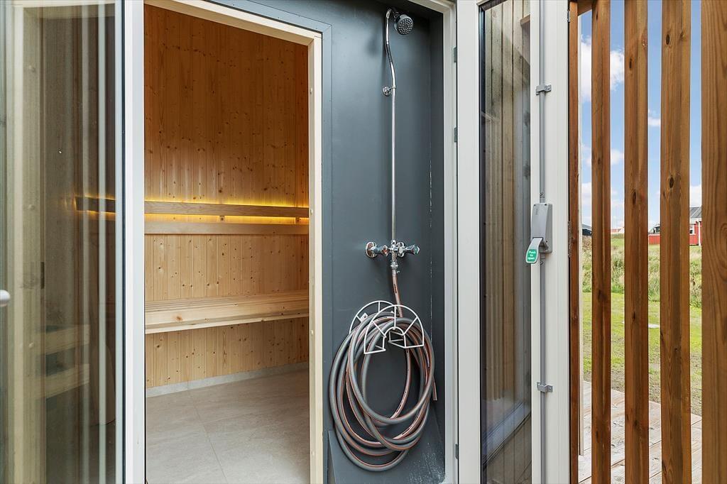 Den førnævnte sauna har dør ud til en afskærmet niche med udendørsbruser, og herfra kan I fortsætte videre ud til vildmarksbadet. Det er vidunderligt at kunne fylde ferierne med udendørs wellness – ikke mindst på de stjerneklare aftener, hvor det kan føles helt magisk med et varmt bad i det fri. Sommerhusets smukke terrassemiljø inviterer også til mange gode stunder, hvis I vil grille eller bare slappe af i en havestol under parasollen.