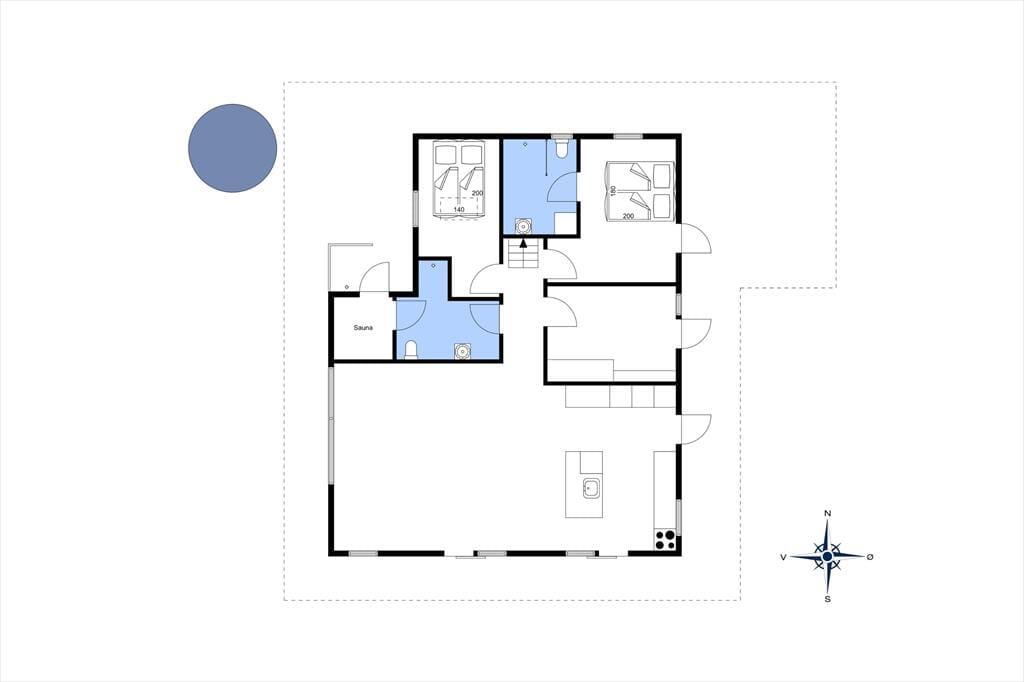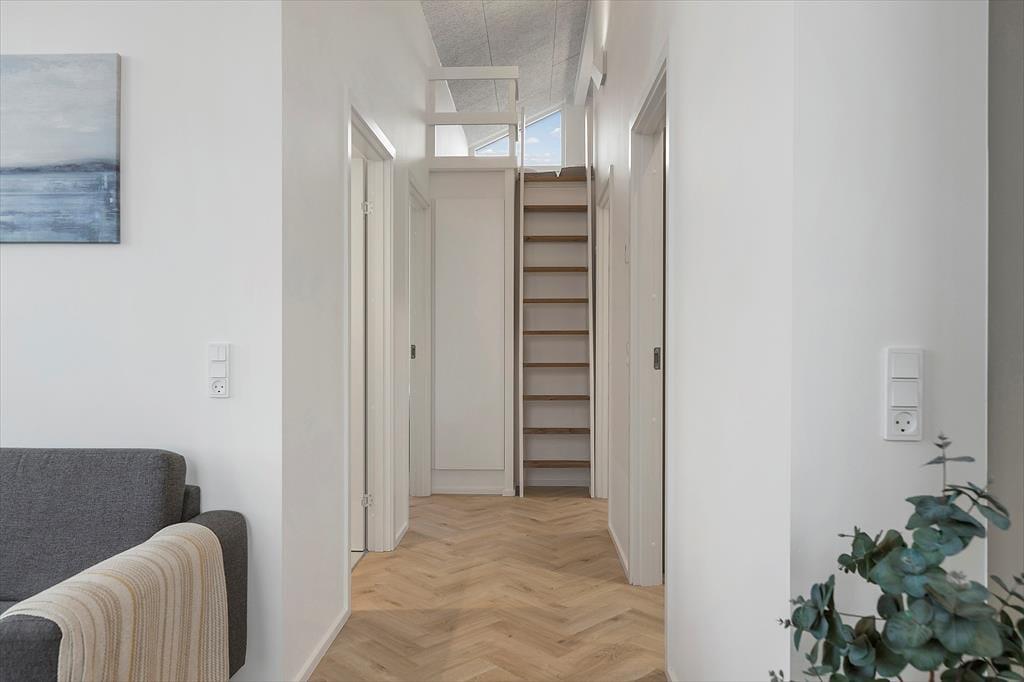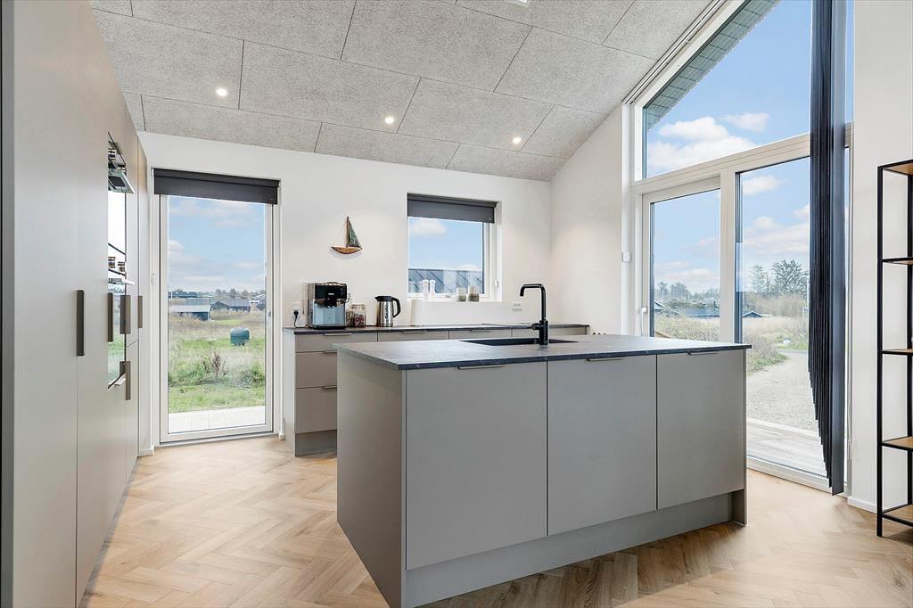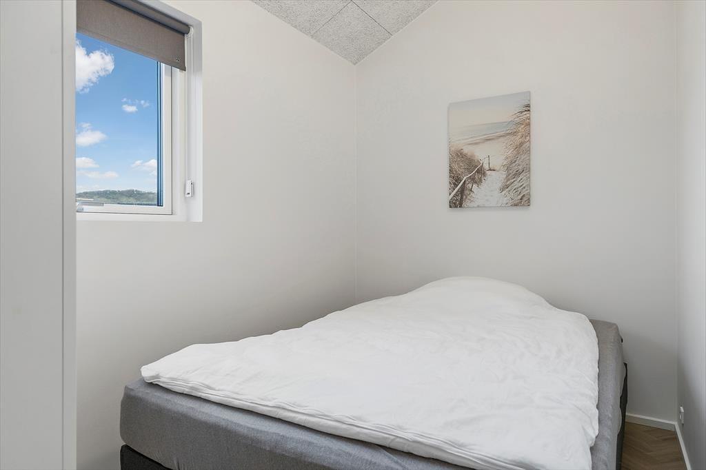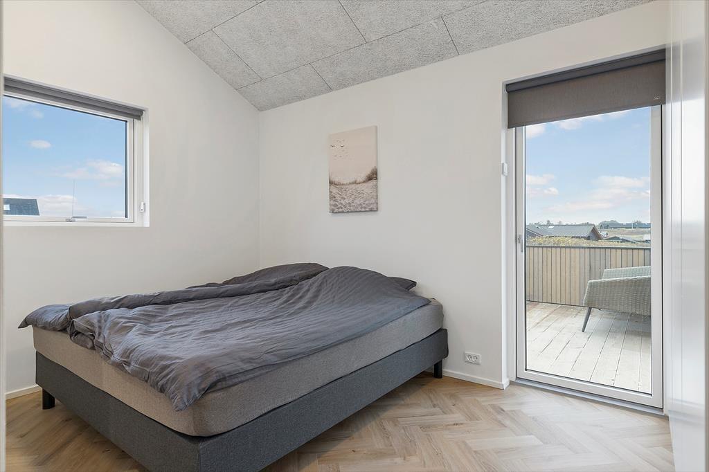 Sommerhuset er et elegant byggeri med træfacade og store vinduesparti, og det er blevet opført i 2023. Ikke bare udefra, men også inden døre er huset en fryd for øjnene. Der er nemlig kønt sildebensparket på gulvet, loft til kip og lækkert møblement, som sørger for, at I får det særdeles behageligt. En rummelig entré giver jer adgang til opholdsafdelingen, hvor stue og køkken ligger i åben forbindelse. I køkkenet har I gode arbejdsforhold, når der skal kokkereres, og hvis I vil se film eller serier, er der et stort fladskærms-tv med Chromecast nær sofaarrangementet. Sommerhusets to dejlige soveværelser og en hyggelig hems byder på sengepladser til i alt seks personer, og endelig er der to badeværelser, hvoraf det ene er med vaskesøjle og det andet med sauna.