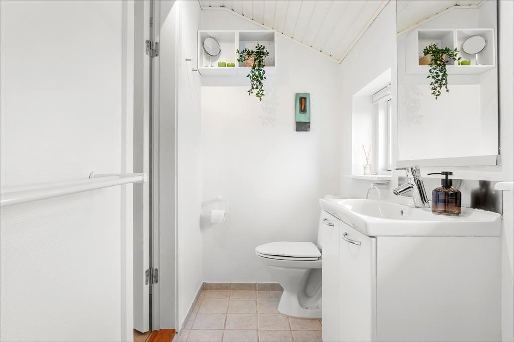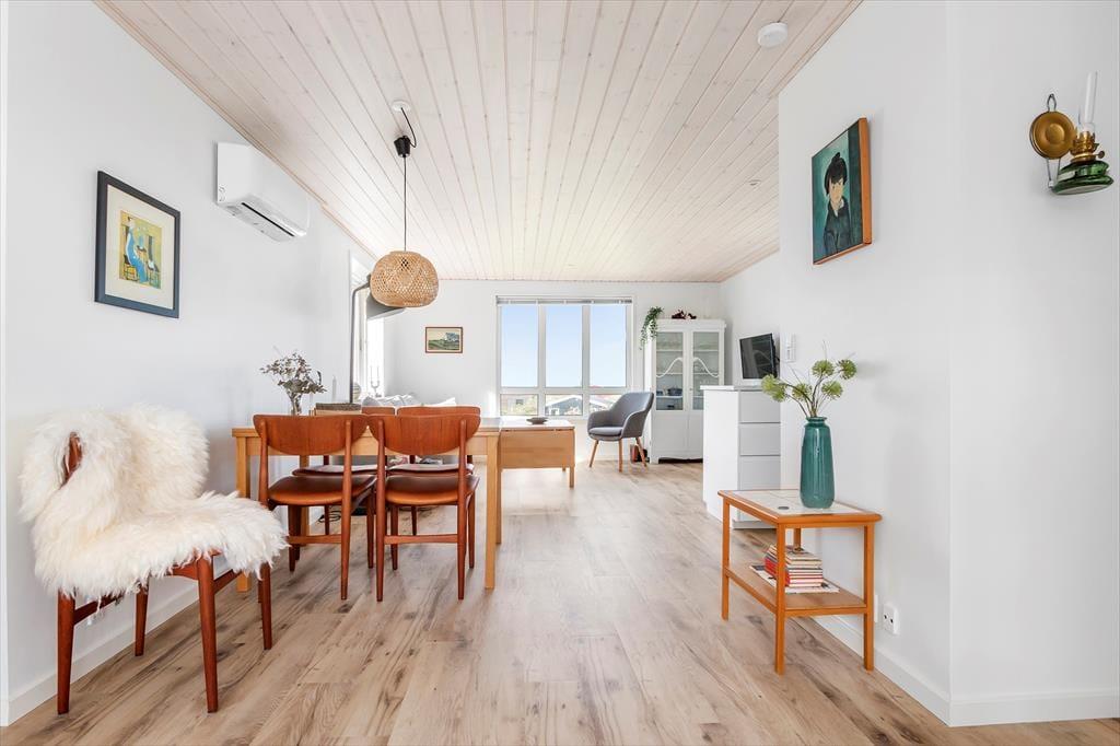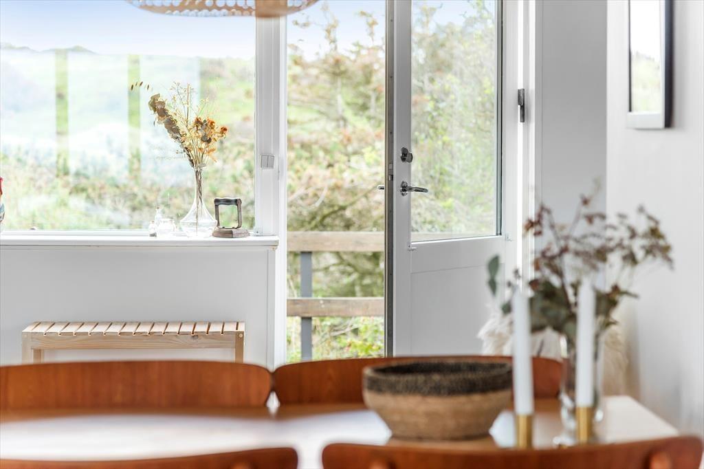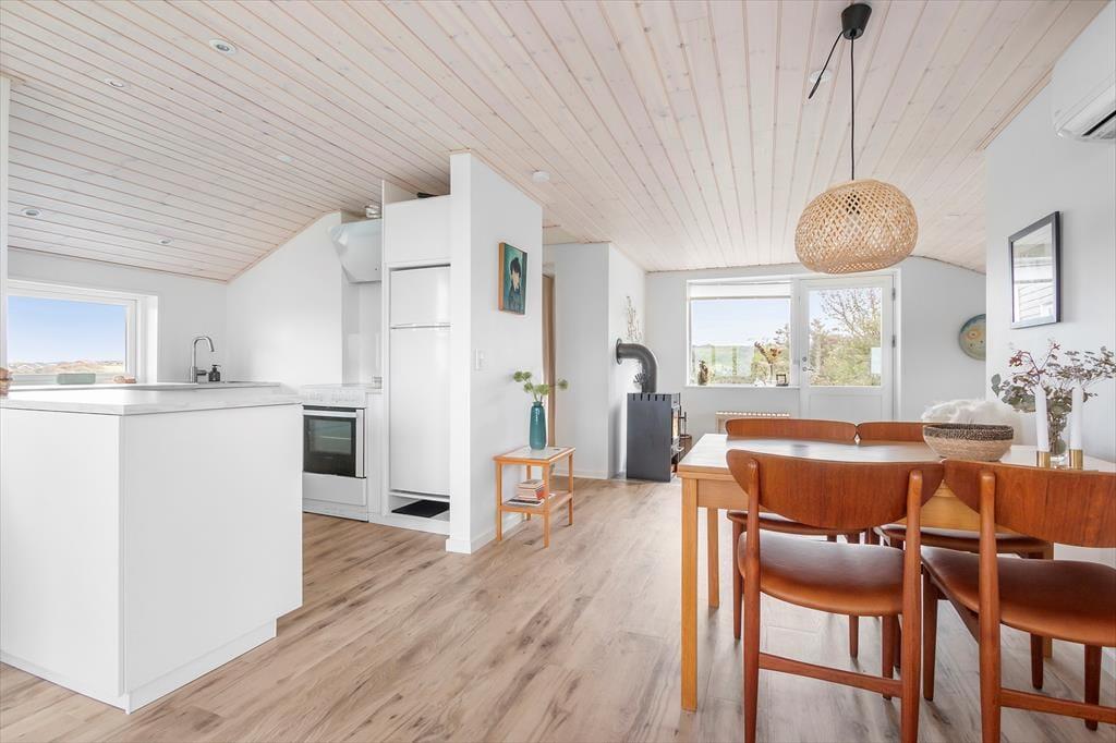 Med sin åbne planløsning og pæne stand efter seneste renovering i 2023 passer sommerhuset perfekt til to personer, der drømmer om at slappe af i lyse og velfungerende rammer. Huset ligger på en lille bakketop, så I har godt udsyn over det kuperede landskab og får samtidig glæde af det særlige lys, der præger kyststrækningen. Planløsningen byder på et godt soveværelse med dobbeltseng og direkte udgang til terrassen. Et badeværelse med bruseniche og et moderne indrettet køkken er der også inden døre – og netop køkkenet er integreret med stuen, så I kan hyggesnakke, selvom det kun er den ene af jer, der er i gang med at kræse om maden. Der er både brændeovn og varmepumpe i opholdsafdelingen, og den ene sofa er for øvrigt en sovesofa.