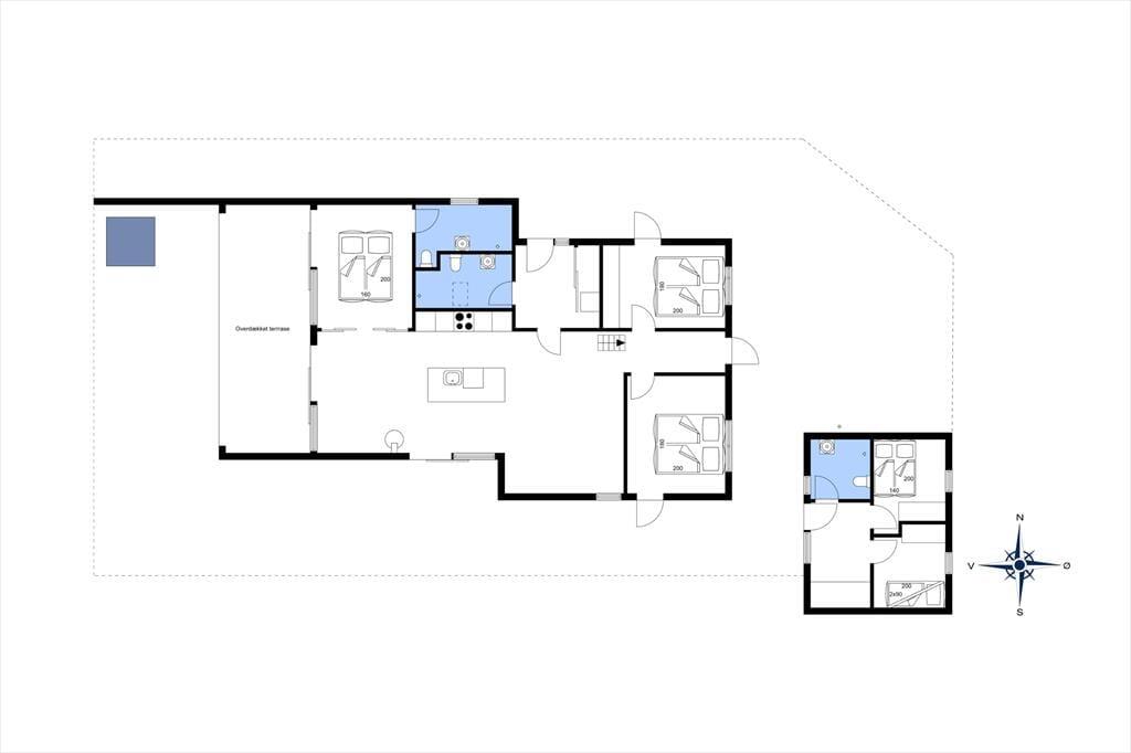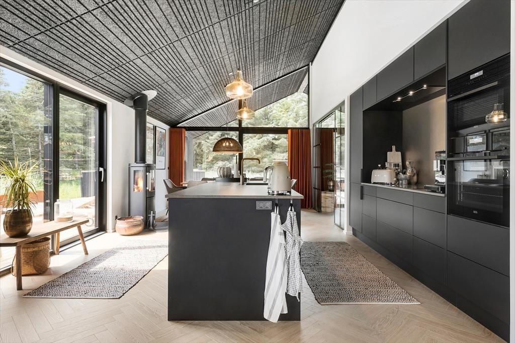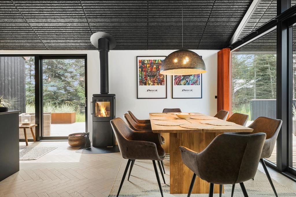 Sommerhuset og det tilhørende anneks har et stilfuldt ydre med en sort træfacade, der brydes af store vinduespartier og naturfarvede lamelvægge. Inden døre giver de hvidmalede vægge en flot kontrast til de sorte akustiklofter, der går helt til kip, mens sildebensparket danner et elegant underlag i opholdsafdelingen og på soveværelserne. Tre soveværelser med dobbeltseng og to brusebadeværelser hører med til planløsningen i selve hovedhuset, mens annekset har to soveværelser, eget badeværelse og et lille opholdsrum med ekstra sovesofa. Alle rum fremstår yderst velindrettede og har en skøn atmosfære – men mon ikke, I mest af alt har lyst til at opholde jer i hovedhusets opholdsafdeling, når I vil slappe af og hygge jer sammen? Her bliver I forkælet med et veludstyret og lækkert køkken, et flot spisebord nær brændeovnen, en god hems og et skønt flyderhjørne med en stor hjørnesofa.