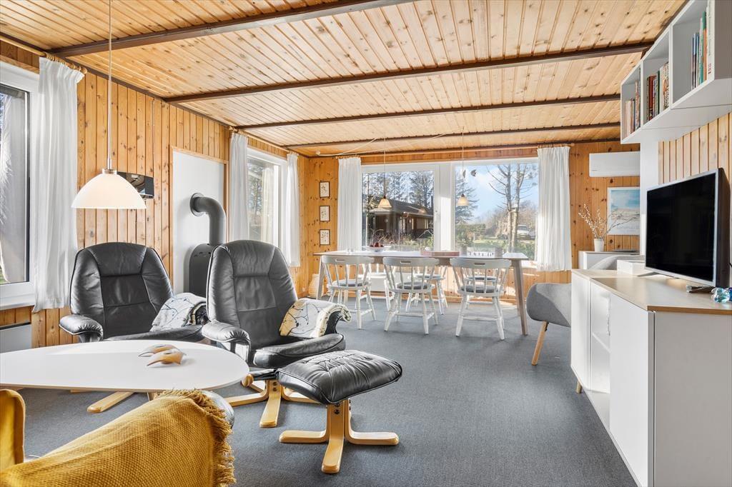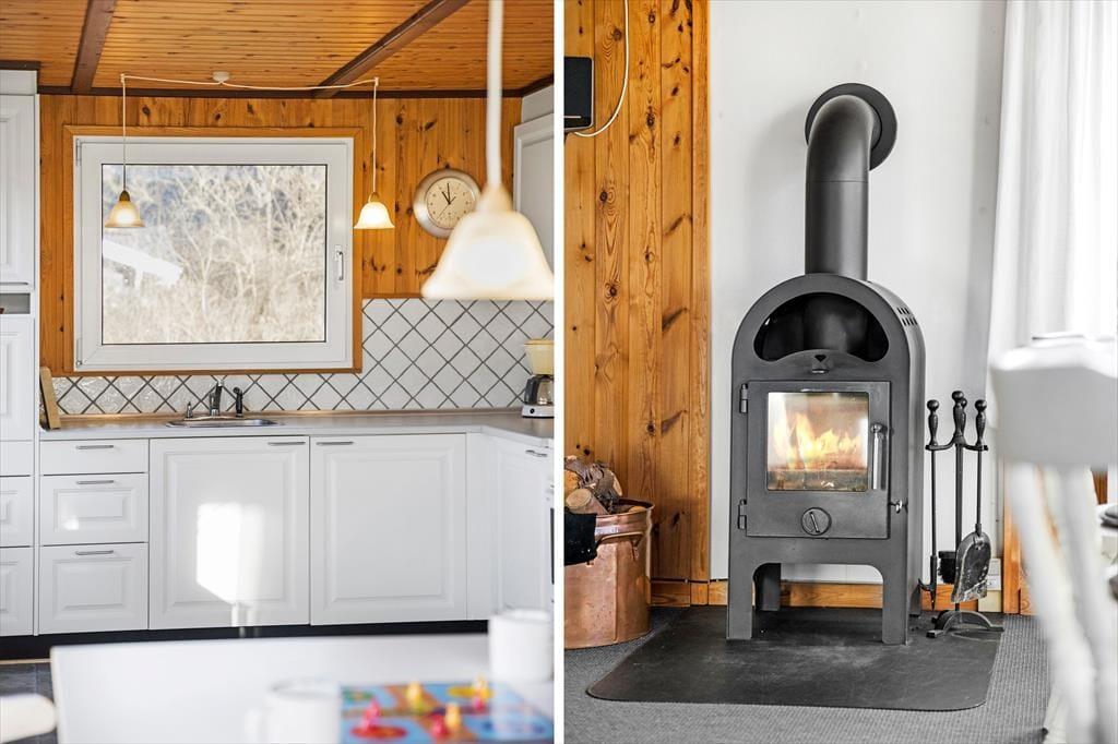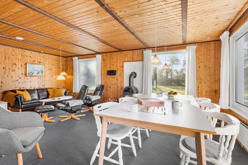 Den gode sommerhusstemning bliver slået an lige fra start, for med træbeklædning på væggene og komfortabelt møblement har alle rum en varm og venlig atmosfære. Vinduerne sørger for et godt lysindfald, og stuens temperatur kan du hurtigt skrue op for takket være brændeovnen og varmepumpen. Hvis det slet ikke er koldt, men lunt udenfor, er der en dør ud til terrassen lige ved køkkenet, så du kan invitere frisk luft og sommerdufte ind i opholdsrummet. Køkkenet er for øvrigt af nyere dato, så du har en dejlig arbejdsstation, når du vil lave frokost eller blot brygge kaffe til eftermiddagens brætspil.