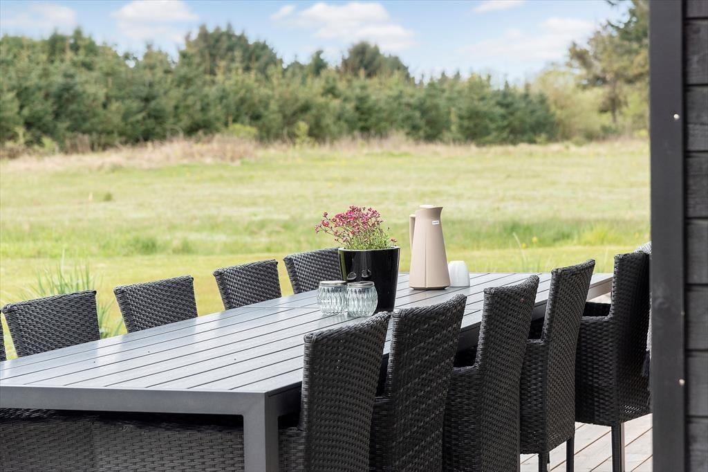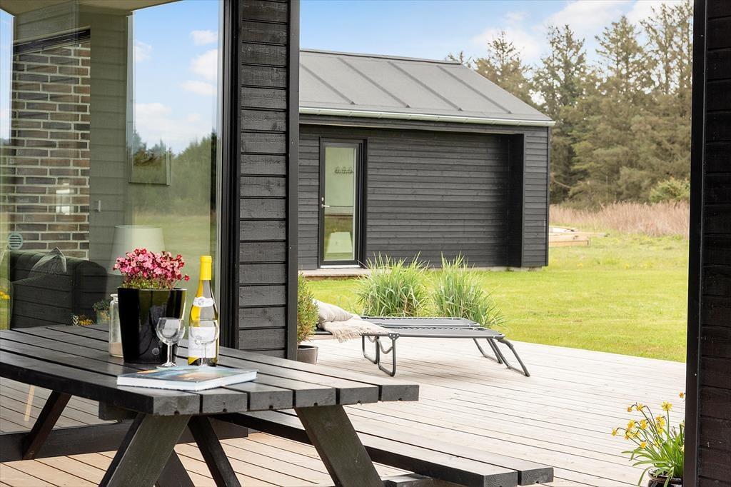 Sommerhuset ligger meget fredfyldt og ugeneret på en 1843 m2 stor naturgrund. Der er langt til de omgivende huse, så du kan virkelig få oplevelsen af at være ude i den fri natur. Fra opholdsrummet er der flere udgange til terrassemiljøet, der breder sig rundt om huset, og det er et skønt sted at være, hvis du trænger til at slappe af i en liggestol med en god krimi og bare nyde freden og roen. Der er også god plads til at dække op til hyggelige måltider under åben himmel – og en del af terrassen er overdækket, så du kan endda nyde udelivet, hvis sommerregnen skulle falde. Den store grund byder også på en dejligt plan græsplæne til leg og boldspil for familiens yngste.