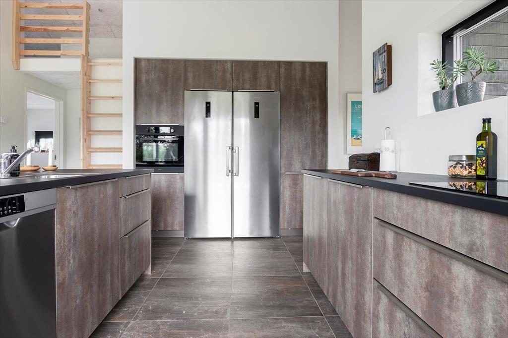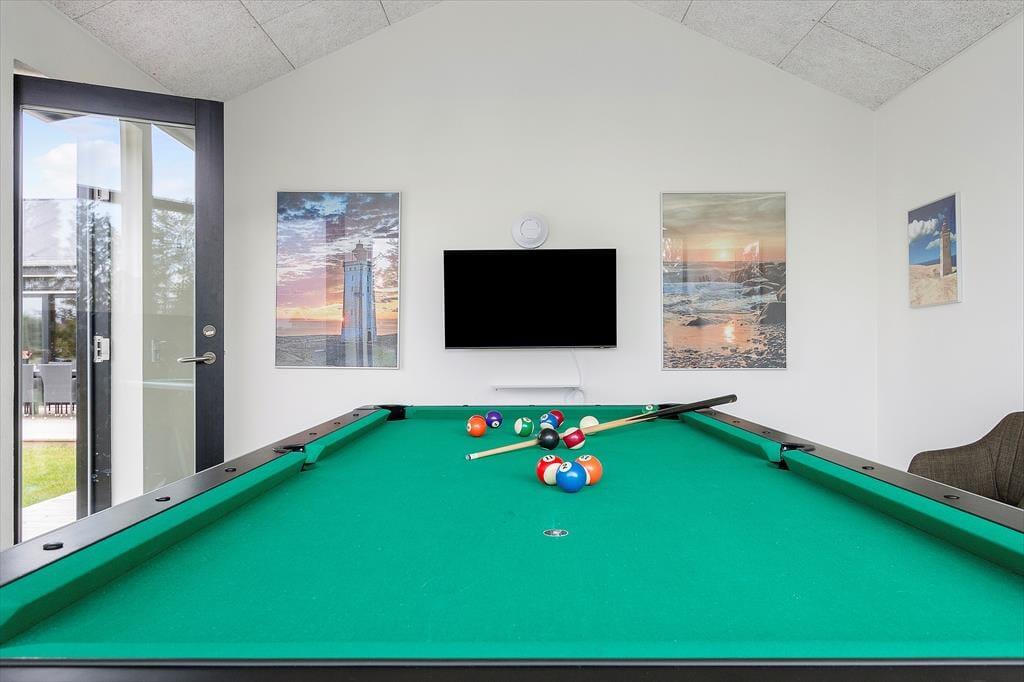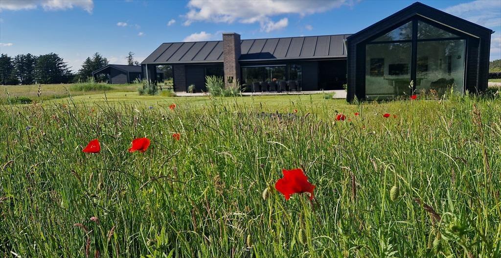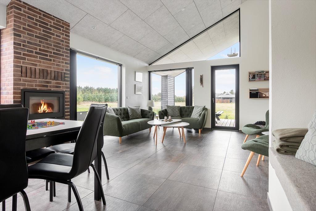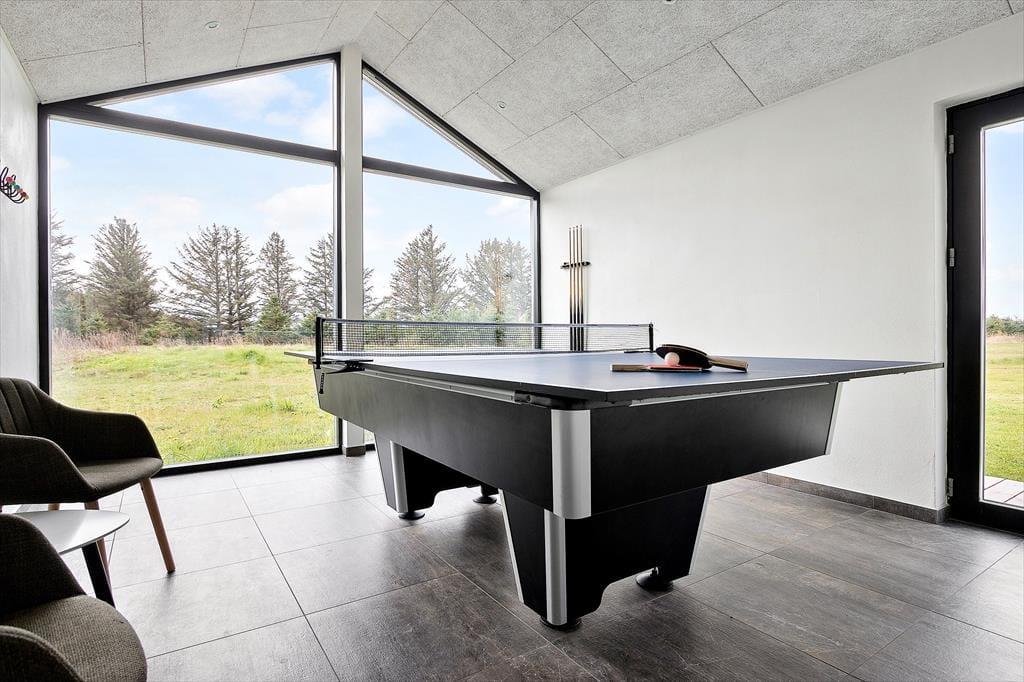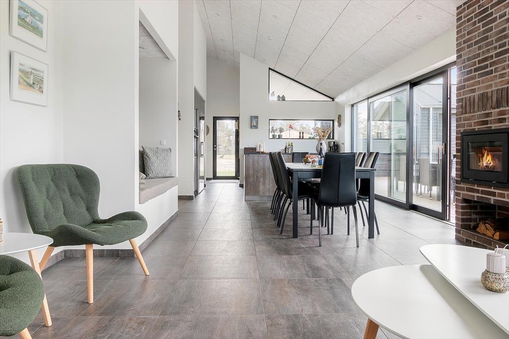 Huset er opført i 2023 og tager sig meget præsentabelt ud med sin stilsikre arkitektur, der sætter en elegant og eksklusiv ramme om ferieturen. Indenfor bliver du mødt af store, lyse rum, og der er en skøn atmosfære i hele huset – her er der virkelig kræset for detaljerne. I opholdsrummet er der loft til kip, som sammen med de store vinduespartier bidrager til oplevelsen af lys og luft. Det lækkert udstyrede køkken ligger i åben forbindelse med opholdsmiljøet, hvor de fælles måltider kan serveres ved langbordet. Der er også brændeovn og sofahjørne til indendørs hyggestunder efter aftensmaden. Huset indeholder derudover et aktivitetsrum, hvis du vil dyste med de andre i både pool og bordtennis. Endelig skal det nævnes, at huset har fire soveværelser og to badeværelser. Bemærk desuden, at der er luft til vand-varmepumpe, og at huset er billigt i forbrug.