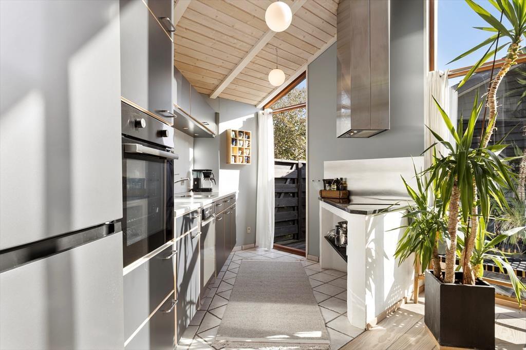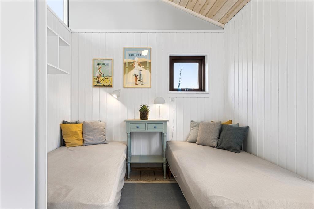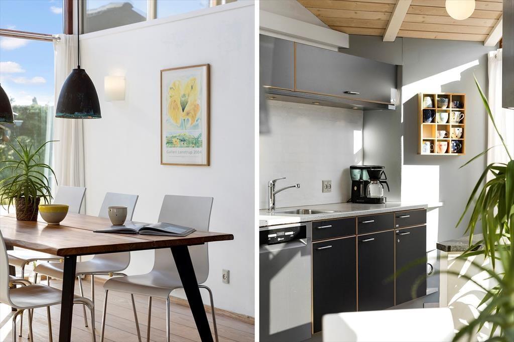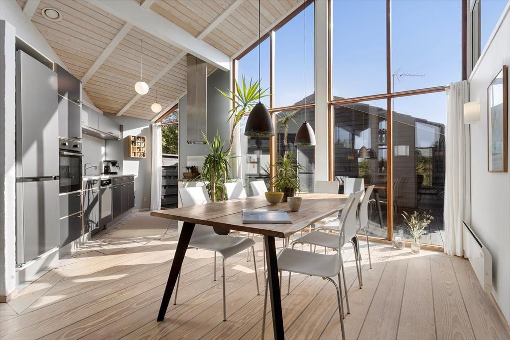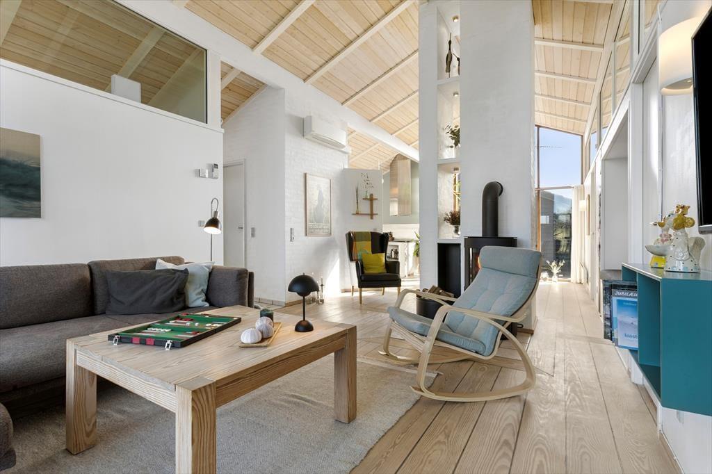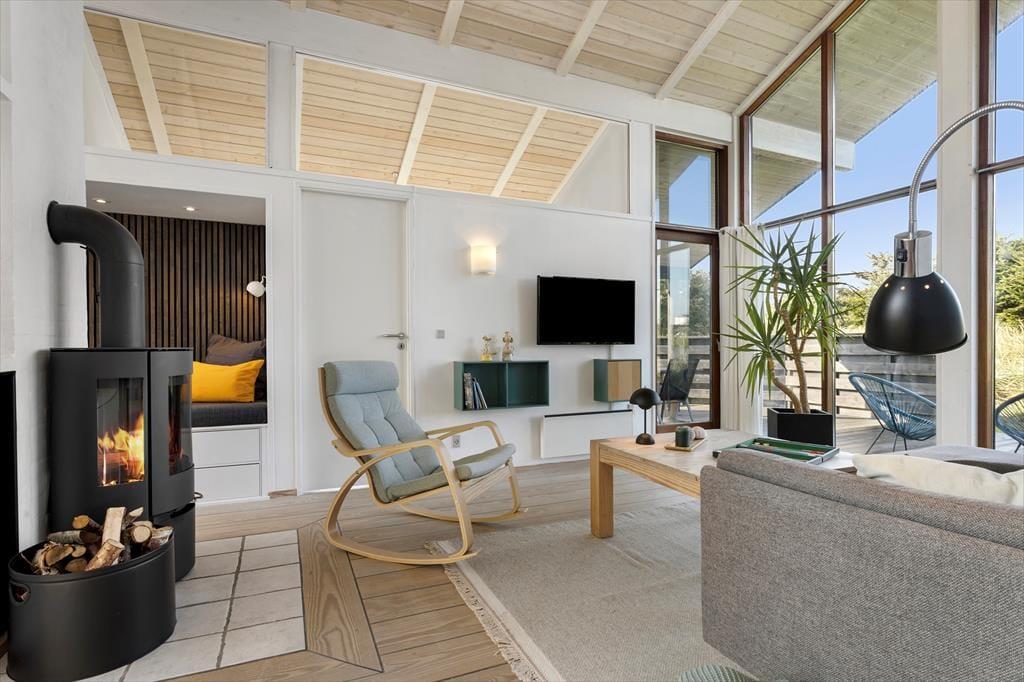 Med store vinduer, loft til kip og lyse farvetoner er der en herlig atmosfære inden døre, og du kan hurtigt føle dig hjemme i de velindrettede rum. For eksempel er det herligt at kunne slænge sig i stuens sofaafdeling, når der er ild i brændeovnen og varm kaffe i koppen – hvis det altså ikke er badeværelsets spabad og sauna, der sørger for at få dig helt ned i tempo. Det åbne køkken er en god arbejdsstation, og her kan I sagtens være flere om at stå for madlavningen, mens spisebordet er det helt rette sted at mødes, når måltidet står klar. Soveværelser er der tre af, så det er muligt at være op til seks personer, der nyder ferien sammen.