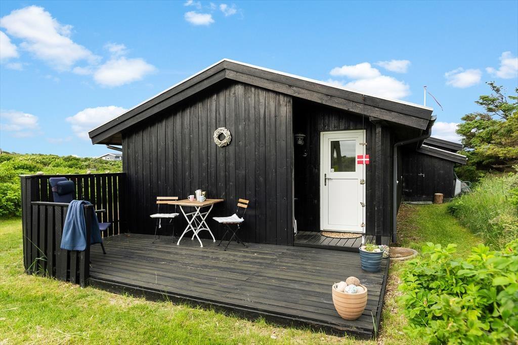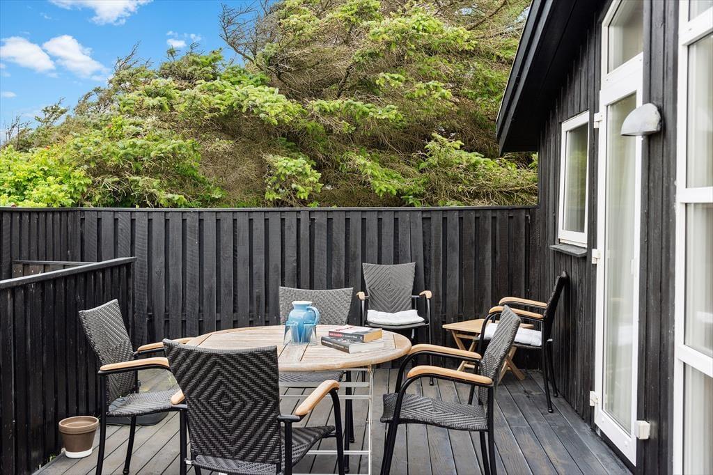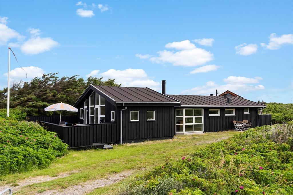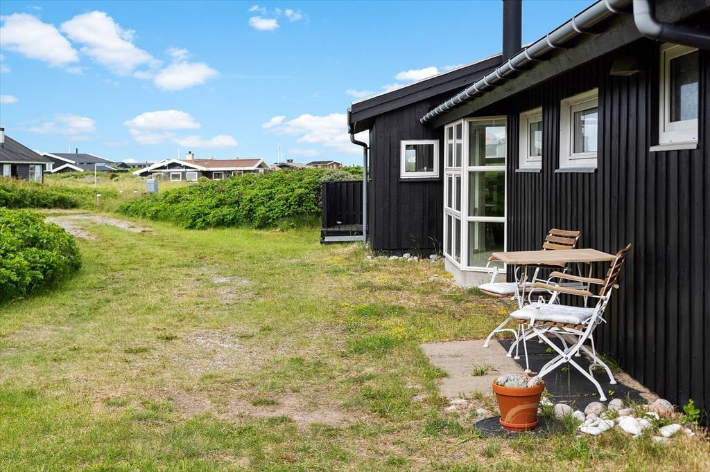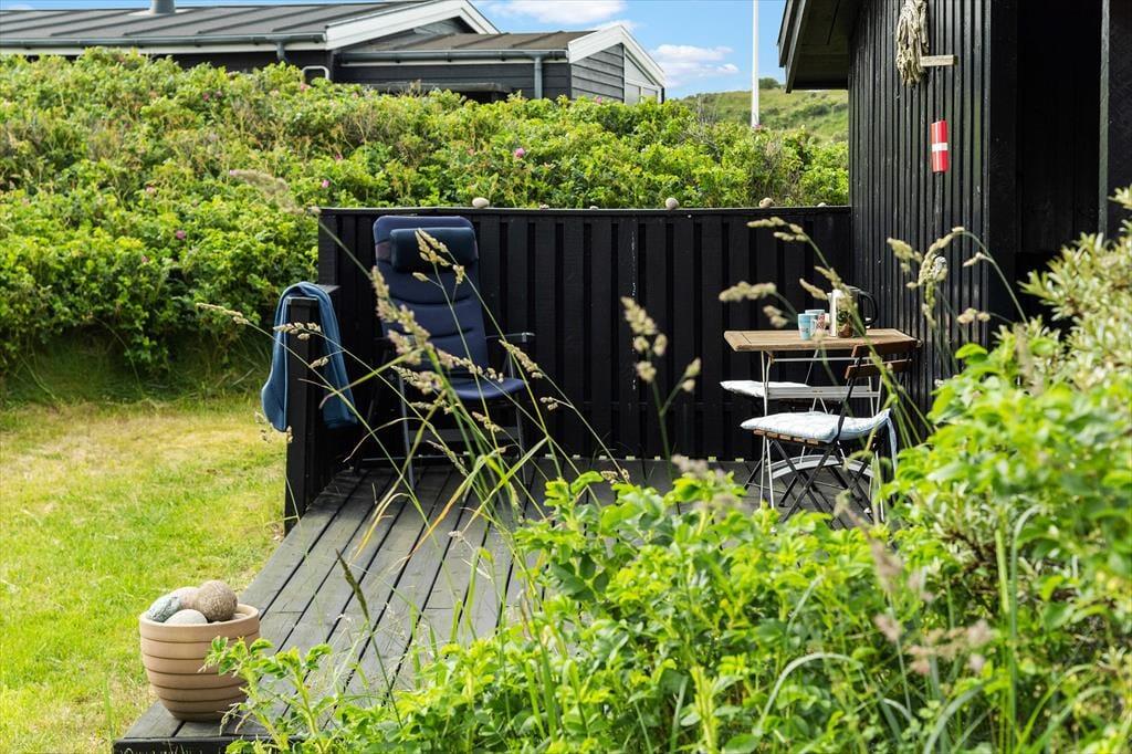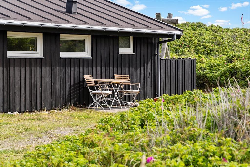 Udenfor finder du en stor terrasse med havemøbler, hvor du kan slappe af og nyde udsigten over havet. Terrassen er perfekt til udendørs måltider og hyggelige sommeraftener. Huset er omgivet af fredfyldt natur med indlandsklitterne i baggrunden. Med kun 150 meter til havet kan du nemt tage en kort gåtur og nyde det smukke Vesterhav