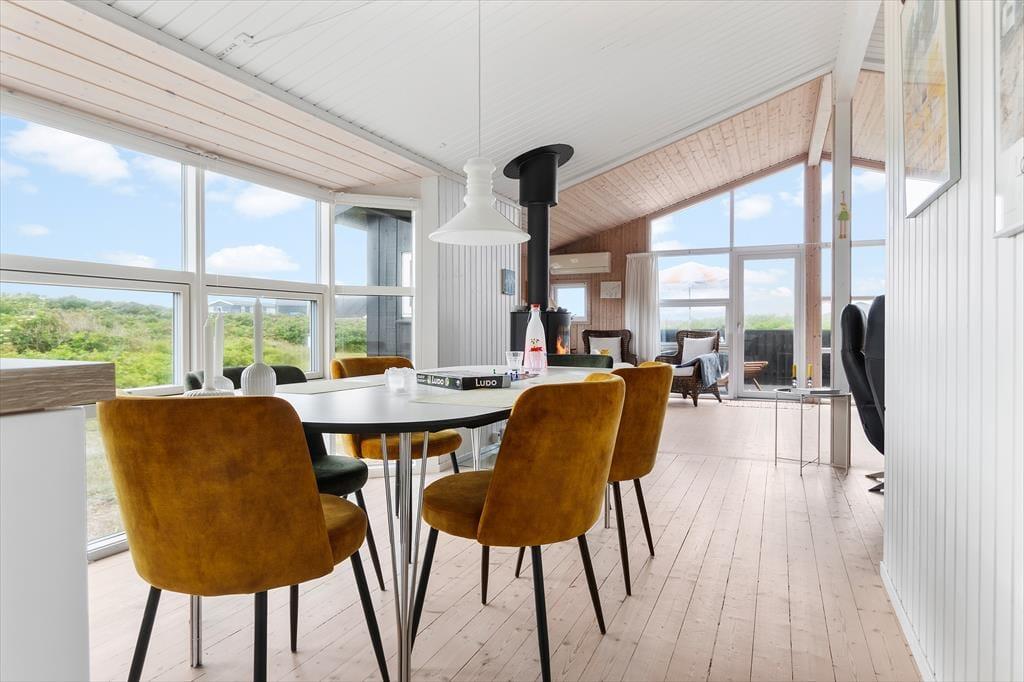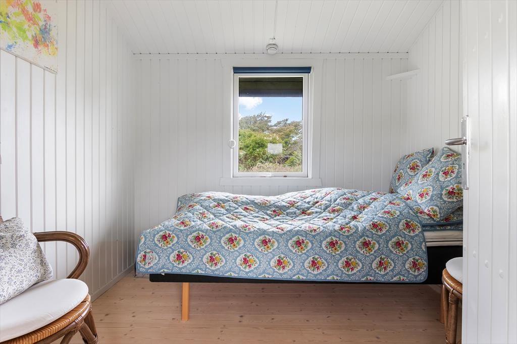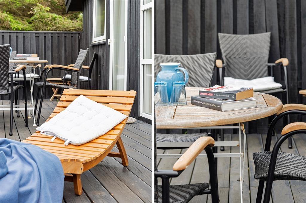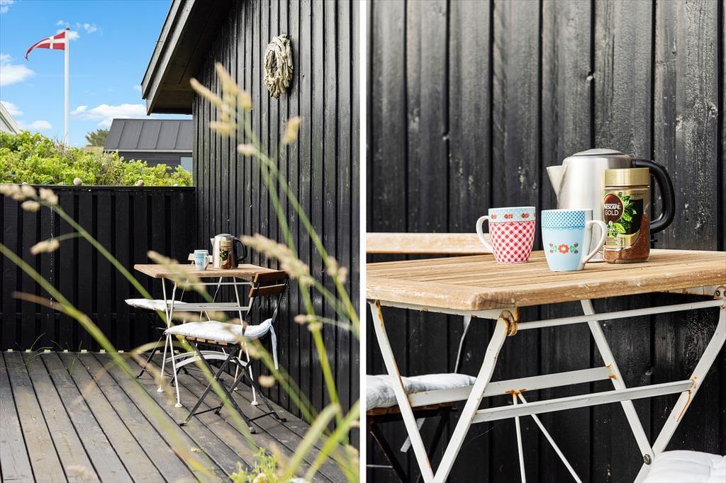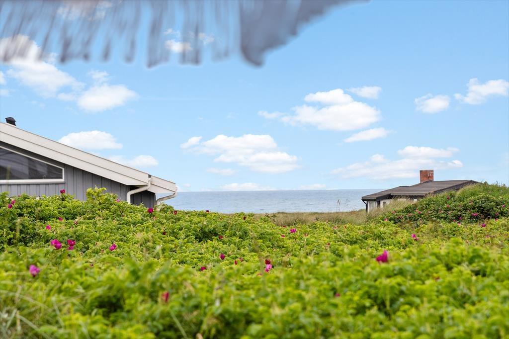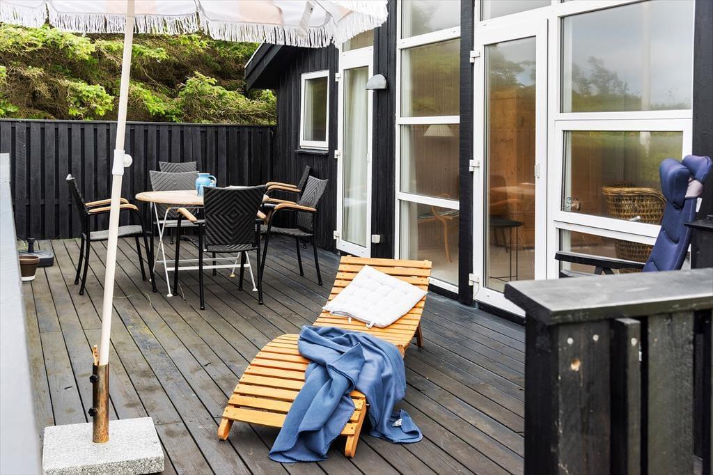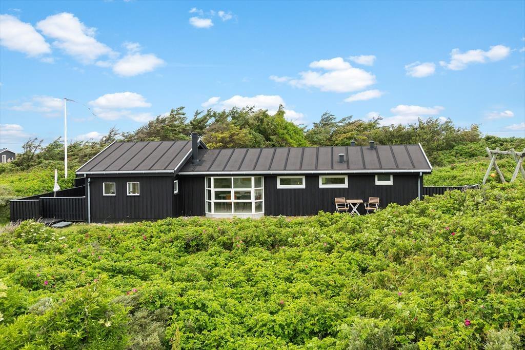 Udenfor finder du en stor terrasse med havemøbler, hvor du kan slappe af og nyde udsigten over havet. Terrassen er perfekt til udendørs måltider og hyggelige sommeraftener. Huset er omgivet af fredfyldt natur med indlandsklitterne i baggrunden. Med kun 150 meter til havet kan du nemt tage en kort gåtur og nyde det smukke Vesterhav