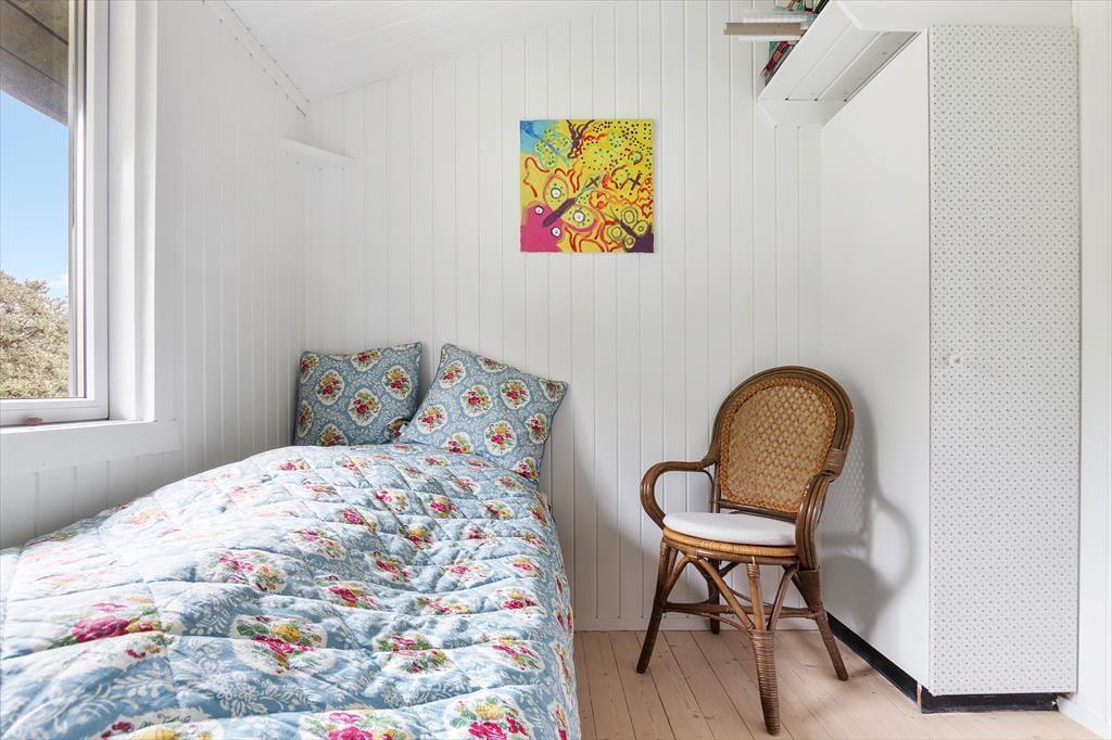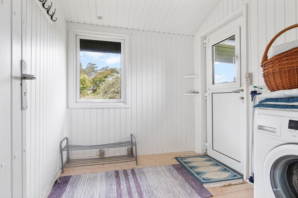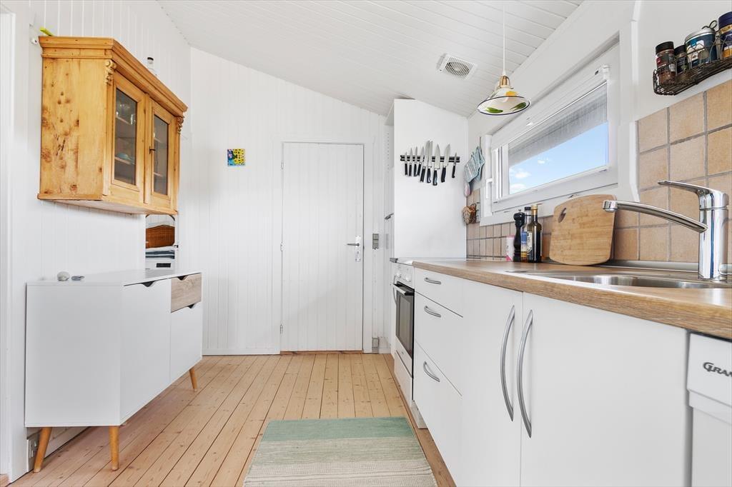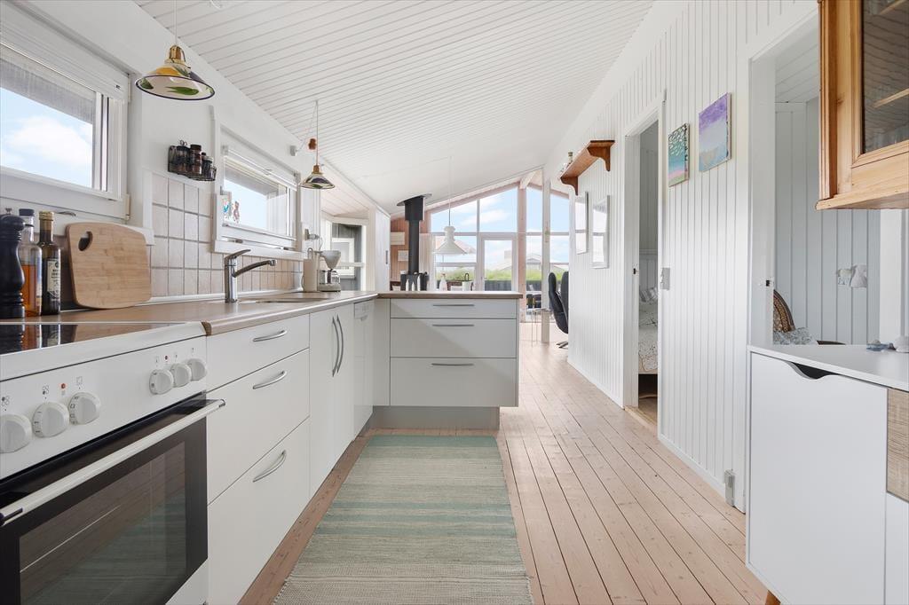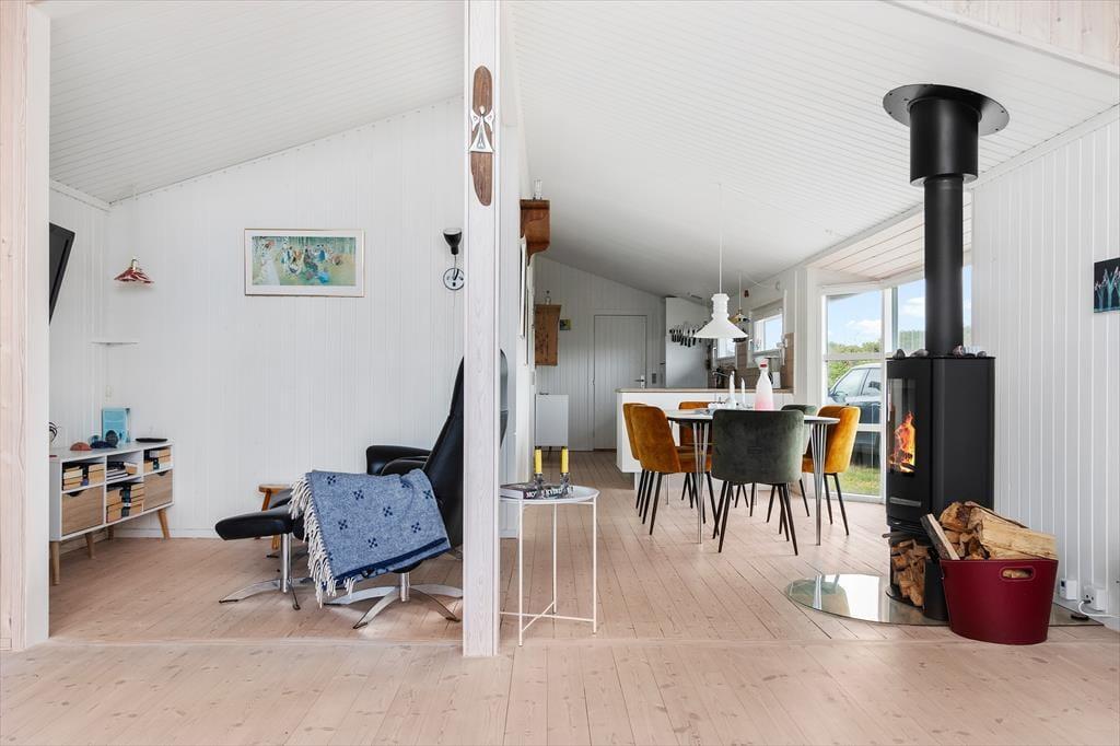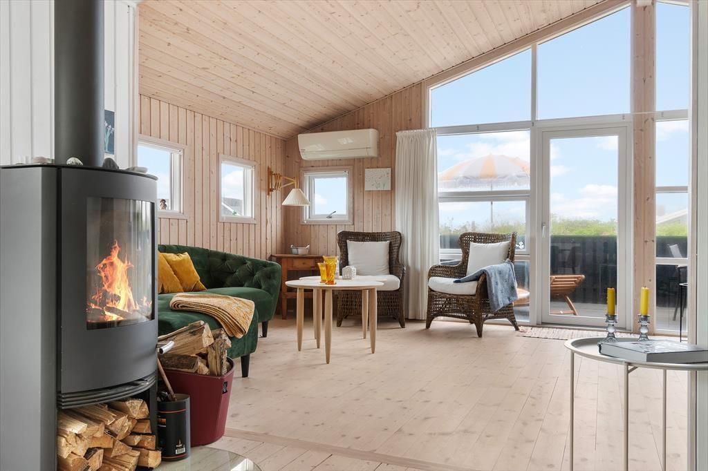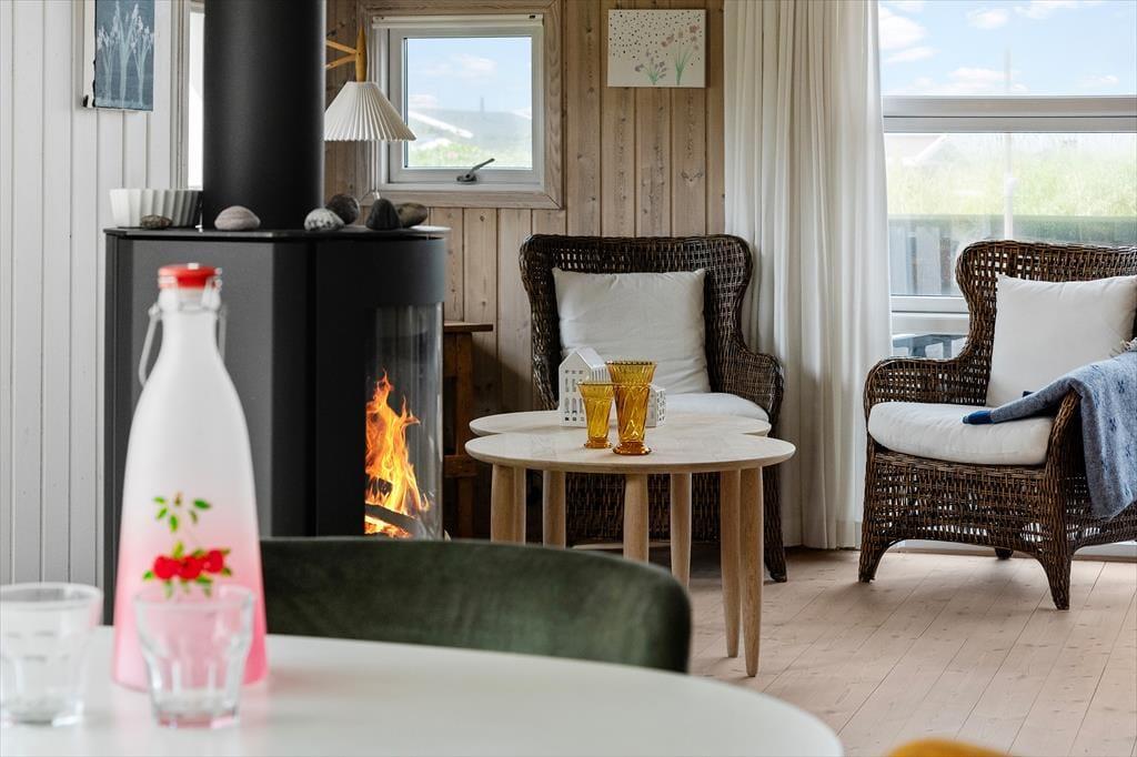 Indenfor i sommerhuset finder du en lys og moderne indretning med store vinduer, der giver en smuk udsigt til både naturen og havet. Huset har tre soveværelser: to med enkeltsenge og ét med en dobbeltseng. Stuen er rummelig og kombineret med køkkenet, som er fuldt udstyret, så du nemt kan lave mad. En brændeovn skaber hygge på kølige dage, og huset har alle nødvendige faciliteter som Wi-Fi, TV og varmepumpe for ekstra komfort året rundt.