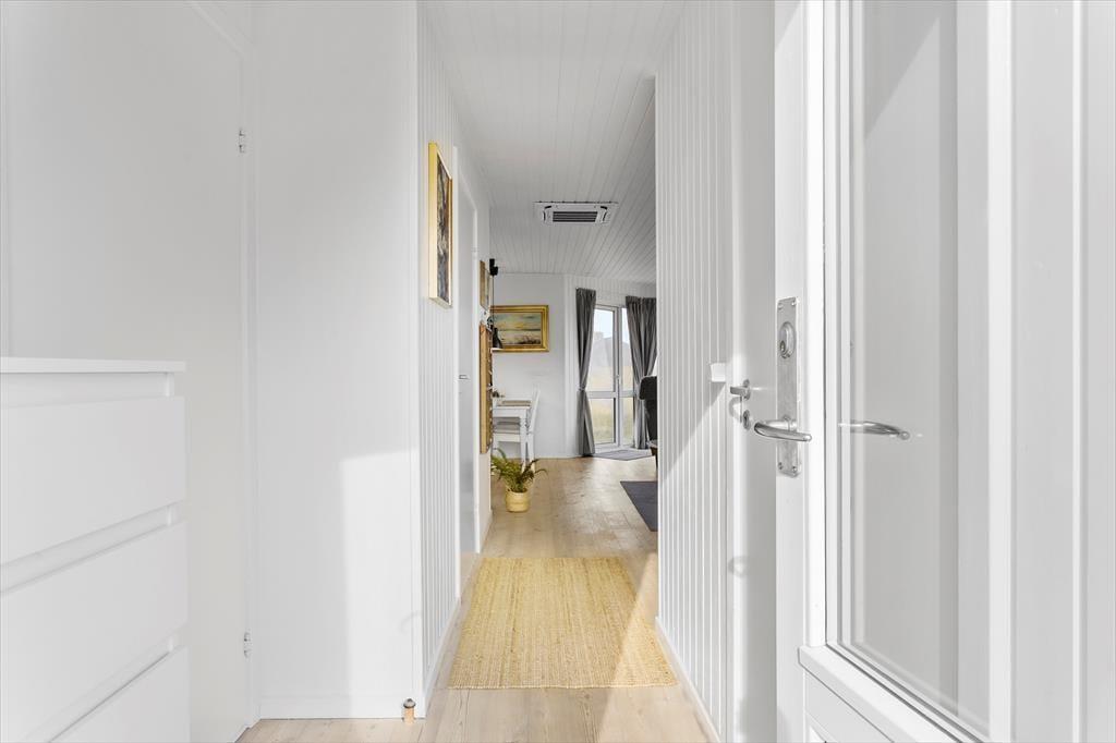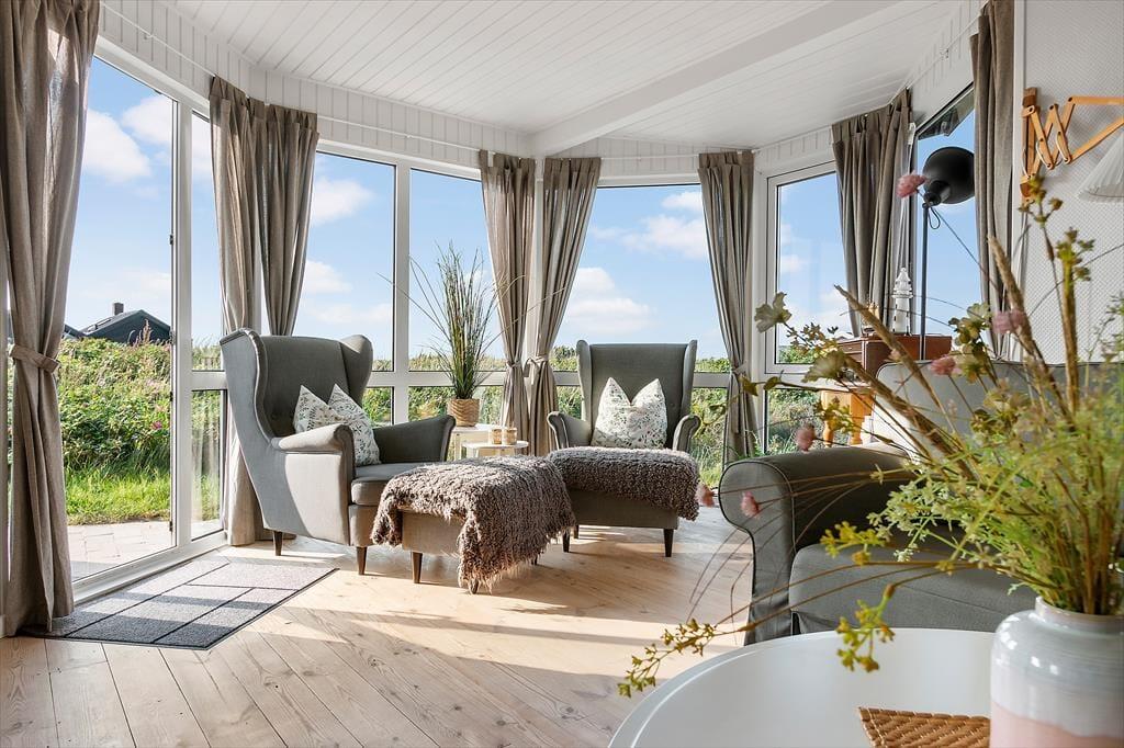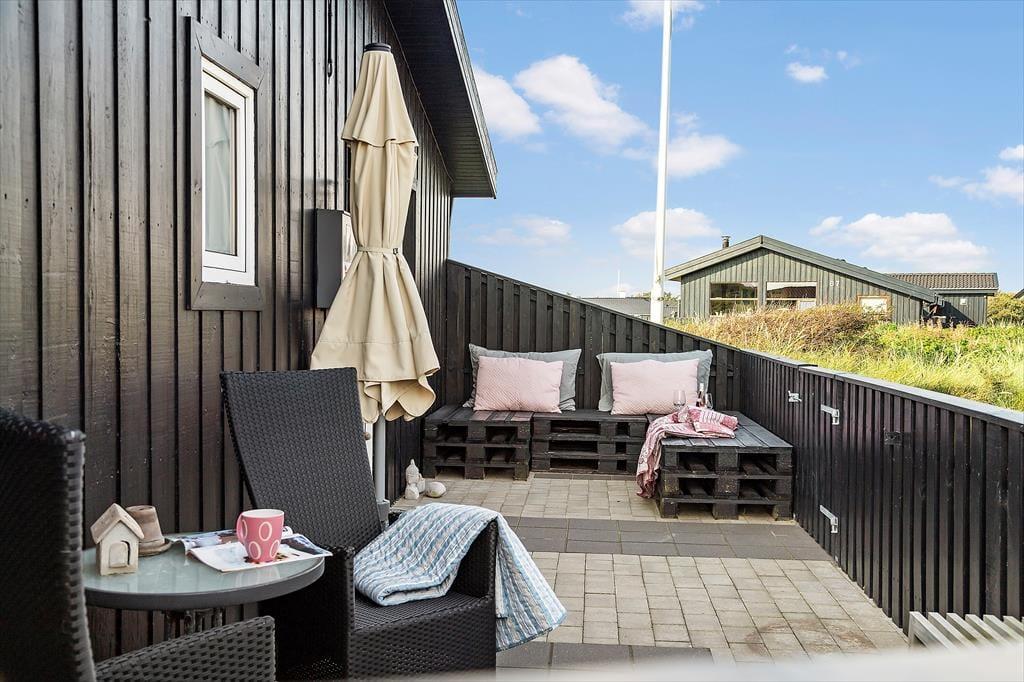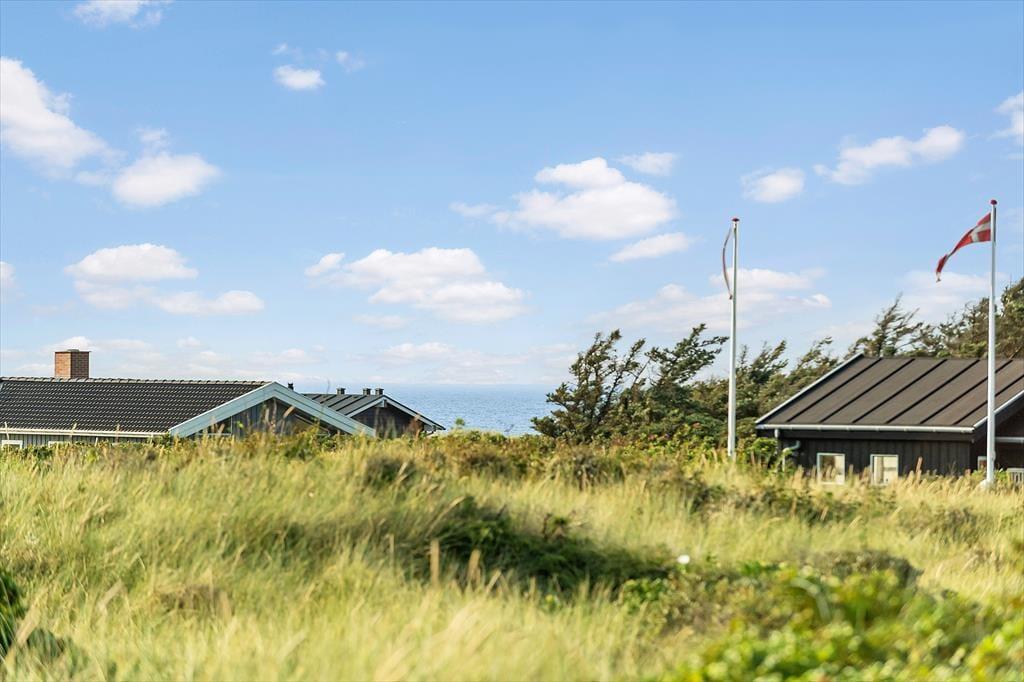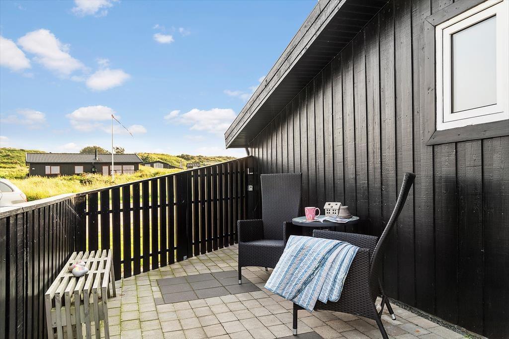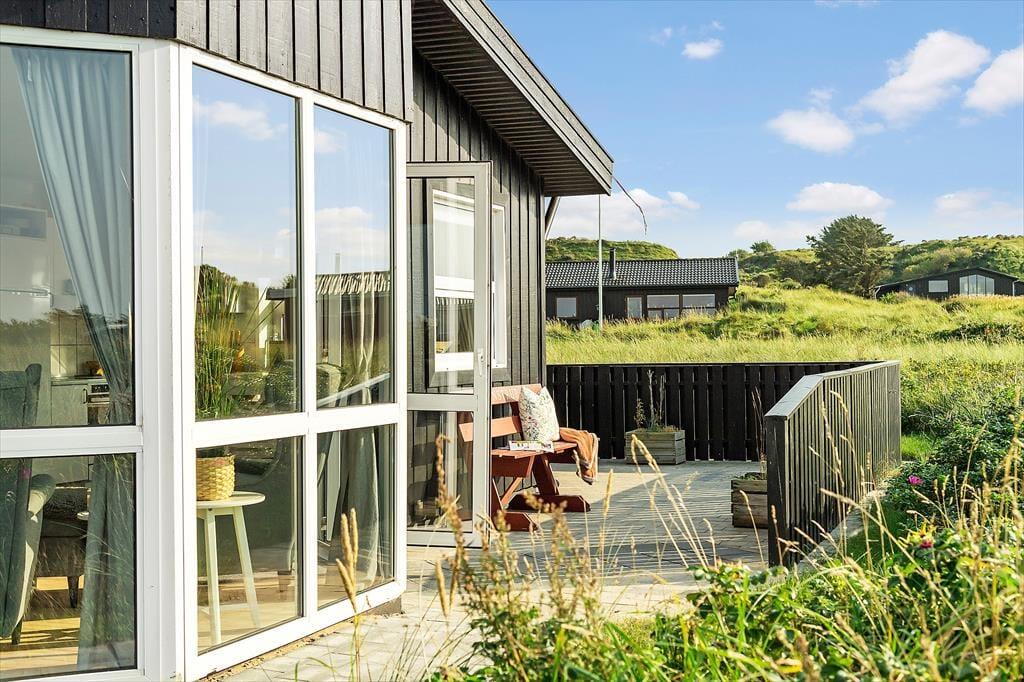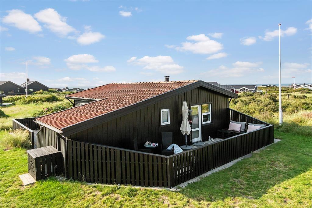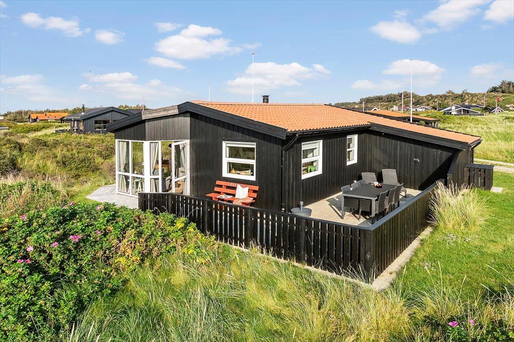 Ude i det fri kan du sætte dig lige der, hvor solforholdene er bedst, for der er flere dejlige terrasseområder at vælge imellem i direkte forlængelse af sommerhuset. Havet venter bare 250 meter væk, og kigger du til den anden side, kan du nyde synet af de flotte indlandsklitter, mens naturgrundens hybenbuske prydes af lyserøde blomster eller røde bær alt efter årstiden. Ud over havemøbler og liggestole er der parasol og grill til rådighed på terrassen, og ud mod vejen har I plads til at parkere bilen på det græsklædte areal.