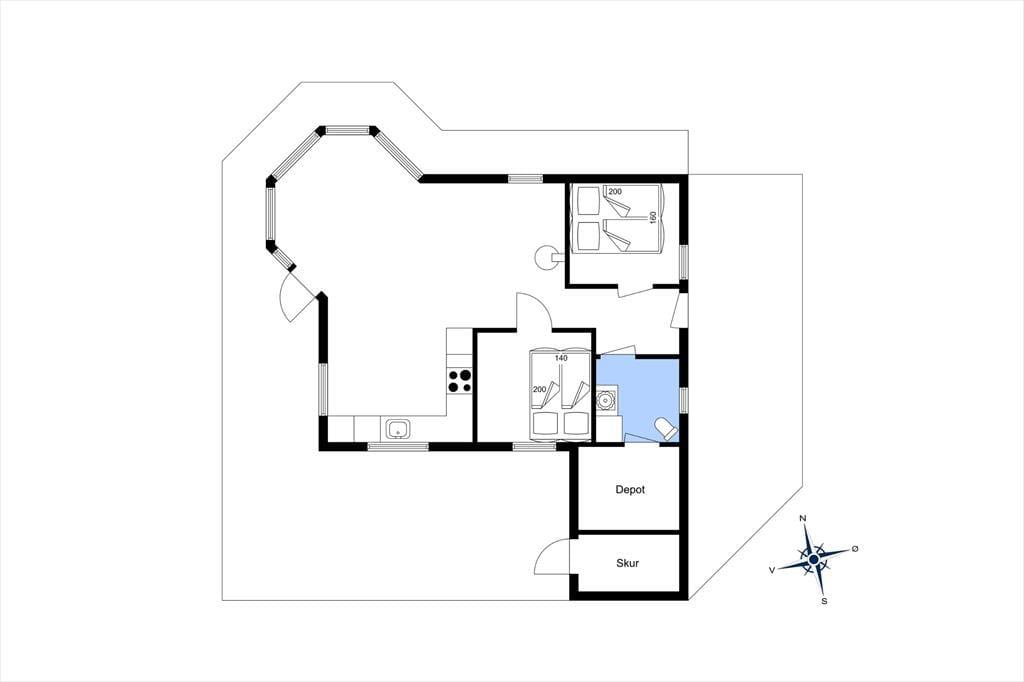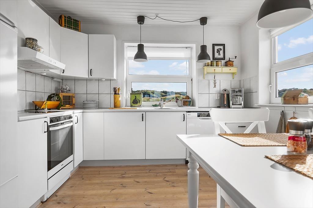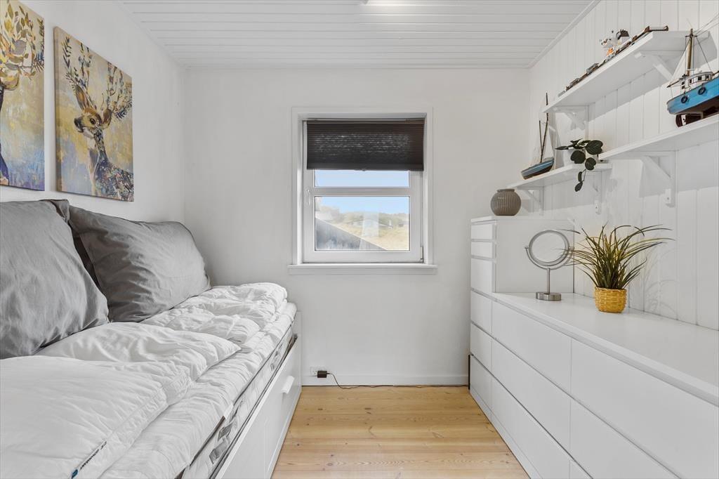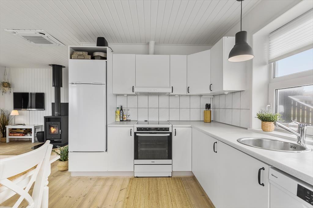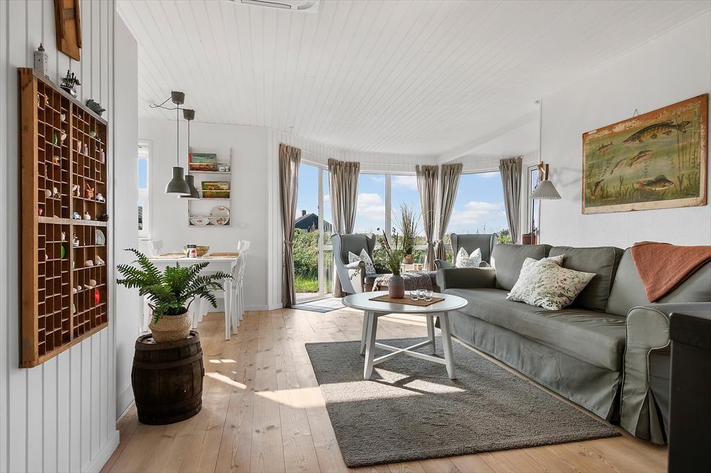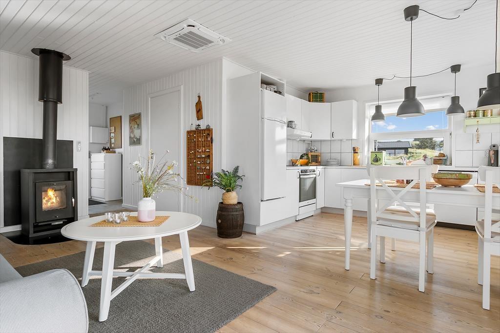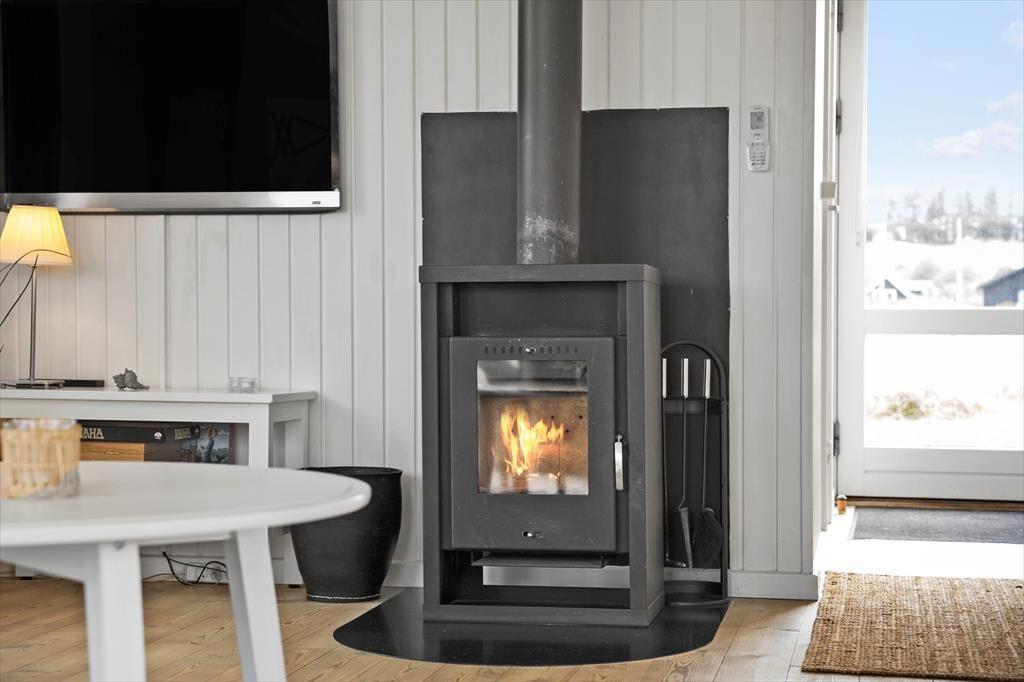 Sommerhuset har et lyst og hyggeligt indre, der passer godt til de skønne naturomgivelser. Stuens karnap giver dig frit udsyn til hav, hybenbuske og den høje himmel, selv når du trænger til at sidde roligt i en god lænestol – og du kan endda tænde op i brændeovnen, hvis der skal skrues ekstra op for både varmen og hyggestemningen. Et veludstyret køkken er integreret med stuen, så du skal ikke gå mange skridt, hvis du vil hen for at brygge mere kaffe eller begynde at forberede frokosten. Og når du og dine kære vender hjem fra dagens udflugter, og I har hygget jer lige frem til sengetid, kan I børste tænder på badeværelset, sige godnat og gå til ro på de to gode soveværelser.