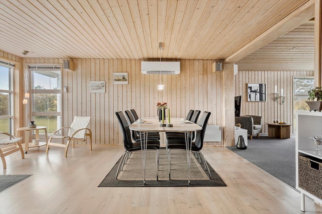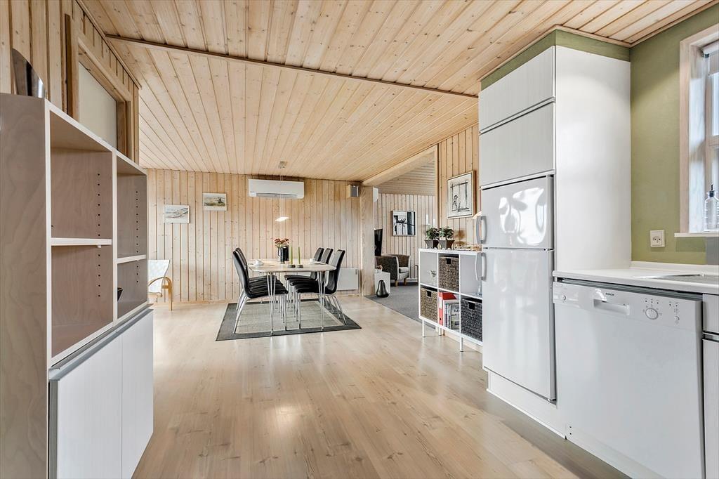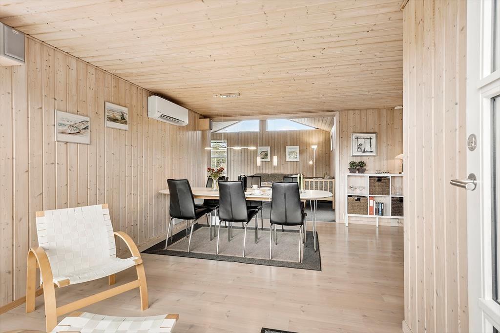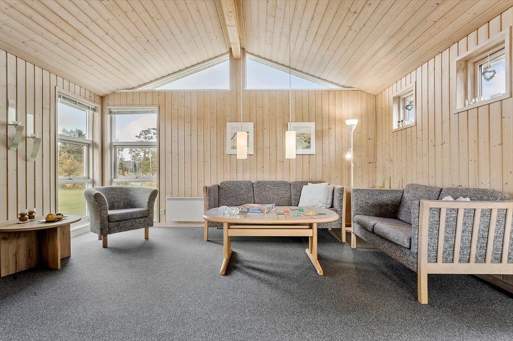 Når du træder ind i sommerhuset, mødes du af en varm og indbydende atmosfære, hvor træets naturlige materialer giver en autentisk og hjemlig følelse. Det åbne opholdsområde er perfekt til hyggelige stunder, hvor hele familien kan samles. Den enkle indretning giver masser af plads til at trække sig tilbage med en god bog eller spille et spil, mens du nyder den afslappede stemning i huset. De store vinduer lukker naturligt lys ind og giver en smuk udsigt til den frodige have udenfor, hvor du kan høre fuglene kvidre og mærke roen.