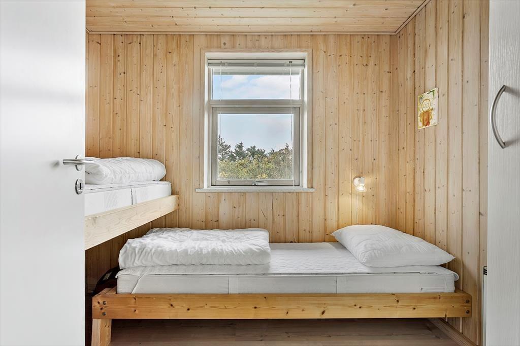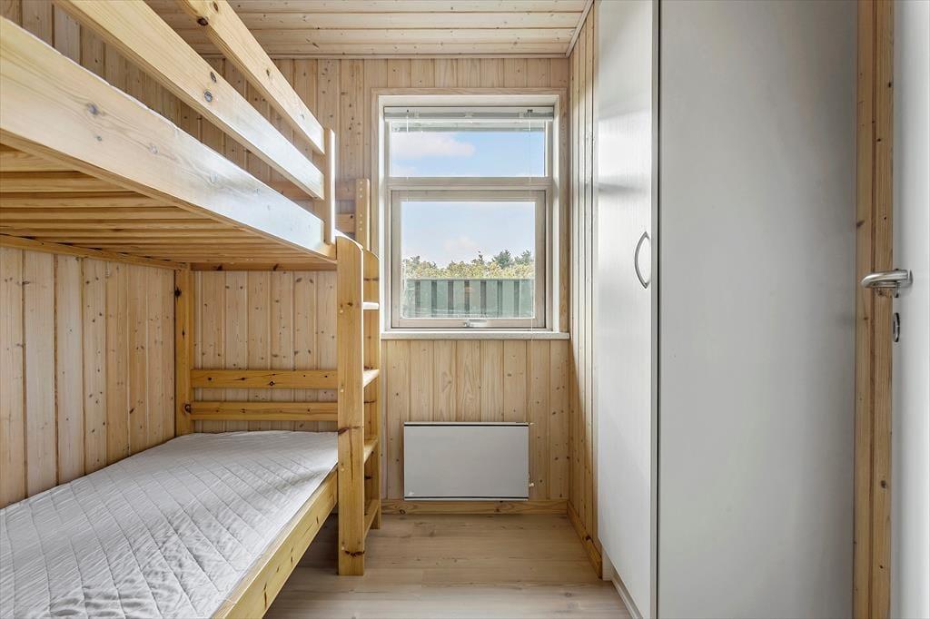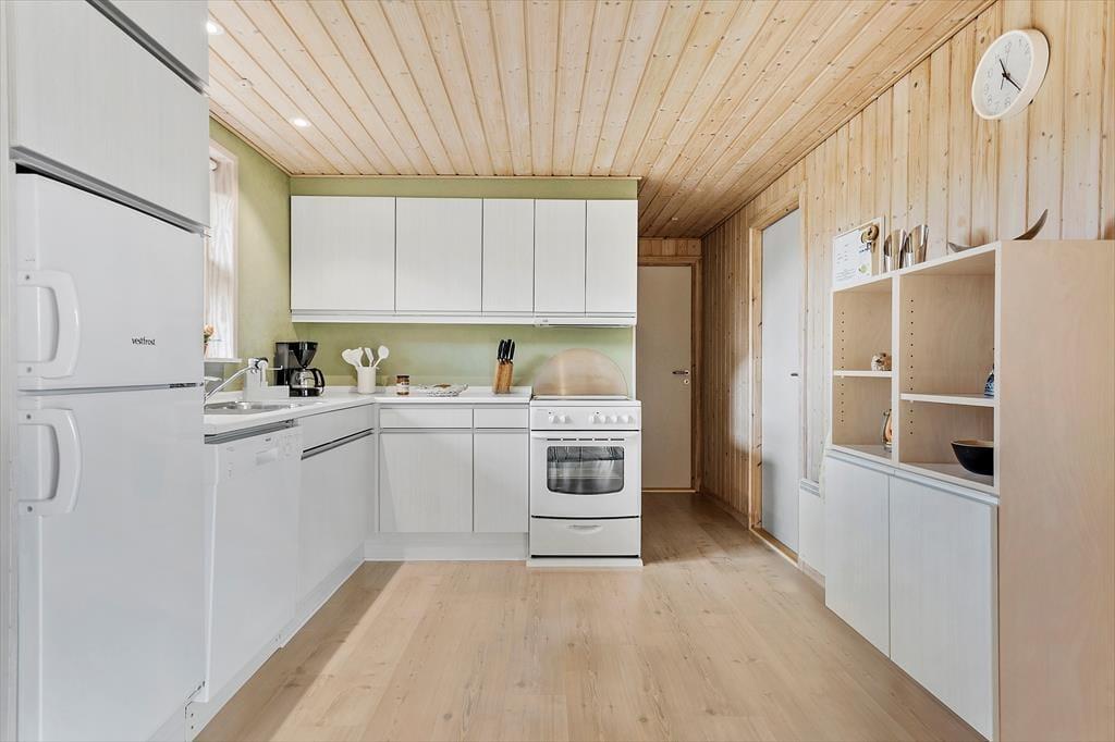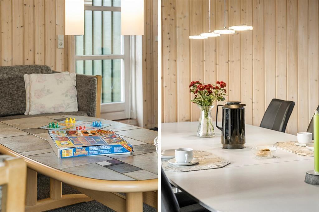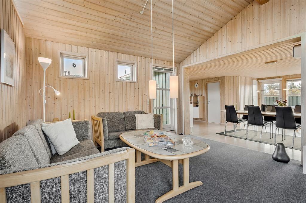 Når du træder ind i sommerhuset, mødes du af en varm og indbydende atmosfære, hvor træets naturlige materialer giver en autentisk og hjemlig følelse. Det åbne opholdsområde er perfekt til hyggelige stunder, hvor hele familien kan samles. Den enkle indretning giver masser af plads til at trække sig tilbage med en god bog eller spille et spil, mens du nyder den afslappede stemning i huset. De store vinduer lukker naturligt lys ind og giver en smuk udsigt til den frodige have udenfor, hvor du kan høre fuglene kvidre og mærke roen.
