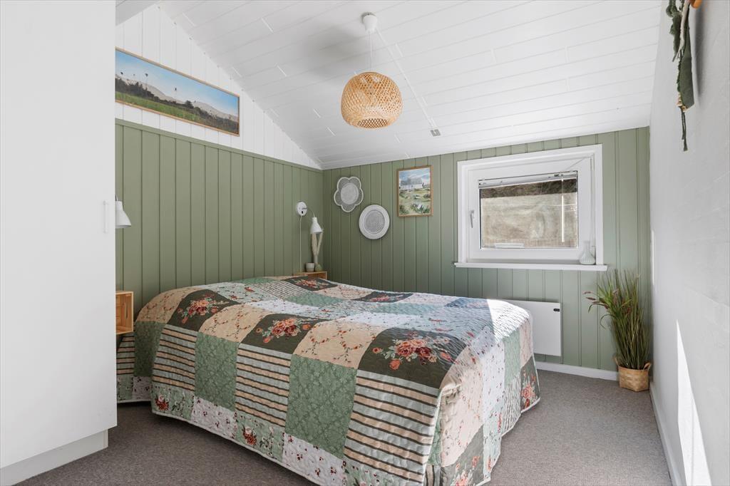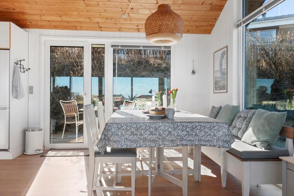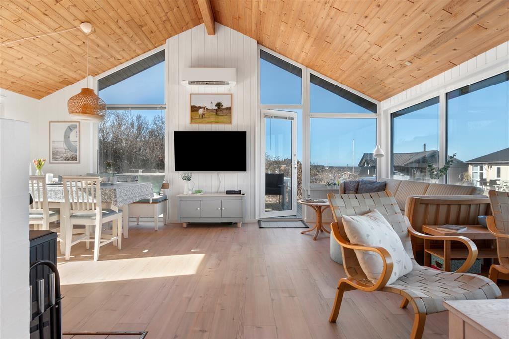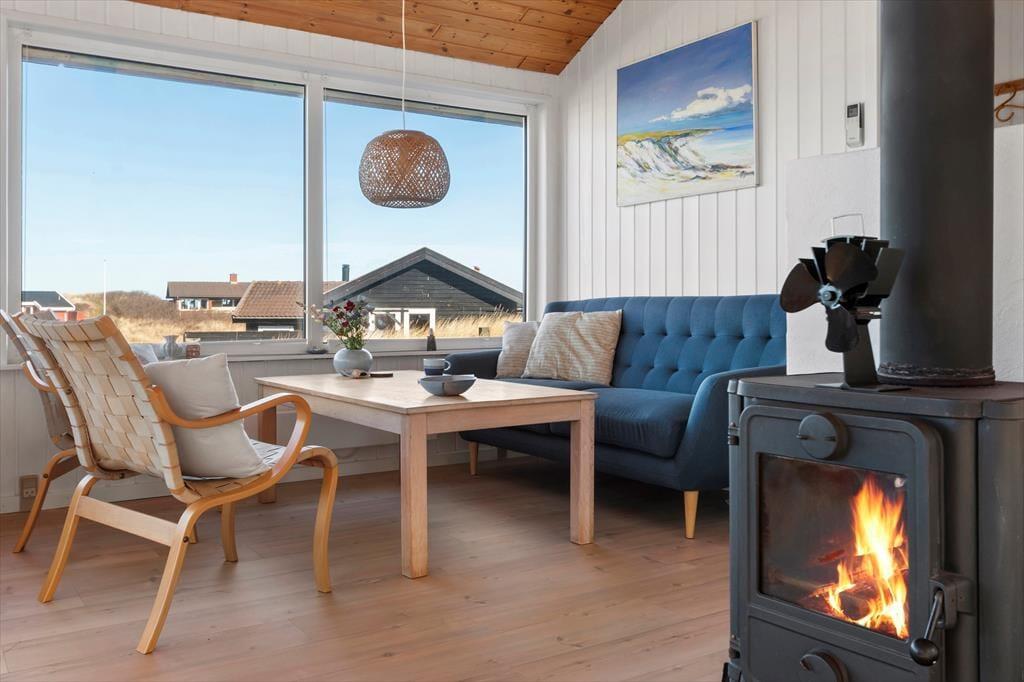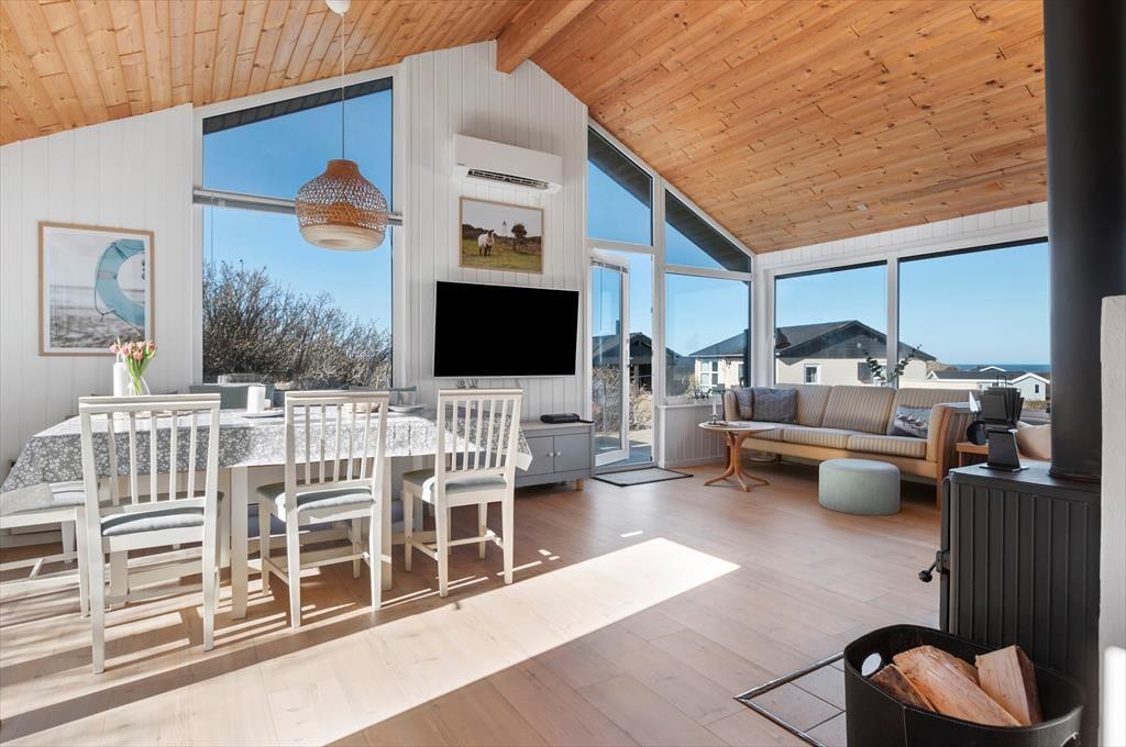 Sommerhuset har en lækker og lys indretning, hvor den hyggelige sommerhusstemning er bevaret med loft til kip og træbeklædte vægge. Stuen og køkkenet ligger i åben forbindelse, så du kan nyde samværet med familie og venner, mens der tilberedes lækre feriemåltider. Hele al-rummet har havudsigt til Vesterhavet i flere retninger, så du kan både lave mad og nyde den smukke udsigt til vandet. De store vinduespartier sikrer et flot lysindfald og giver samtidig en skøn udsigt til de naturskønne omgivelser. En brændeovn bidrager til den hyggelige atmosfære, og fra sofaen kan du nyde synet af flammerne på køligere dage. Husets soveværelser er ligeledes lyse og indbydende med en charmerende badehusstil i flotte, afstemte farver, så du kan se frem til en god nats søvn efter en dag fuld af ferieoplevelser.