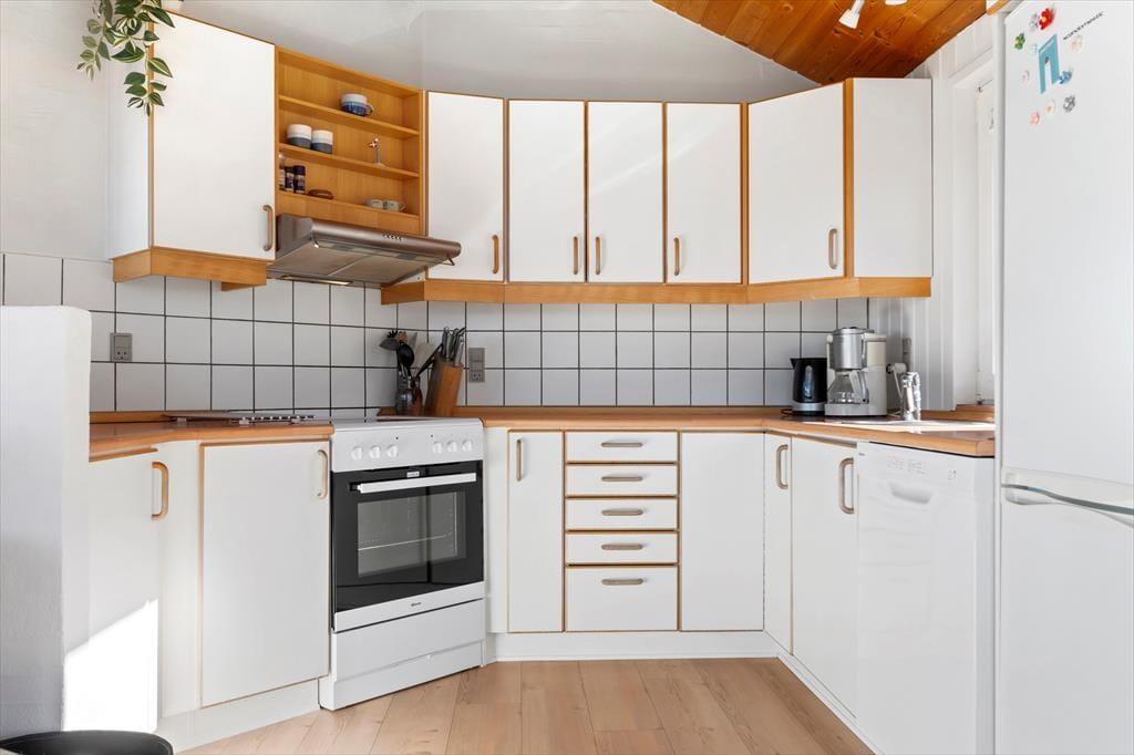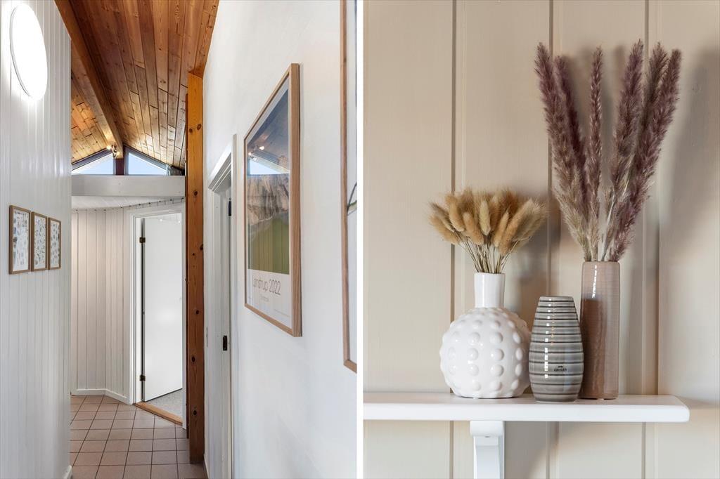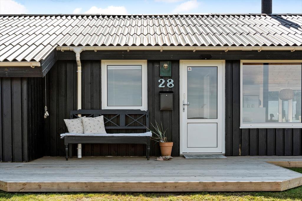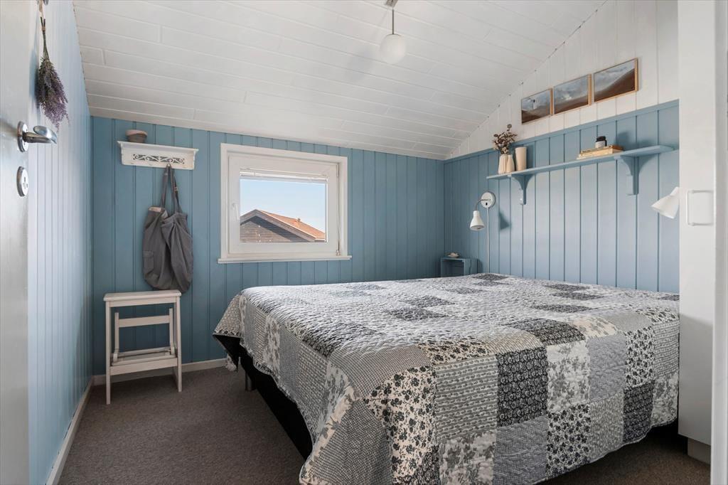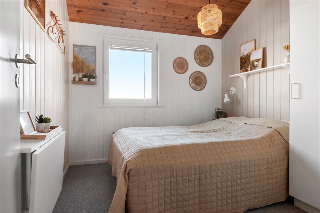 Sommerhuset har en lækker og lys indretning, hvor den hyggelige sommerhusstemning er bevaret med loft til kip og træbeklædte vægge. Stuen og køkkenet ligger i åben forbindelse, så du kan nyde samværet med familie og venner, mens der tilberedes lækre feriemåltider. Hele al-rummet har havudsigt til Vesterhavet i flere retninger, så du kan både lave mad og nyde den smukke udsigt til vandet. De store vinduespartier sikrer et flot lysindfald og giver samtidig en skøn udsigt til de naturskønne omgivelser. En brændeovn bidrager til den hyggelige atmosfære, og fra sofaen kan du nyde synet af flammerne på køligere dage. Husets soveværelser er ligeledes lyse og indbydende med en charmerende badehusstil i flotte, afstemte farver, så du kan se frem til en god nats søvn efter en dag fuld af ferieoplevelser.