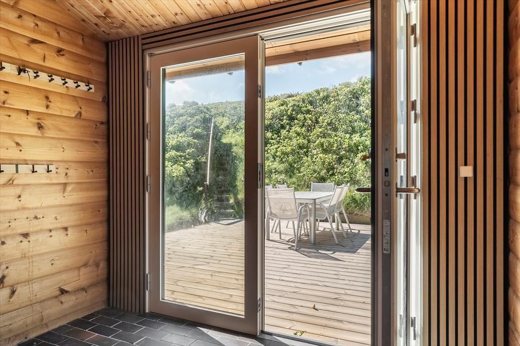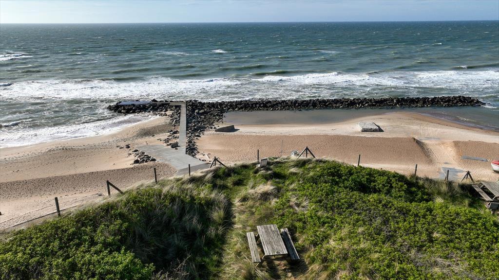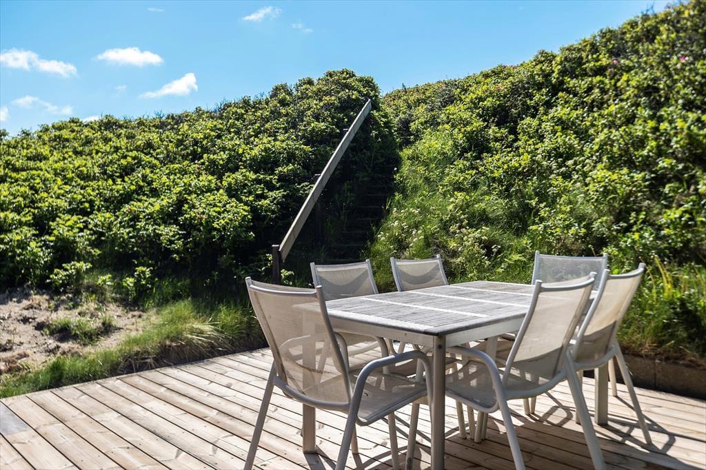 Udenfor venter endnu flere unikke oplevelser, når du træder ud i sommerhusets direkte naturskønne omgivelser. Den rummelige terrasse åbner op mod en betagende panoramaudsigt, hvor havets bølger møder den endeløse kyststrækning. Her kan du nyde morgenkaffen til lyden af de blide bølgeskvulp og lade tankerne flyve frit, mens du betragter solens spil over vandet. Adgang til husets private område sker via en charmerende sti, der snor sig gennem de autentiske klitter – en sand fornøjelse for både sjæl og krop. Den frie og ægte natur inviterer til lange gåture og stille øjeblikke med fordybelse i det åbne landskab. Om aftenen bringer den blide brise og den bløde skær fra solnedgangen en følelse af velvære og afslapning, som gør det let at glemme hverdagens travlhed og bare nyde livets små glæder.