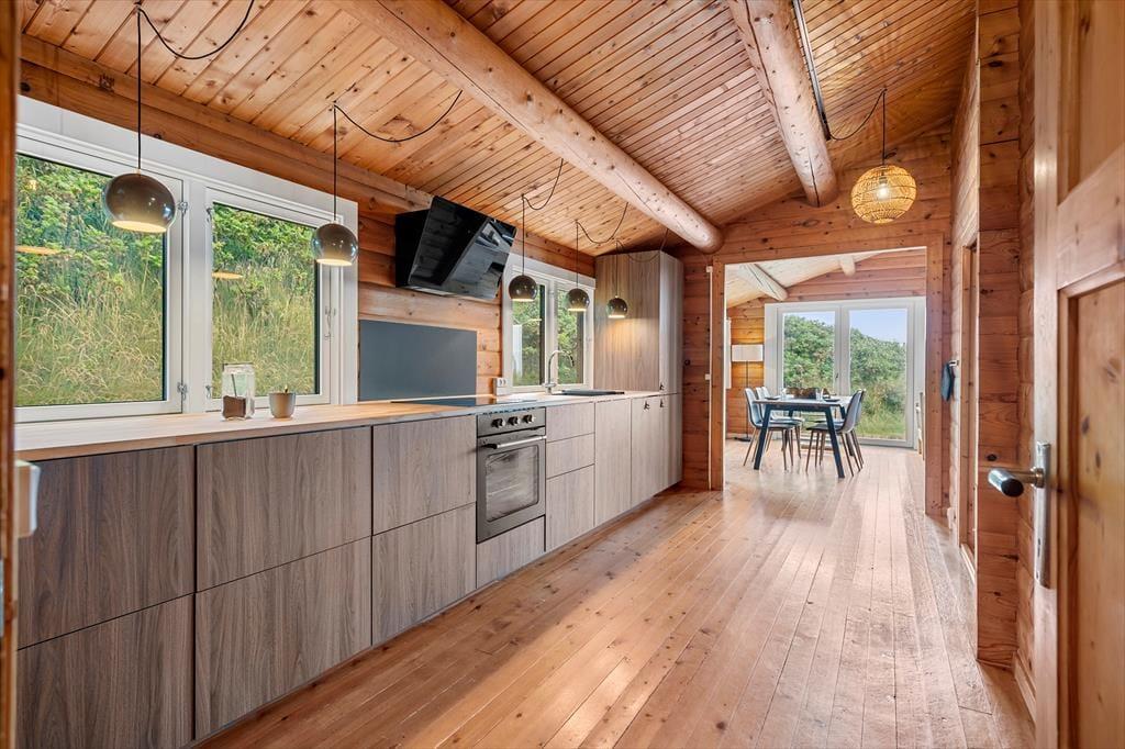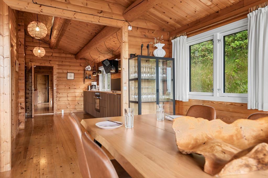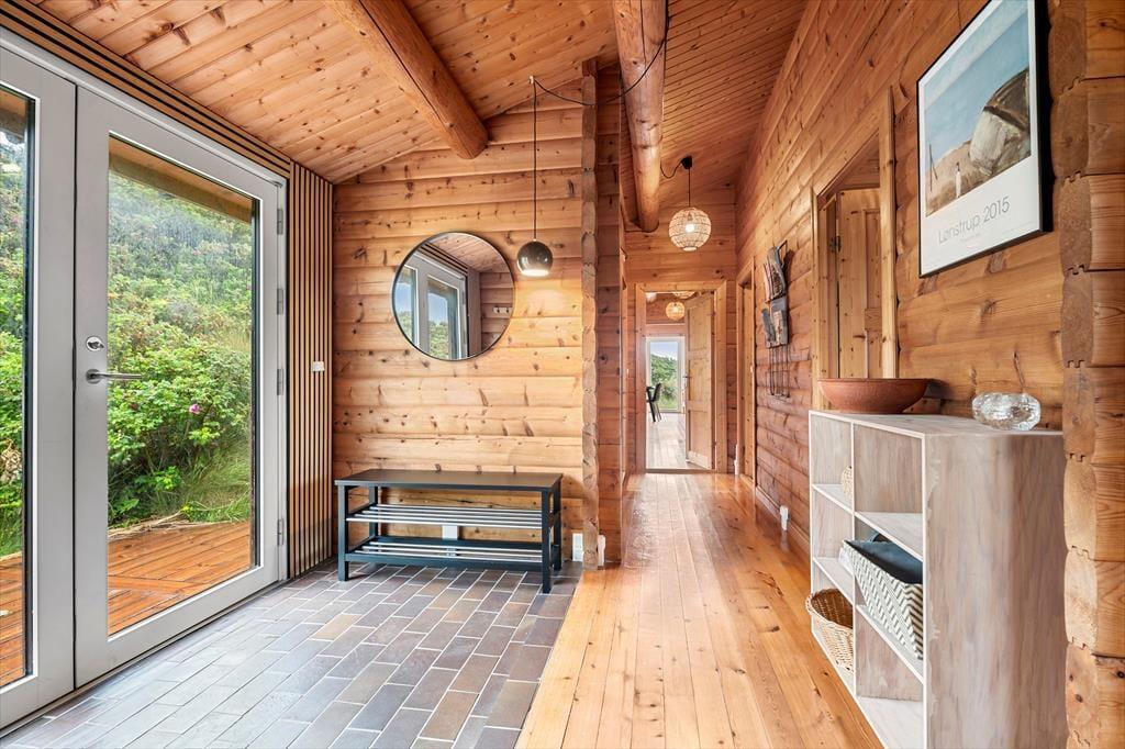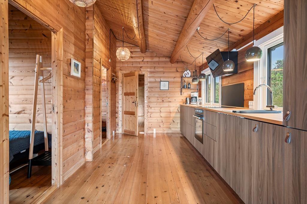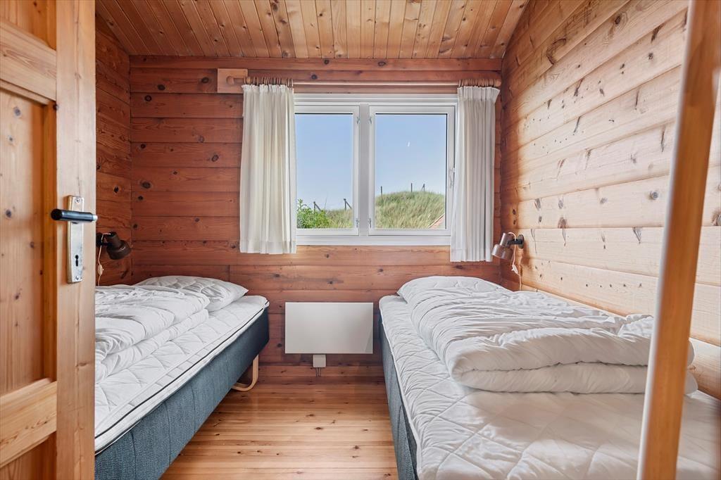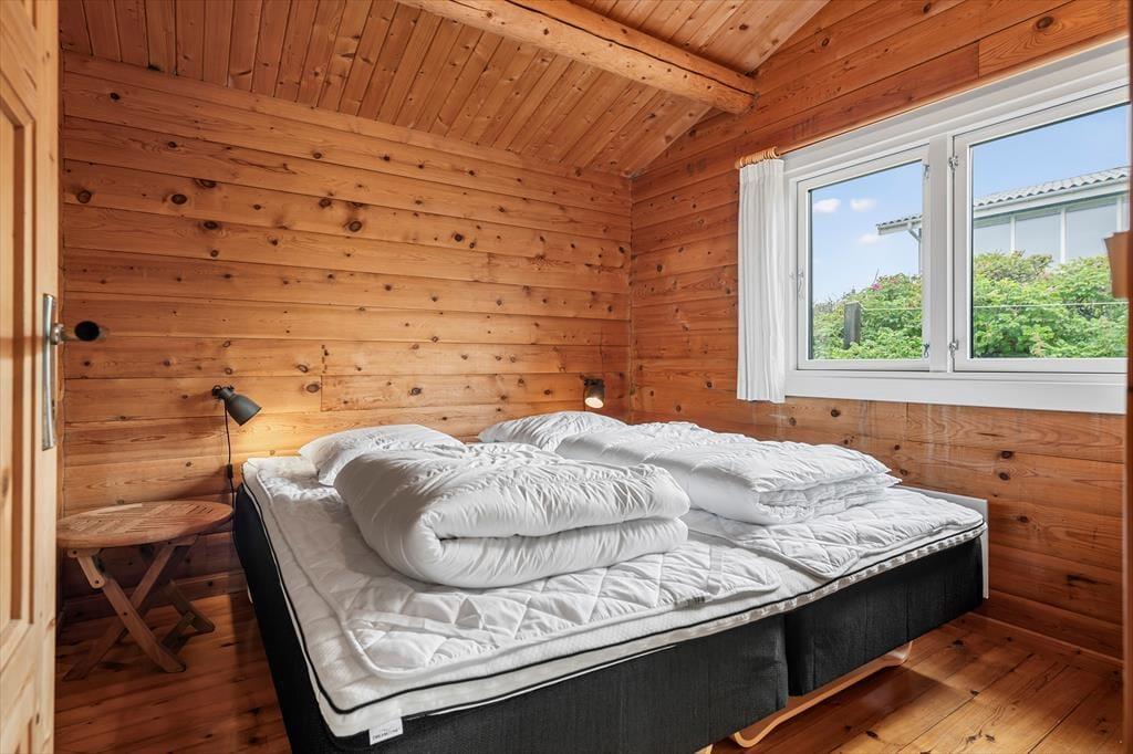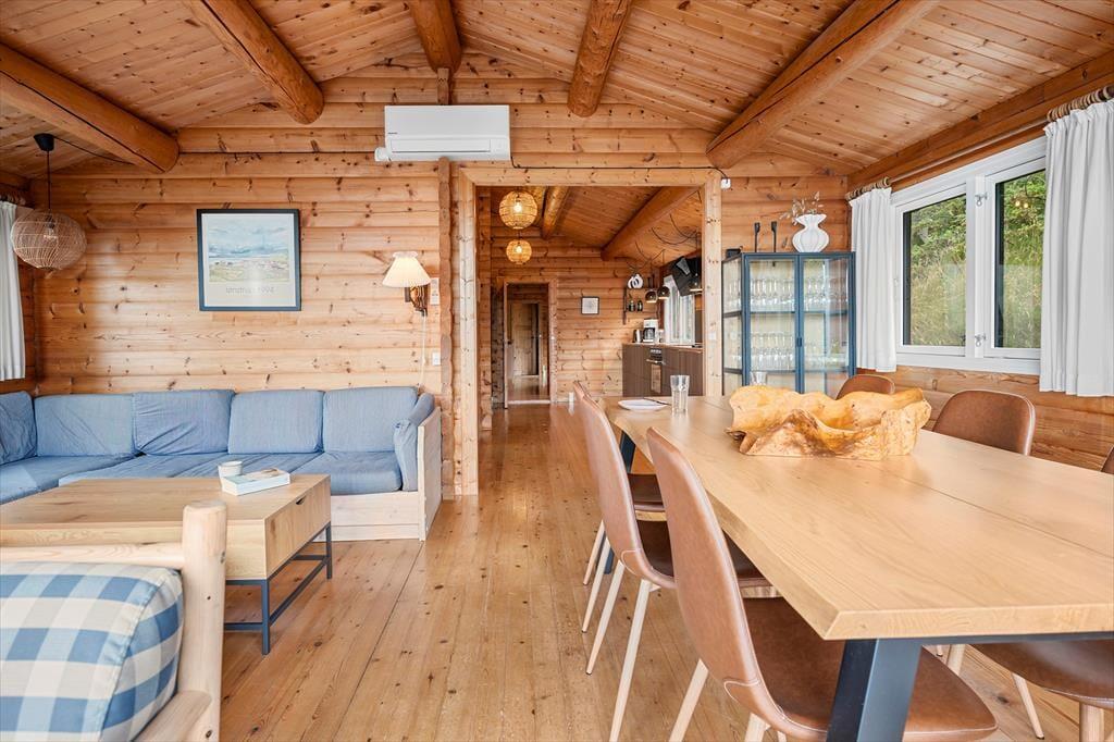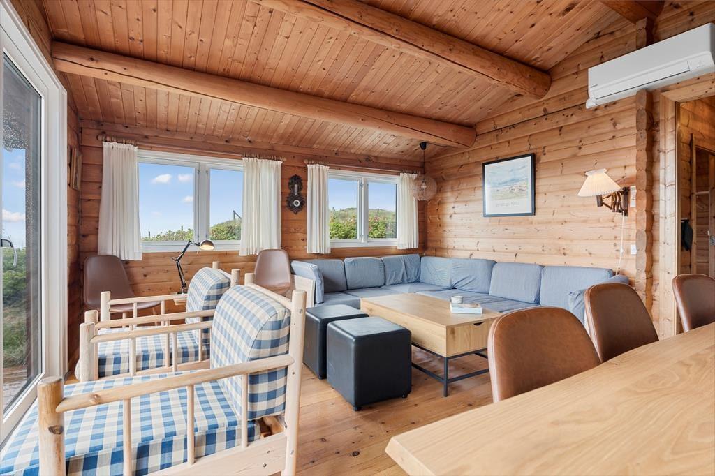 Når du træder indenfor i sommerhuset, mødes du af en harmonisk blanding af moderne design og naturlige elementer, som tilsammen skaber en indbydende atmosfære. Her er lyset i centrum – store vinduespartier lader solstrålerne danse ind i rummene og forvandler de indrettede stuer til et levende maleri af farver og skygger. Det stilfulde interiør er omhyggeligt planlagt, så både moderne bekvemmeligheder og en ærlig fornemmelse af hjemlig hygge får plads. Indretningen vækker sanserne med varme toner, bløde tekstiler og komfortable møbler, og med to flotte badeværelser er tanken om afslappende stunder efter en lang dag ved strand og klit nemt at forestille sig.