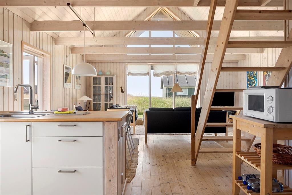 Det første, der møder dig, når du træder ind ad døren, er det lyse og åbne indtryk, der præger hele boligen. Indretningen er gennemført hyggelig med en afslappet feriestemning, og vinduerne i stuen trækker ikke bare dagslyset helt ind i rummet – de giver dig også et skønt kig til havet, som ligger lige i nærheden. Her er det nemt at slå sig ned med en kop kaffe og lade blikket vandre mod horisonten, mens tankerne flyver frit. Det åbne opholdsrum skaber en god ramme for både nærvær og samtaler, og du vil hurtigt mærke, hvordan roen sænker sig, når I samles her efter en dag i det fri. Uanset om du er til rolige morgener med morgenmad og havudsigt eller spil og snak omkring spisebordet om aftenen, lægger lejligheden op til kvalitetstid i afslappede rammer.