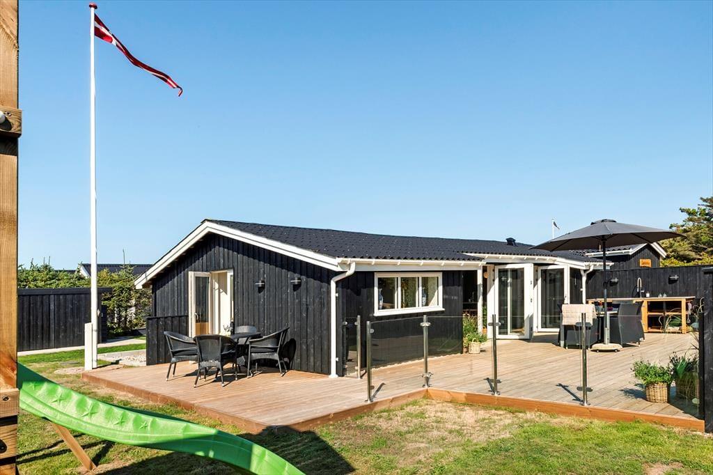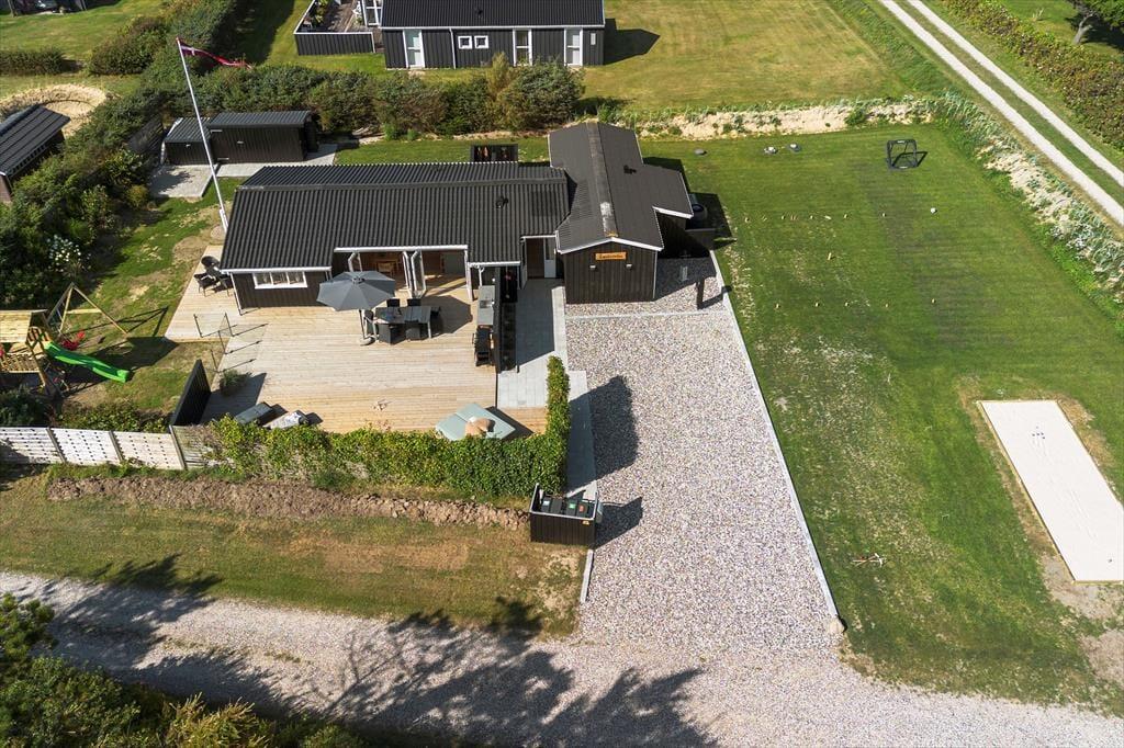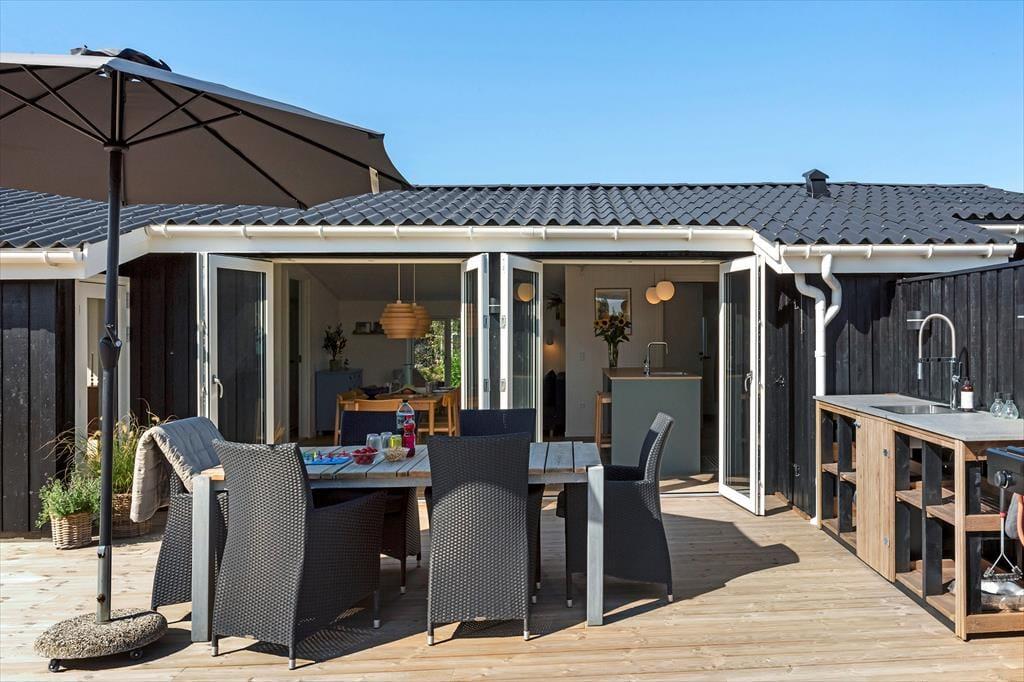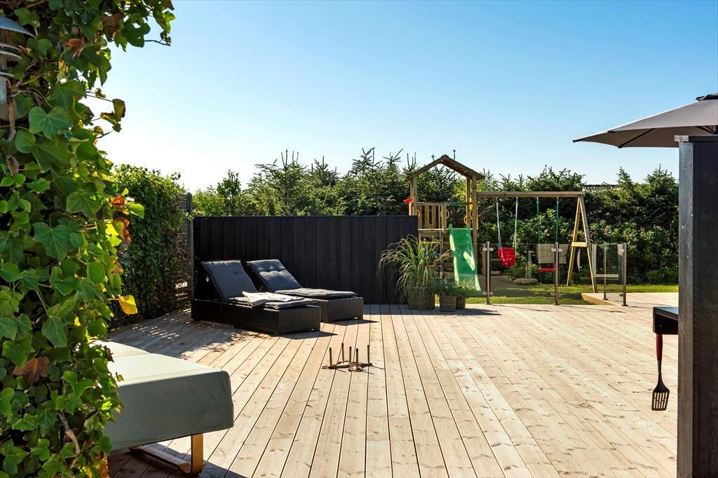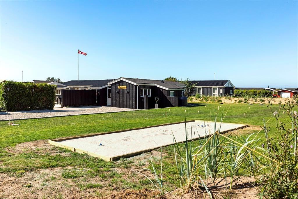 Udenfor folder ferielivet sig for alvor ud. Den store terrasse er indrettet med gode havemøbler, så du kan nyde solen fra morgen til aften – måske med morgenkaffen i hånden eller med et glas vin, mens aftensolen farver himlen. Sommerhusets udekøkken indbyder til madlavning under åben himmel, og med udebruseren er det oplagt at skylle havvand og sand af efter en tur til stranden. I haven finder du både en petanquebane og et legetårn med gynger og rutsjebane, så både børn og voksne kan hygge sig på hver deres måde. Med andre ord er dette et sommerhus, hvor alle generationer kan samles, og hvor dagene let forsvinder i leg, afslapning og gode måltider under åben himmel.