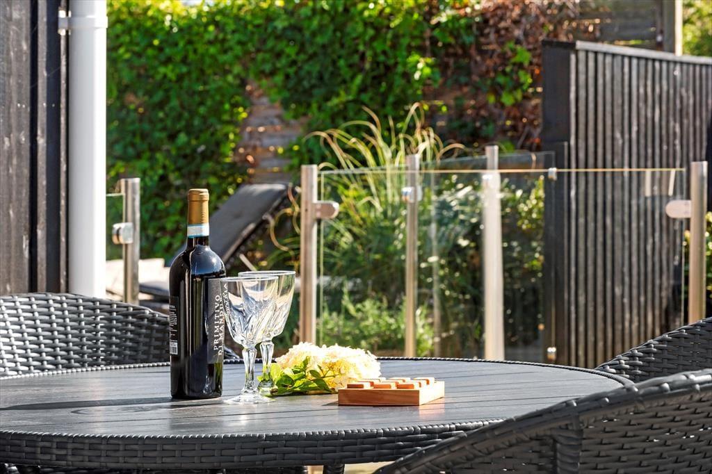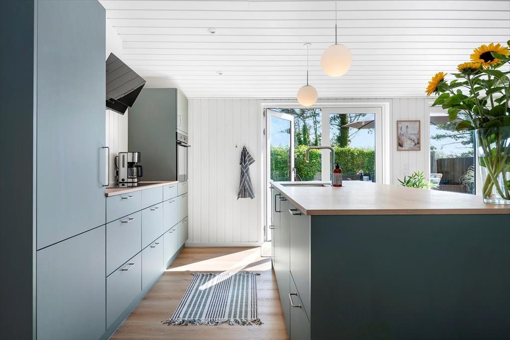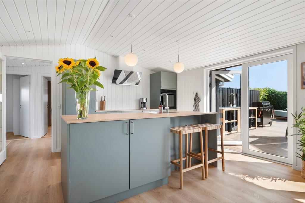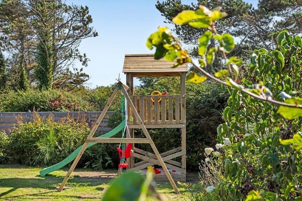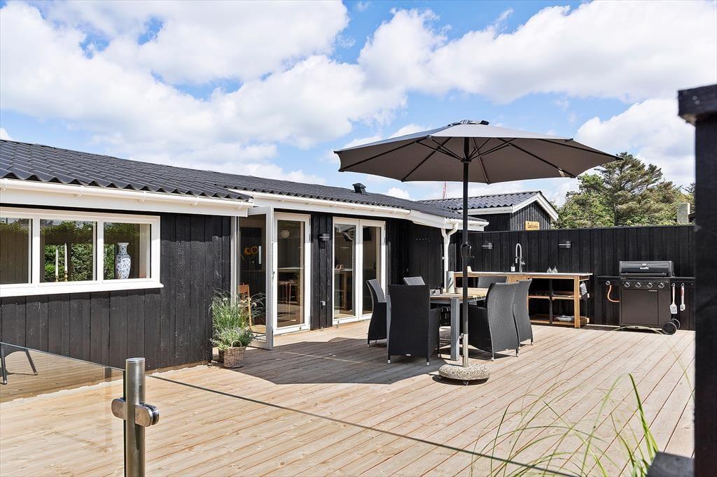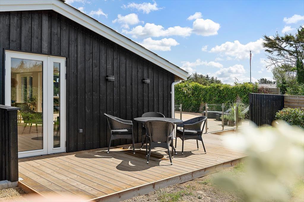 Udenfor folder ferielivet sig for alvor ud. Den store terrasse er indrettet med gode havemøbler, så du kan nyde solen fra morgen til aften – måske med morgenkaffen i hånden eller med et glas vin, mens aftensolen farver himlen. Sommerhusets udekøkken indbyder til madlavning under åben himmel, og med udebruseren er det oplagt at skylle havvand og sand af efter en tur til stranden. I haven finder du både en petanquebane og et legetårn med gynger og rutsjebane, så både børn og voksne kan hygge sig på hver deres måde. Med andre ord er dette et sommerhus, hvor alle generationer kan samles, og hvor dagene let forsvinder i leg, afslapning og gode måltider under åben himmel.