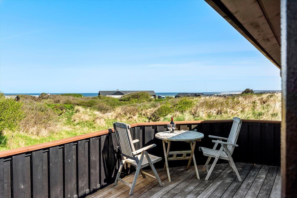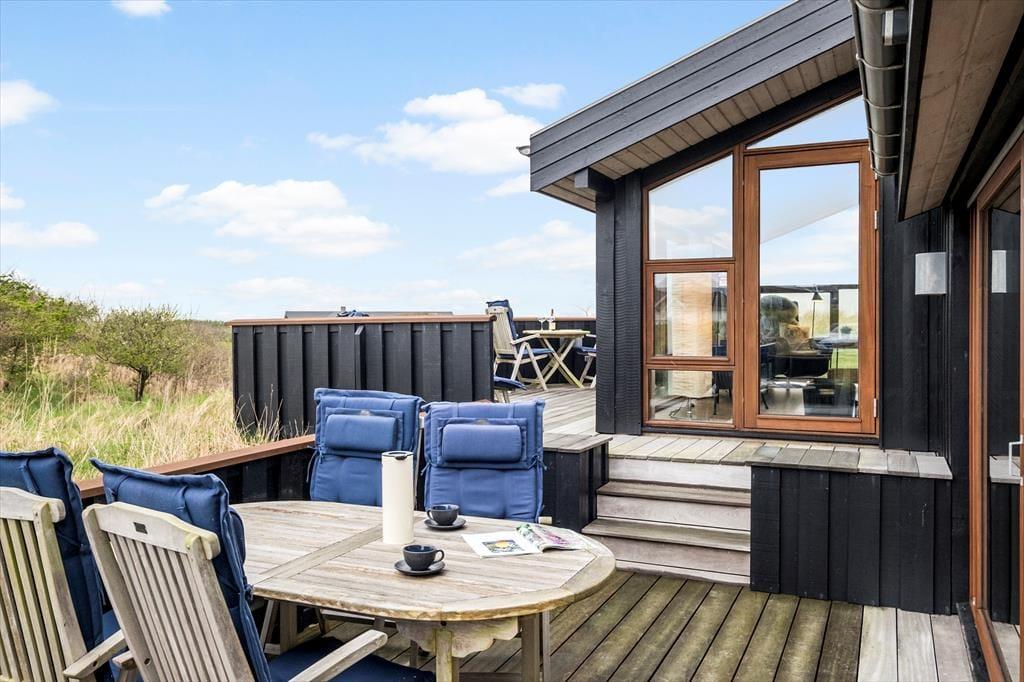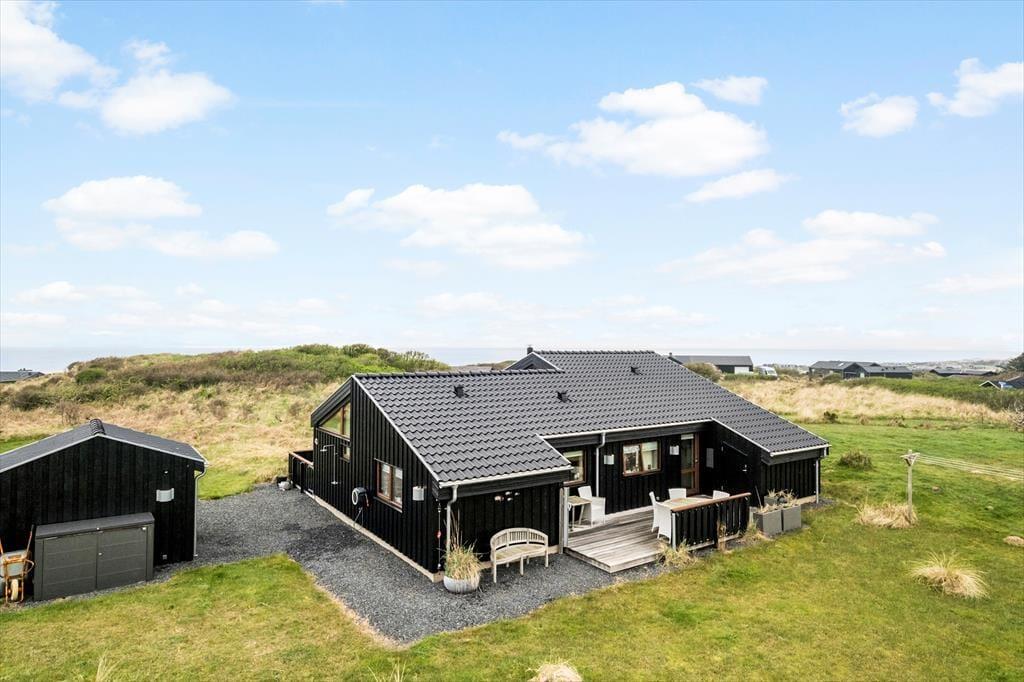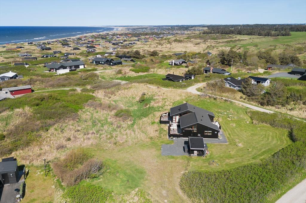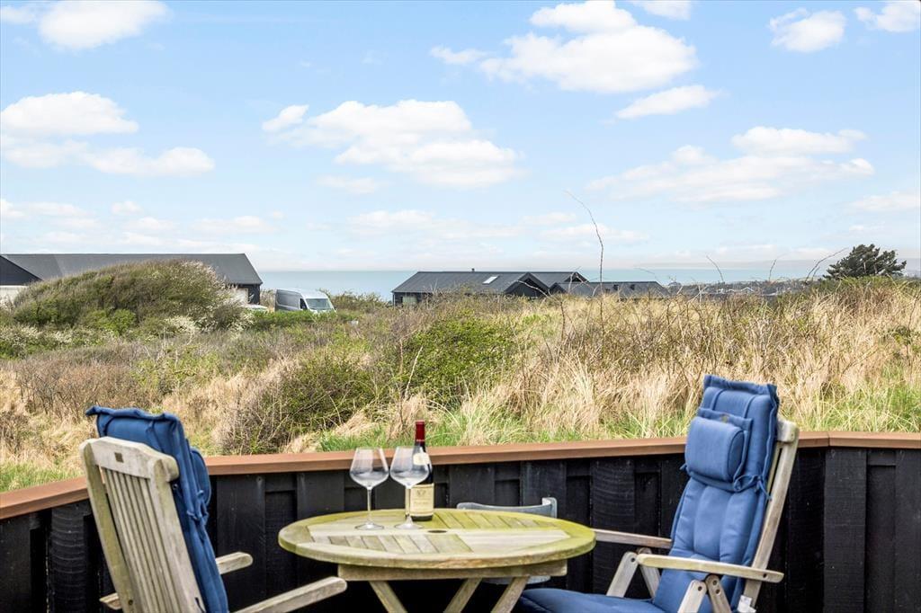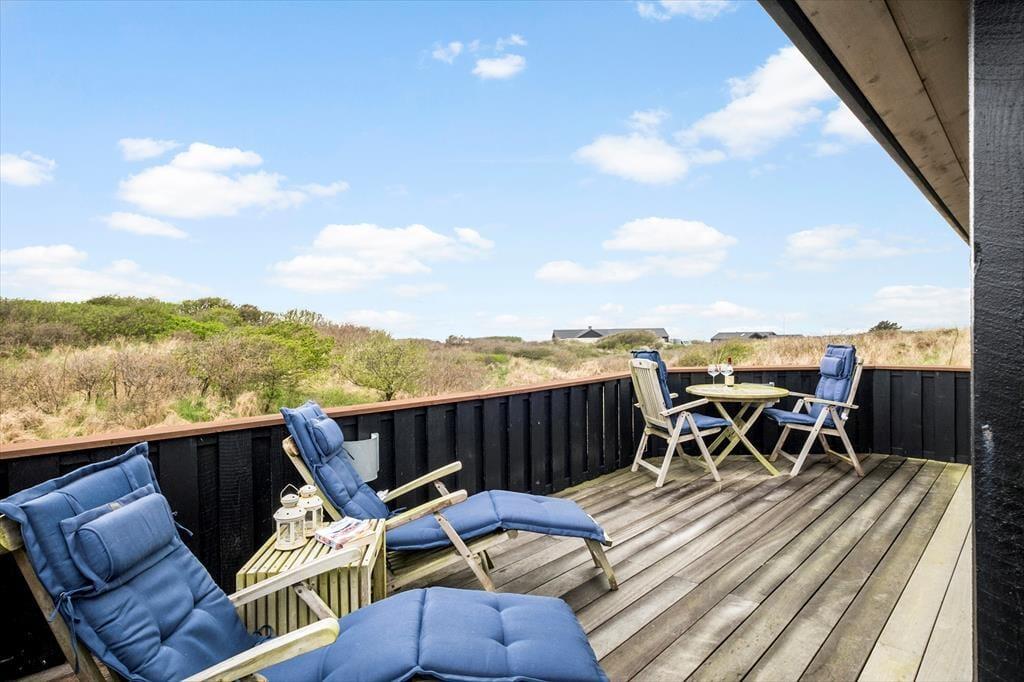 Udenfor venter et skønt terrassemiljø, som næsten føles som en naturlig forlængelse af huset. Her er anlagt flere terrasser i forskellige niveauer, og det giver dig mulighed for at finde præcis det sted, der passer til dagens stemning – om det er morgensolen på den ene side af huset eller den gyldne aftensol på den anden. Og så er der udsigten: Fra den høje beliggenhed kan du skue ud over det åbne landskab og det dybblå Vesterhav, der skifter udtryk med vejret og lyset. Terrasserne indbyder til afslappede feriedage med bøger, grillhygge og gode samtaler, og på stille dage kan du høre fuglene i klitterne og mærke vinden kærtegne huden. Det er den slags dage, der sætter sig fast i hukommelsen som små glimt af ferielykke.