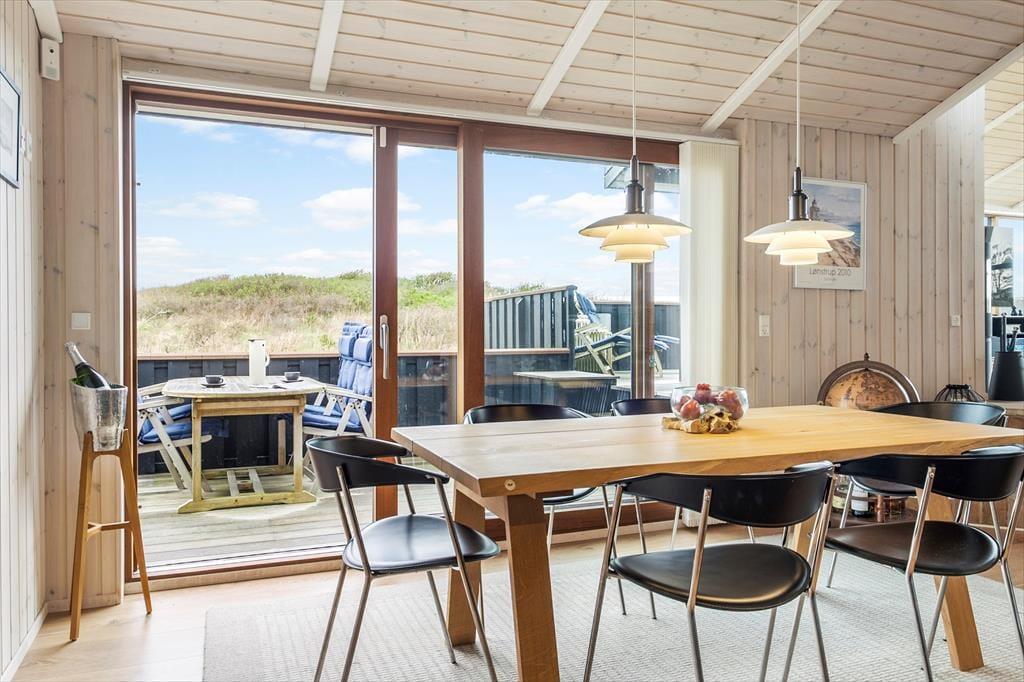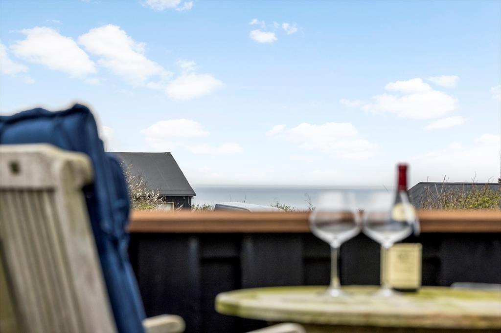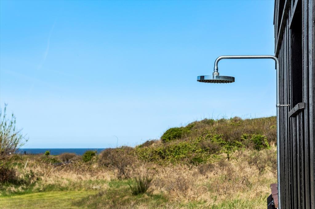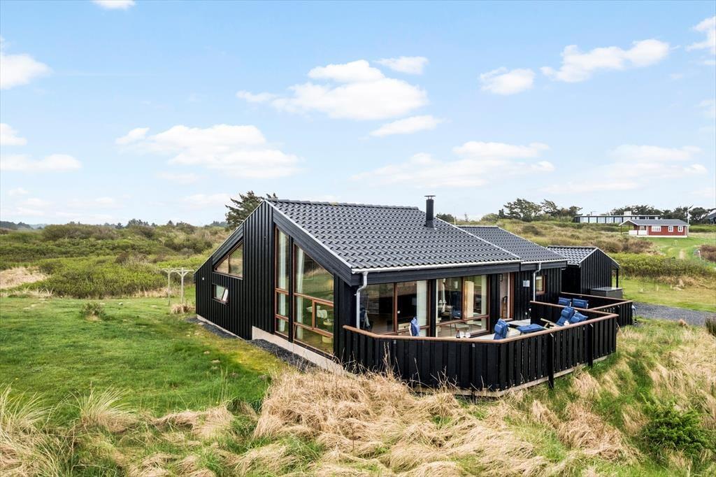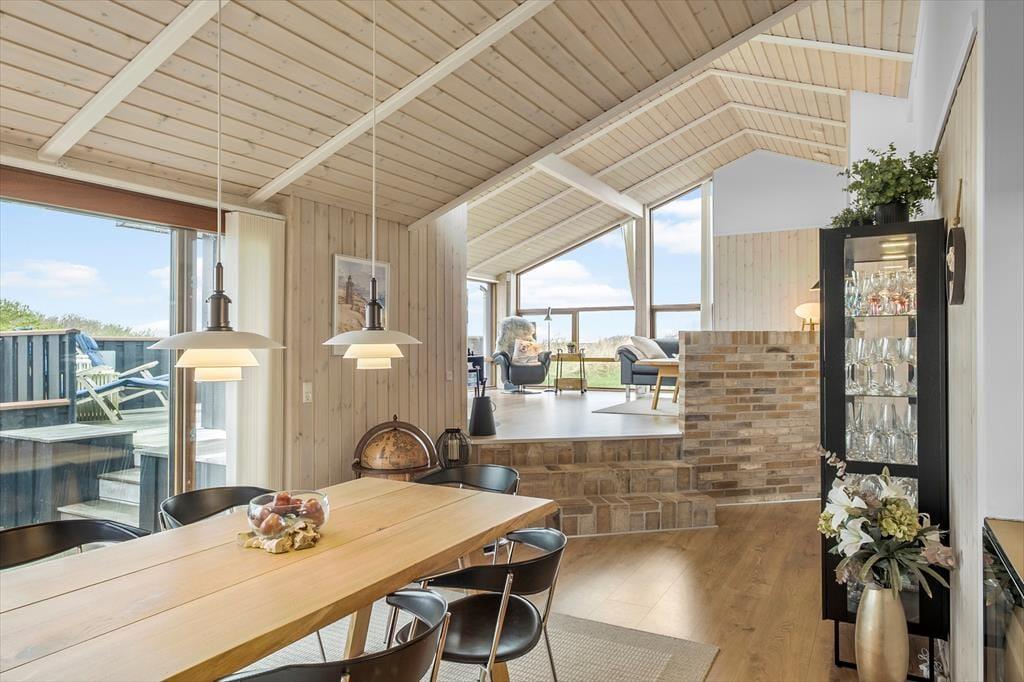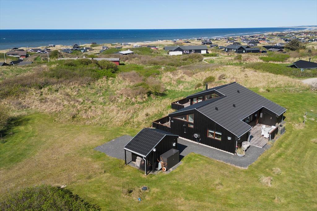 Udenfor venter et skønt terrassemiljø, som næsten føles som en naturlig forlængelse af huset. Her er anlagt flere terrasser i forskellige niveauer, og det giver dig mulighed for at finde præcis det sted, der passer til dagens stemning – om det er morgensolen på den ene side af huset eller den gyldne aftensol på den anden. Og så er der udsigten: Fra den høje beliggenhed kan du skue ud over det åbne landskab og det dybblå Vesterhav, der skifter udtryk med vejret og lyset. Terrasserne indbyder til afslappede feriedage med bøger, grillhygge og gode samtaler, og på stille dage kan du høre fuglene i klitterne og mærke vinden kærtegne huden. Det er den slags dage, der sætter sig fast i hukommelsen som små glimt af ferielykke.