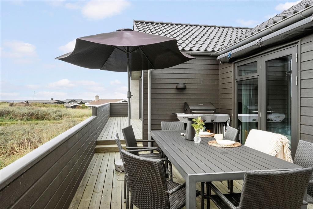 Når solen skinner – og det gør den heldigvis ofte i Lønstrup – vil du hurtigt opdage, at det store terrassemiljø næsten fungerer som husets ekstra opholdsrum. Træterrassen går næsten hele vejen rundt om sommerhuset, så du kan flytte med solen i takt med, at den bevæger sig over himlen. Start morgenen med en stille kop kaffe i læ på østsiden, snup en lur i liggestolen under eftermiddagssolen mod syd, og saml familien til grillmiddag på den vestvendte del af terrassen, mens solen går ned i horisonten. Herfra har du nemlig en storslået udsigt over det brusende Vesterhav – en kulisse, der næsten er for god til at være sand. Det er også et ideelt sted at lade børnene lege på den naturlige grund, mens de voksne nyder ferielivet i ro og mag.