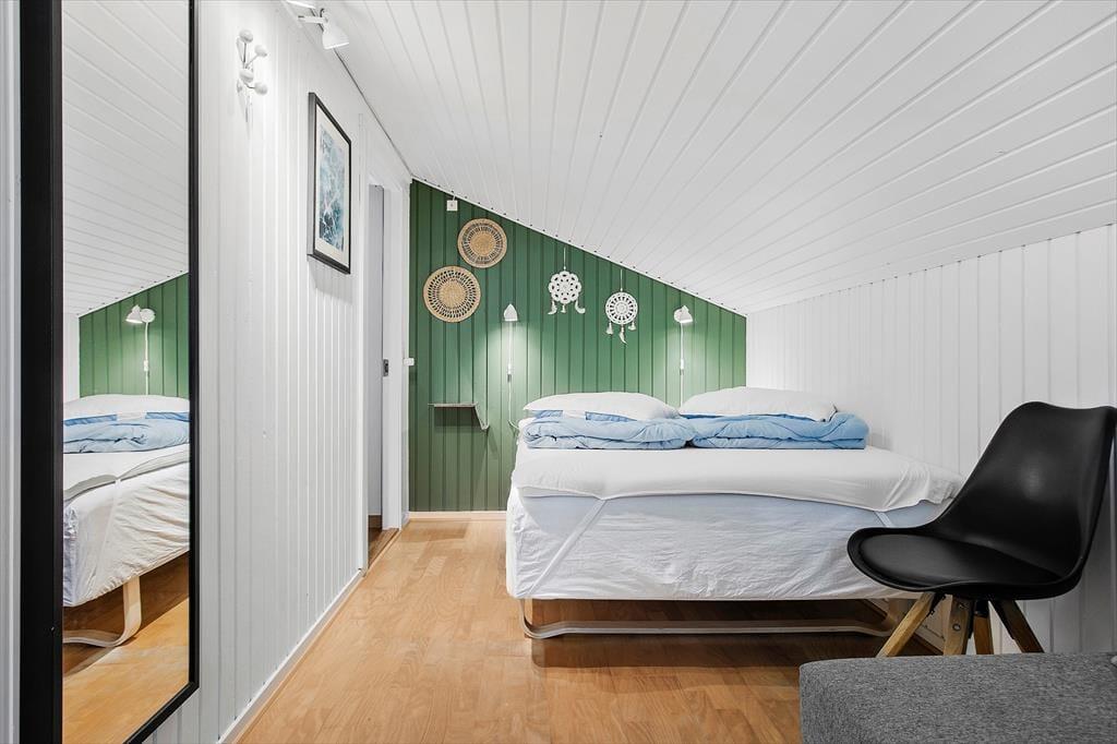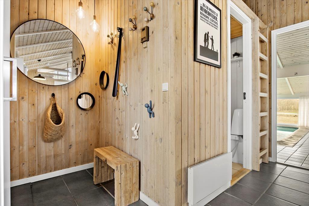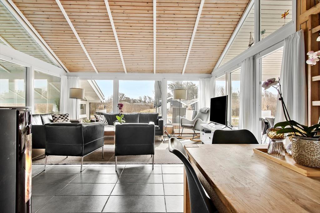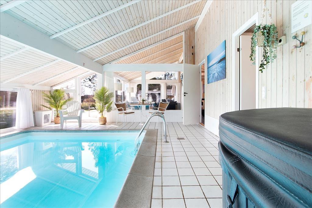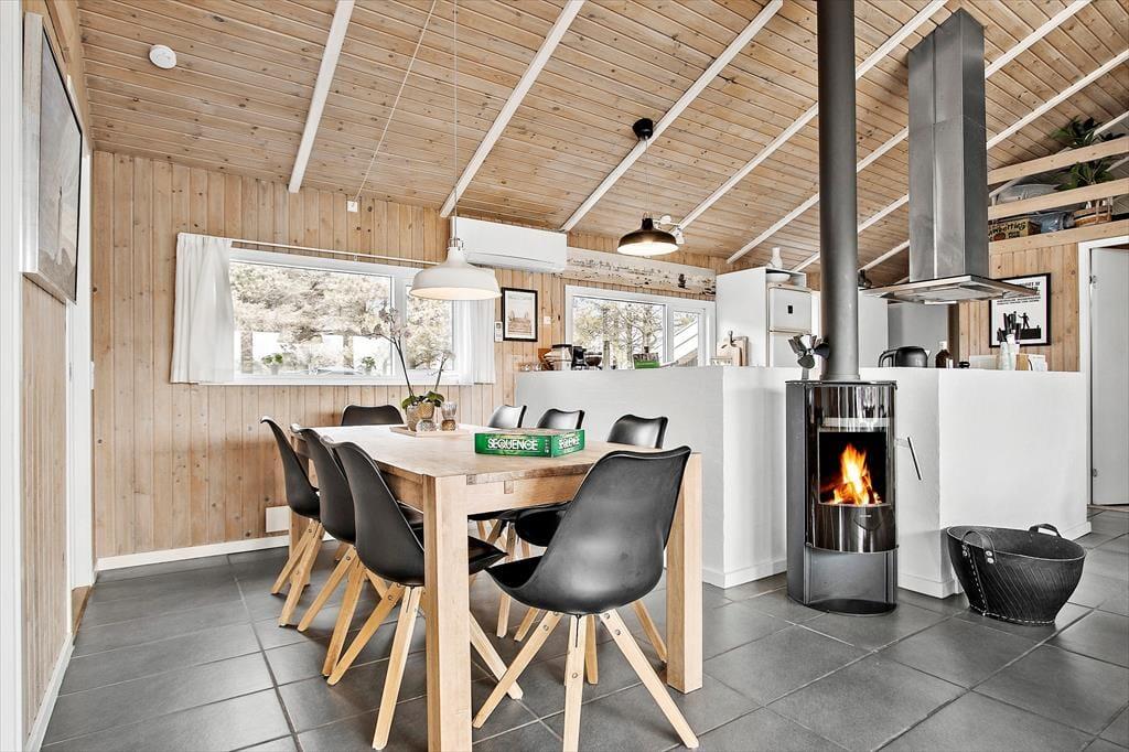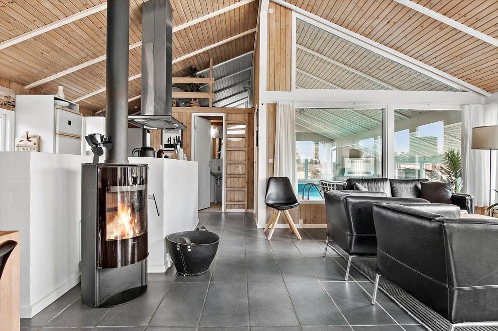 Når du træder indenfor i sommerhuset, vil du straks føle dig hjemme. Indretningen er både smagfuld og hyggelig, og de varme nuancer i rummene skaber en indbydende stemning. Fra stuen kan du følge med i, hvad der sker i det velindrettede poolområde, så børnene kan trygt lege, mens du slapper af. Brændeovnen i stuen tilføjer ekstra hygge på kølige dage, og du kan finde ro, mens du ser flammerne danse. Huset er indrettet med tanke på både komfort og funktionalitet, så du kan nemt tilbringe tid sammen med familien, hvad enten du laver mad i det åbne køkken eller nyder en stille stund i stuen.