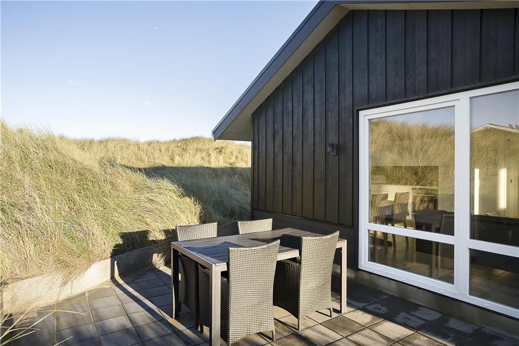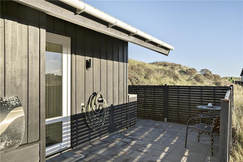 Der er terrasser på to af husets sider, så der er rig mulighed for at fange solens stråler. Terrasserne ligger lige op ad klitten, som giver godt læ for vinden. Lige bag huset har I Vesterhavet, og den skønne sti, som følger vandkanten langs hele strækningen. Her er også opsat bænke, hvor man kan nyde bølgerne og den nedadgående sol i stilhed.