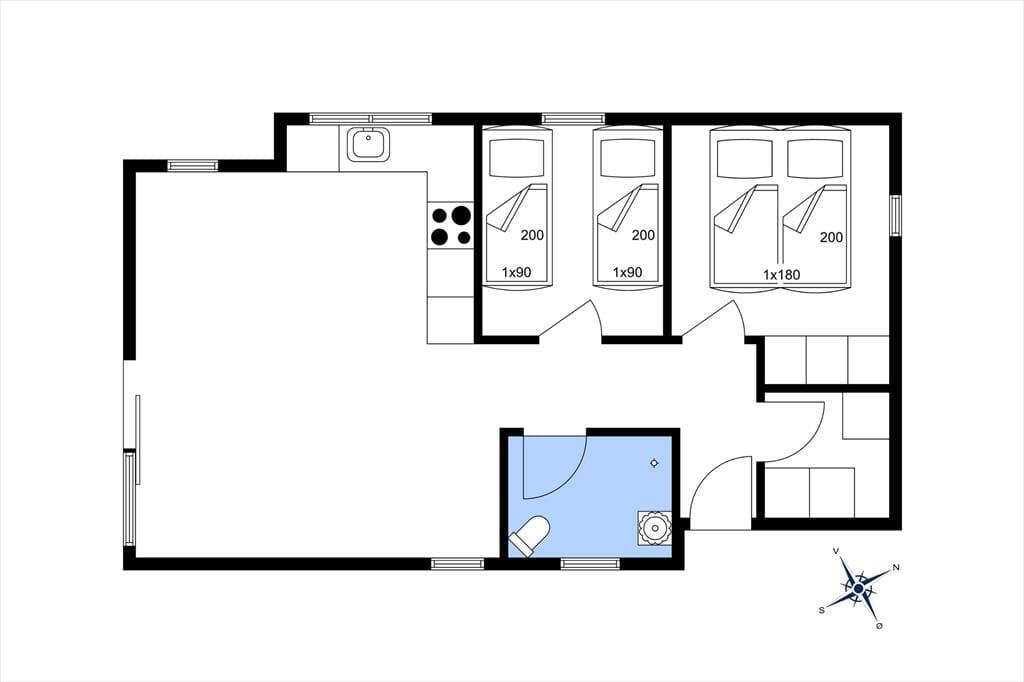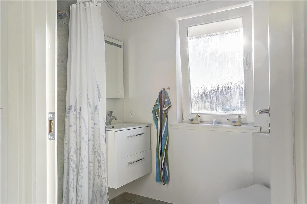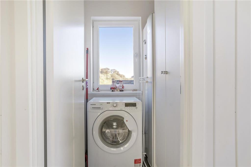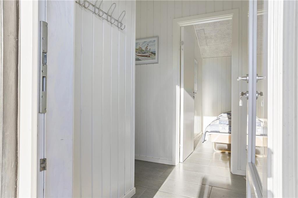Man træder ind i et vindfang, hvorfra der er adgang til badeværelse med bruser. Der er to velindrettede soverum med hhv. en bred dobbeltseng og to gode enkeltsenge. Derudover et mindre rum med vaskemaskine og tørretumbler. Det særdeles veludstyrede køkken er lyst og sammenhængende med stuen. Møblerne er smagfulde og afstemte med hinanden, så huset fremstår som en skøn ramme om en vellykket ferie. Der er loft til kip, så det giver en god rumoplevelse.