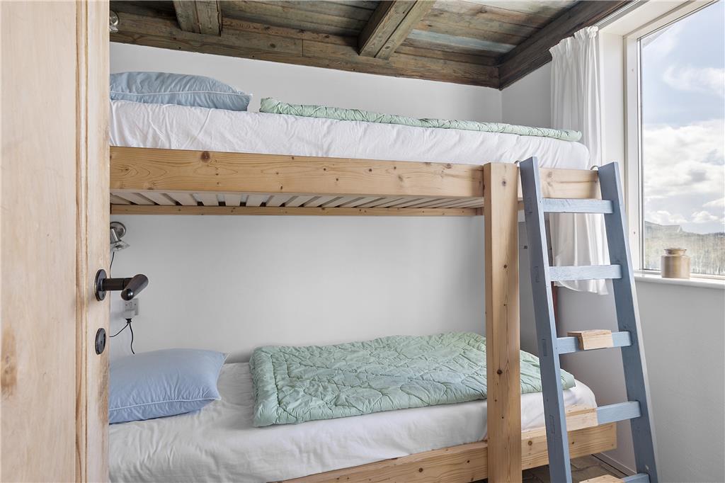 Feriehuset indeholder et dejligt køkken/alrum, hvor fra der er udgang til terrasse mod nord og mod syd. I huset er der 2 gode værelser - et med en 3/4 seng og et med køjesenge. Fra det ene værelse er adgang til mindre badeværelse med bruser. I anneks er der et stort lyst rum med 2 enkeltsenge - annekset har udgang til den fælles terrasse. Et personligt hus med stil samt havudsigt fra lænestolen.