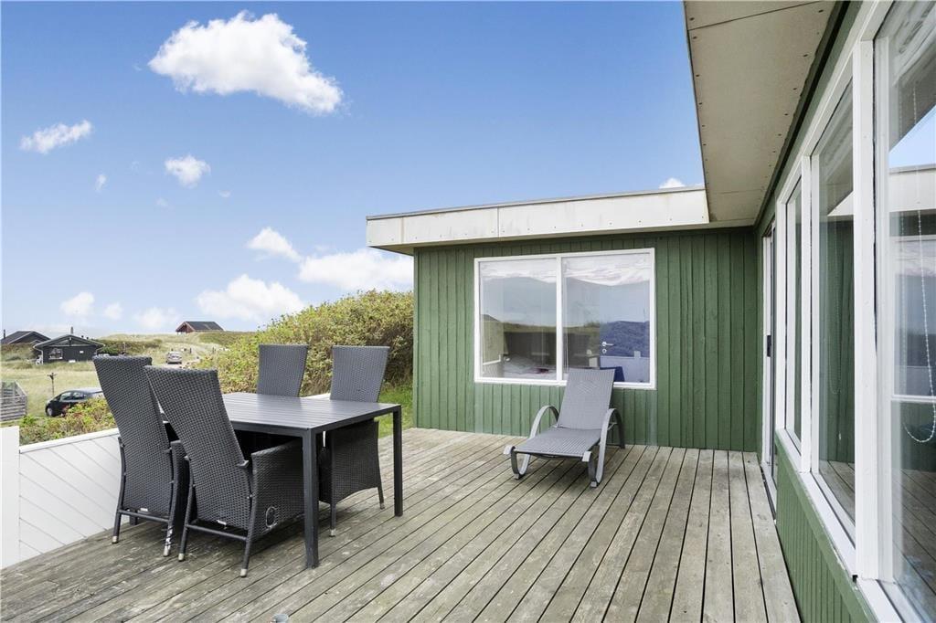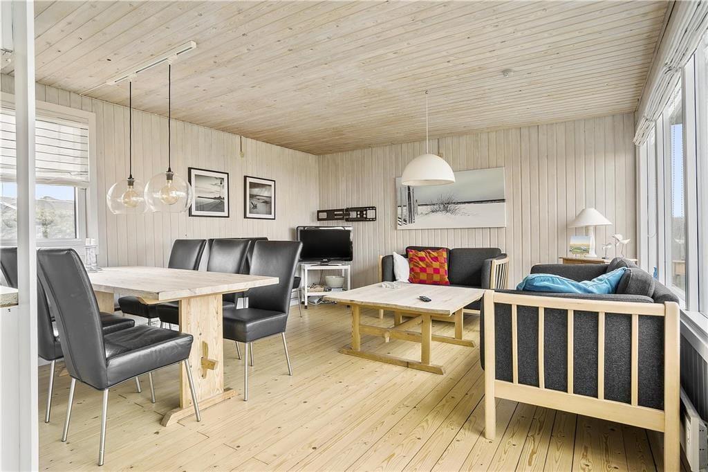 Dette klassiske, ældre træsommerhus ligger smukt i Harerendens klitlandskab på en højtliggende, kuperet grund. For at komme frem til huset skal I tage en trappe, så det er ikke en feriebolig for gangbesværede. Til gengæld bliver I belønnet med den skønneste udsigt over Vesterhavet fra både stuen og terrassen.