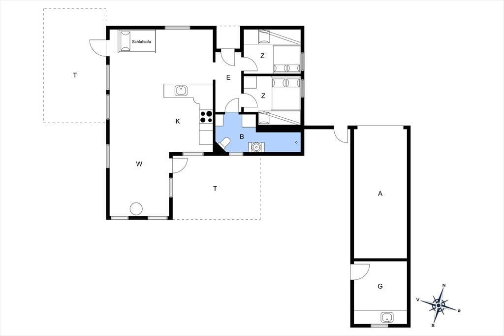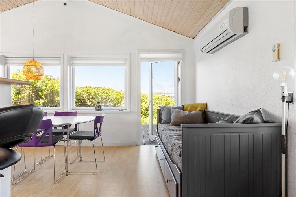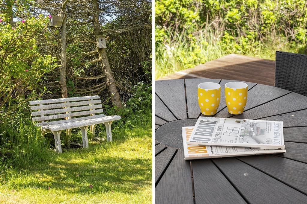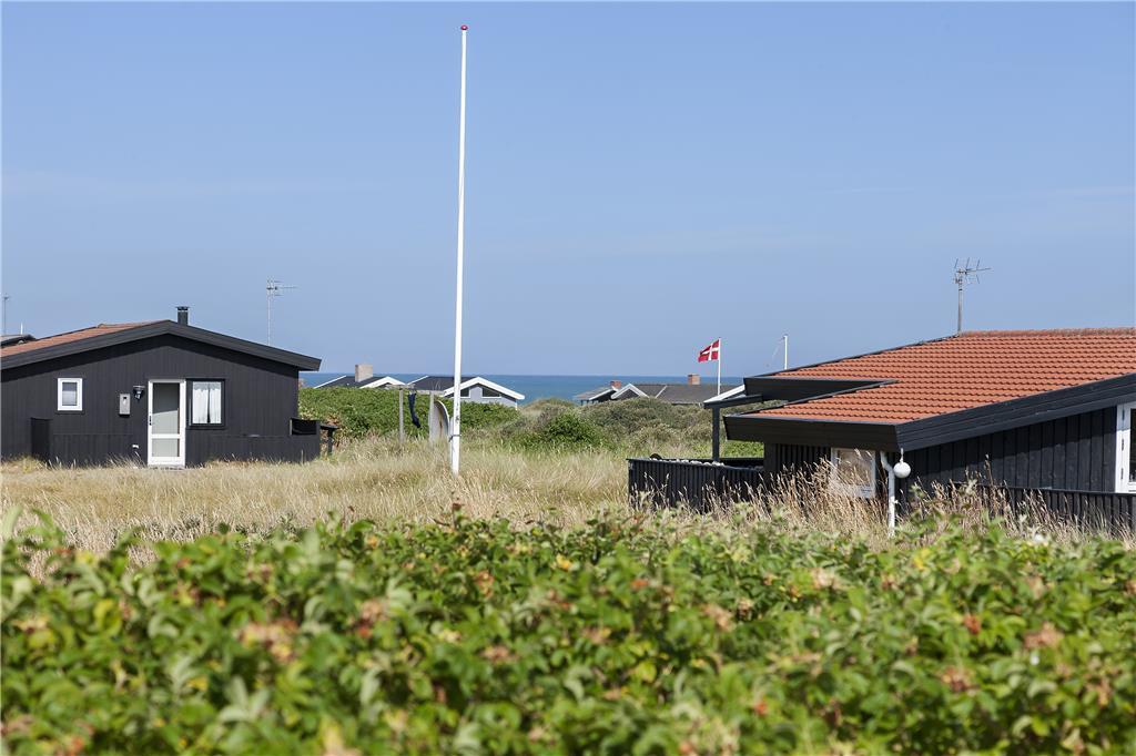Fra grunden er der en skøn udsigt over området og også et lille glimt af Vesterhavet. Der er terrasser på to sider af huset, og udgang fra opholdsrummet til begge, så det er nemt at tage flere af feriens måltider med udendørs. Grill og havemøbler hører naturligvis også til huset, så det er med at nyde mest muligt af ferien udendørs.