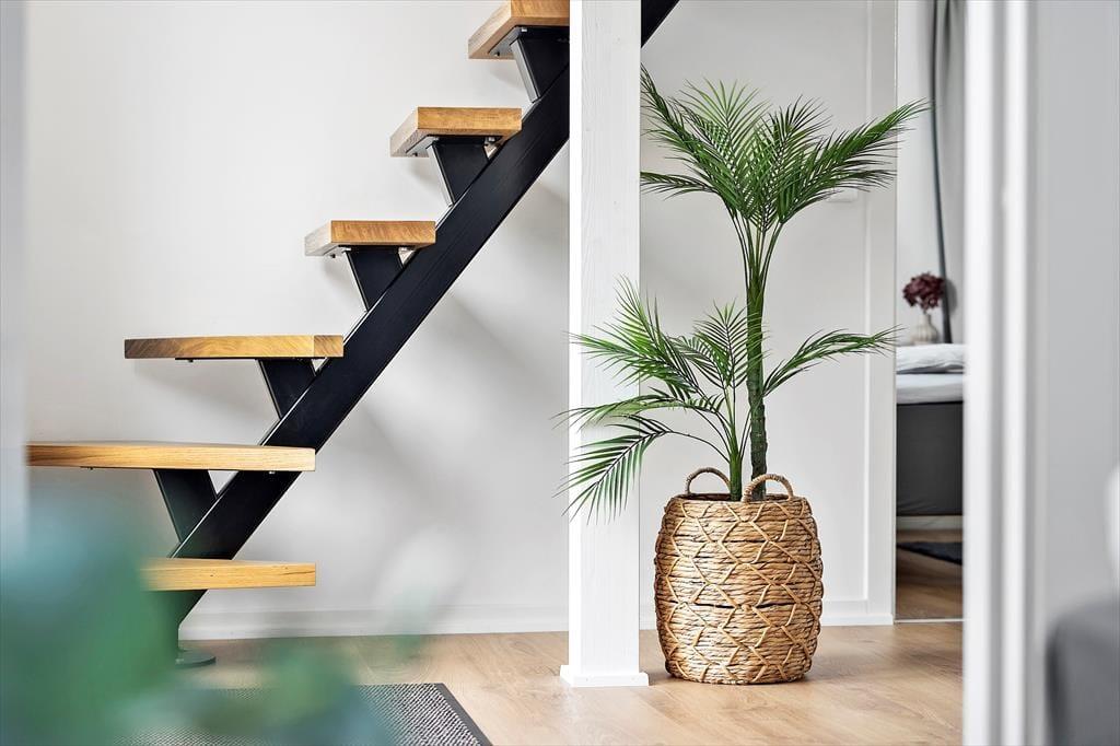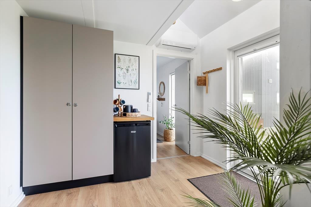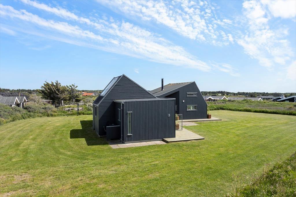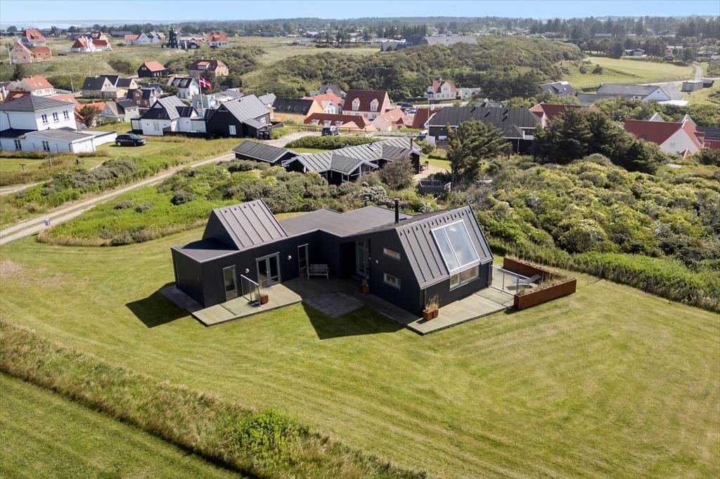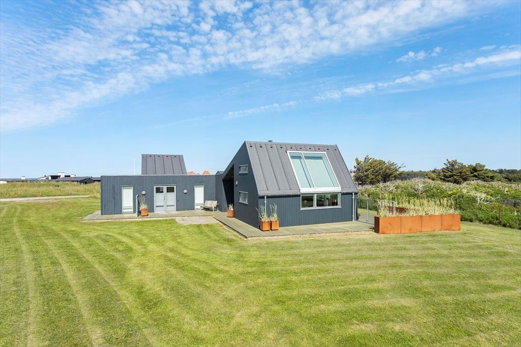 Når du træder ind i dette arkitekttegnede sommerhus, bliver du straks mødt af et lysindfald, der får de smagfuldt indrettede rum til at skinne. Stue, spisestue og køkken ligger i åben forbindelse og skaber en hyggelig ramme om samværet – uanset om det er til måltider eller brætspil om aftenen. Det mørke, elegante interiør står i flot kontrast til de lyse vægge og det farverige landskab udenfor. I husets hjerte finder du en hems, som er den perfekte læsekrog med udsigt over Vesterhavet. Her kan du læne dig tilbage og lade tankerne flyve, mens du betragter havets bølger eller solens spil på himlen. Sommerhuset har tre rummelige soveværelser – to af dem ligger i en separat fløj med egen indgang og ekstra badeværelse. Badeværelset i hovedhuset byder desuden på sauna, så du kan forkæle dig selv efter en dag fyldt med oplevelser.
