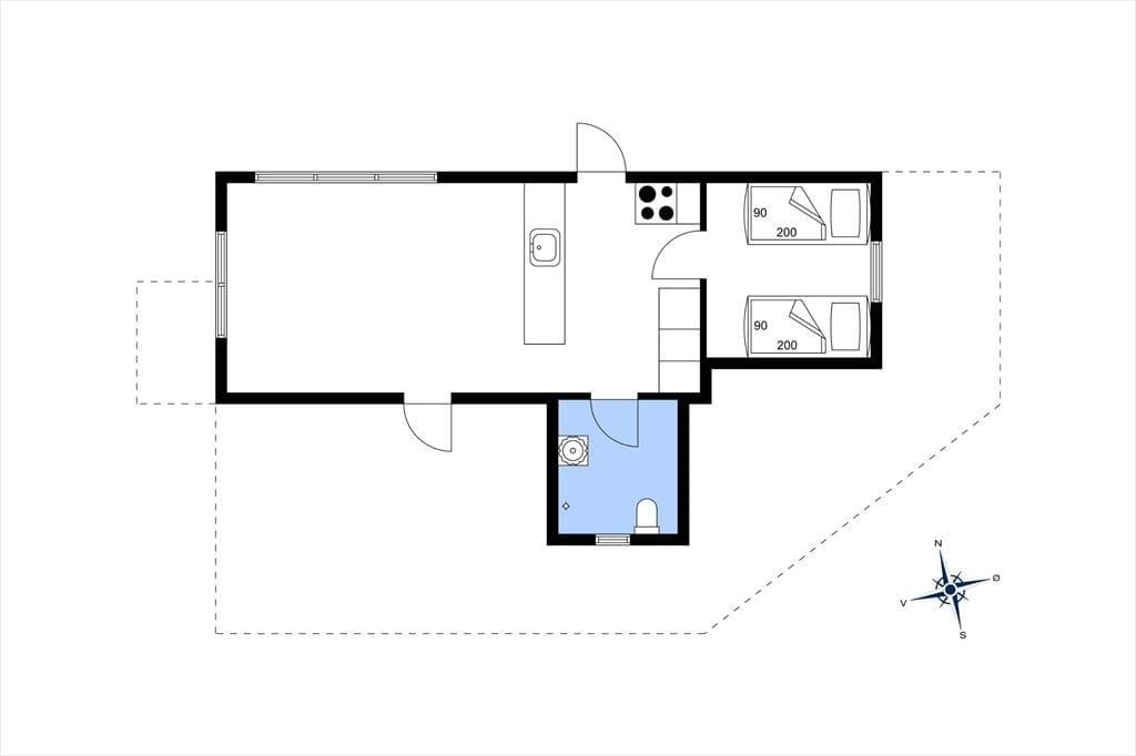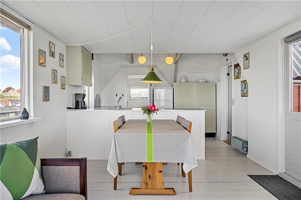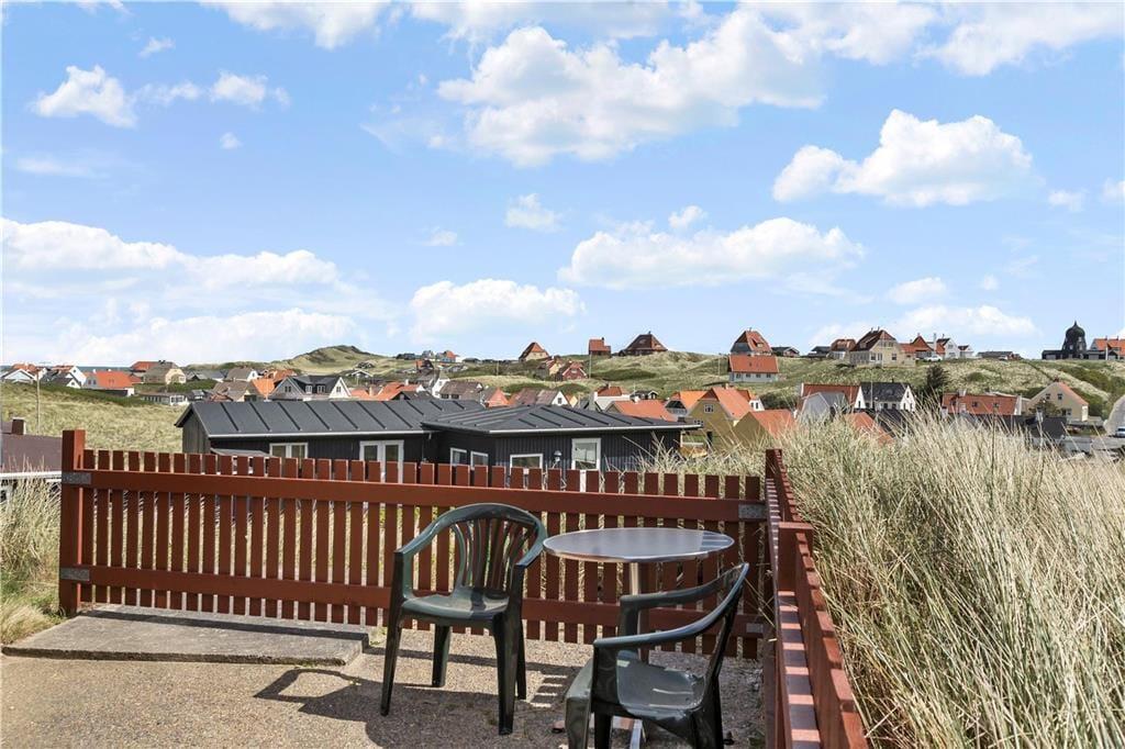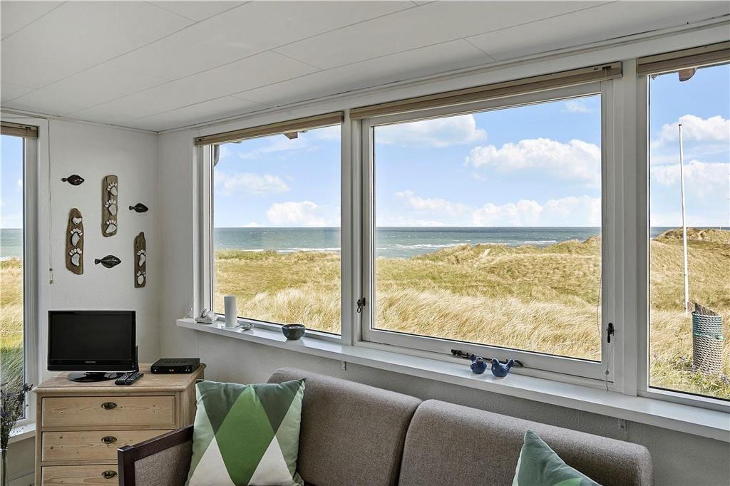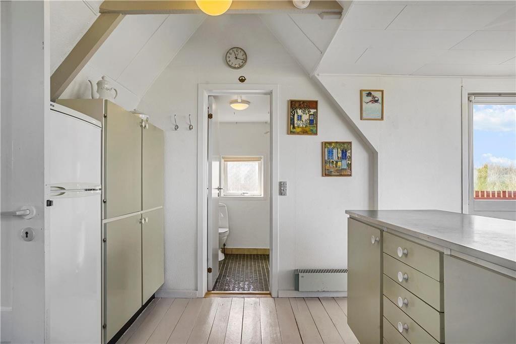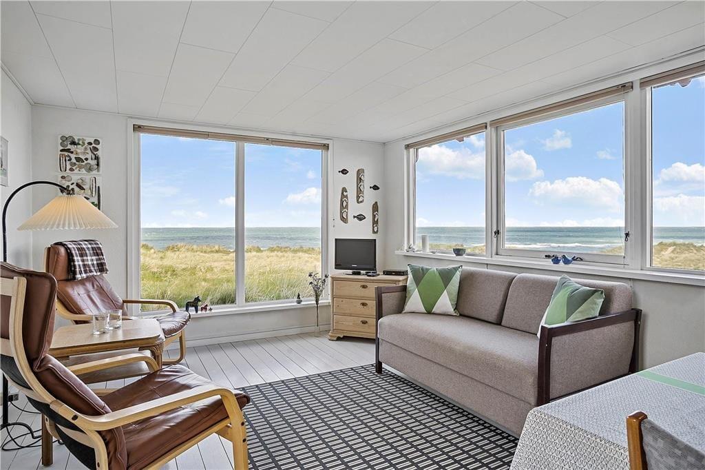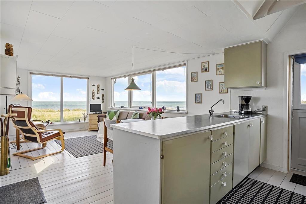 Køkkenet ligger i åben forbindelse til stuen, hvor der er gode siddemøbler og en helt fantastisk udsigt over havet og det skønne klitlandskab. Der er udgang til et fliseareal fra køkkenet, og fra stuen er der udgang til terrassen. Der er et soveværelse med to enkeltsenge samt en dobbelt sovesofa i stuen. Desuden et badeværelse med bruseniche.