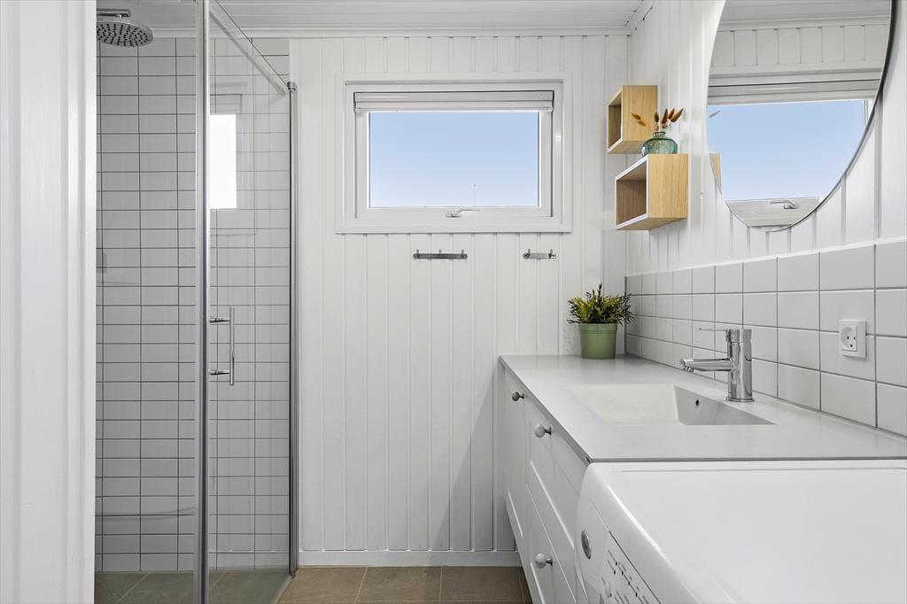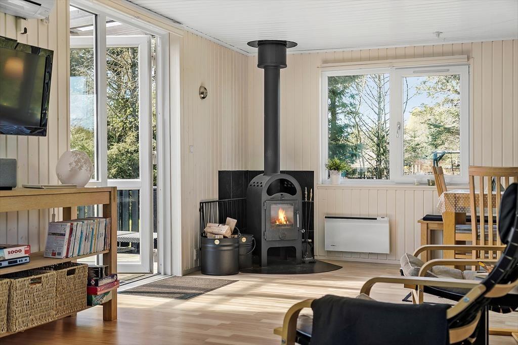 Mens selve sommerhuset måler 69 m2, har I yderligere 24 m2 at gøre godt med i annekset, og derfor er der god plads til seks personer inden døre. De to bygninger er forbundet af en delvist overdækket terrasse, der gør det nemt at smutte over for at sove eller spille bordfodbold. Annekset byder på to soverum, og derudover er der to soveværelser i selve sommerhuset, så I har flere fordelingsmuligheder, når det er sengetid. I løbet af dagen kan I samles i opholdsafdelingen, der består af køkken og stue i åben forbindelse, for at hygge jer med brætspil, lækker mad, læsestunder og alt det andet, en afslappende ferie kan byde på. I rummet er der brændeovn og varmepumpe, og så er der for øvrigt solvarme, som gør huset energivenligt. Planløsningen fuldendes af et nyt badeværelse fra 2022 med gulvvarme.