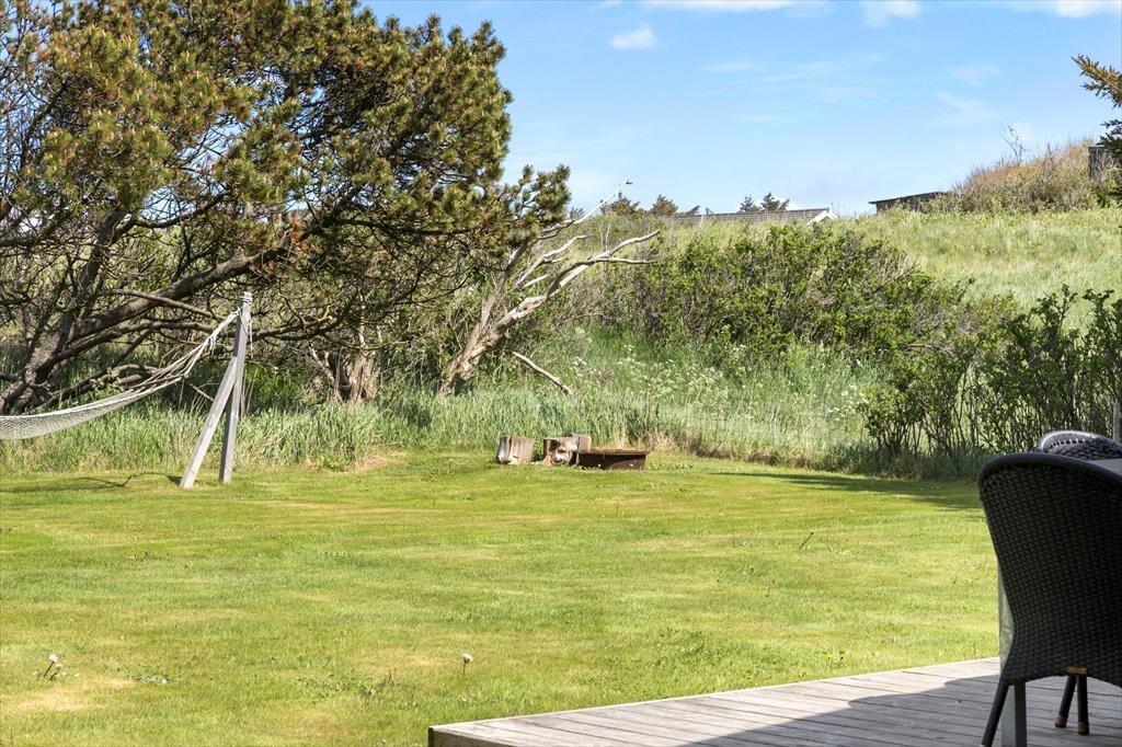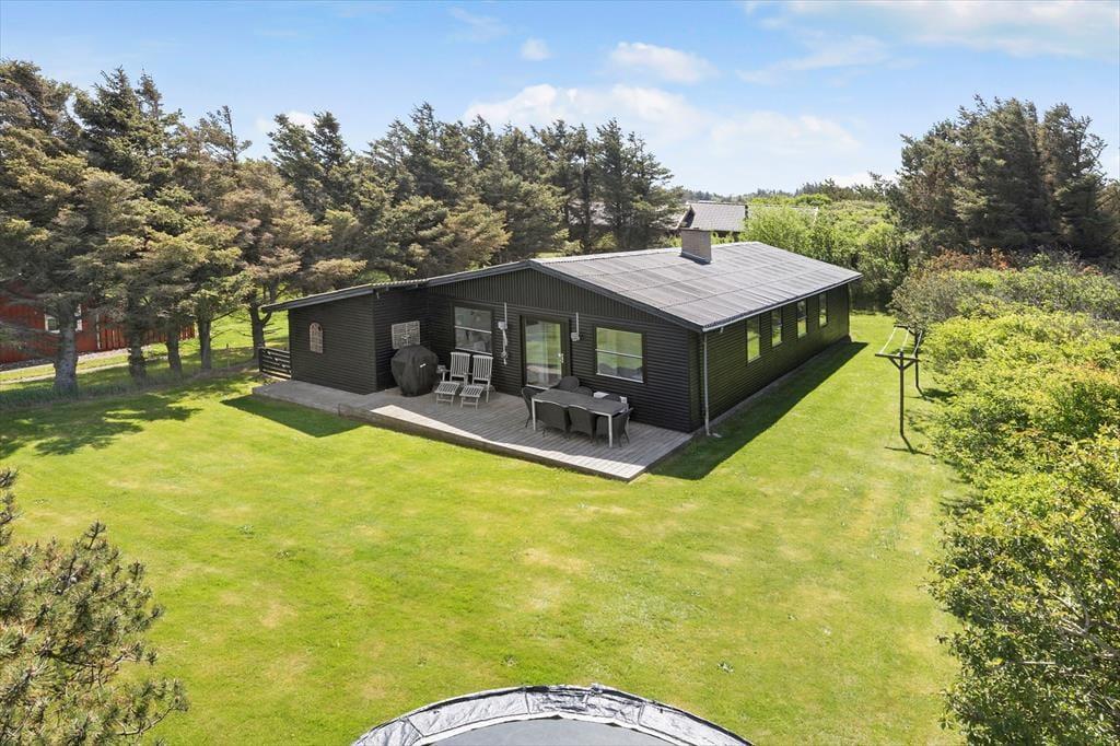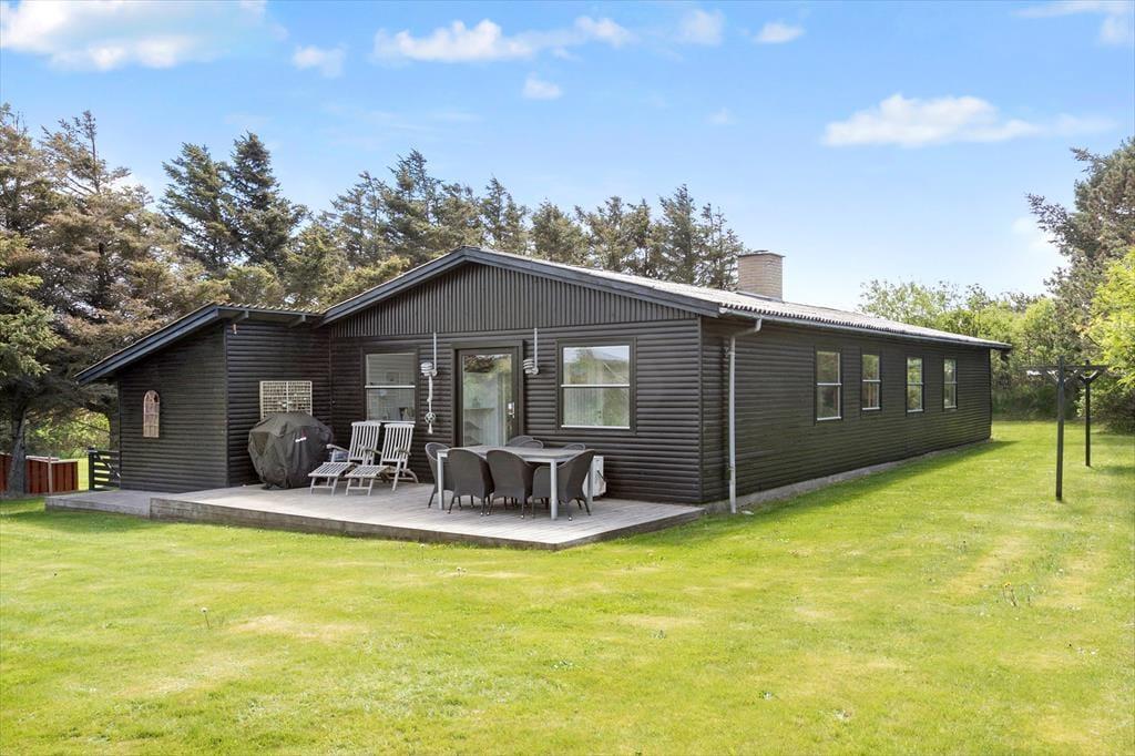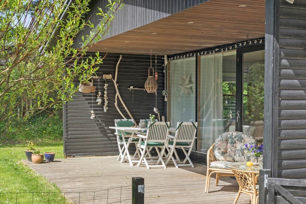Sommerhuset ligger på en havegrund omkranset af nåletræer, som giver rigtig godt læ, og som gør, at man kan opholde sig udenfor ganske ugeneret. Der er masser af plads til leg og udfoldelse for den aktive familie. Der er flere gode terrasser at opholde sig på. Om aftenen er det hyggeligt at sidde på den overdækkede terrasse og nyde solens sidste stråler eller at tage en time på øjet i en liggestol på den store nord- vestvendte terrasse, mens man kan høre fuglene synge.