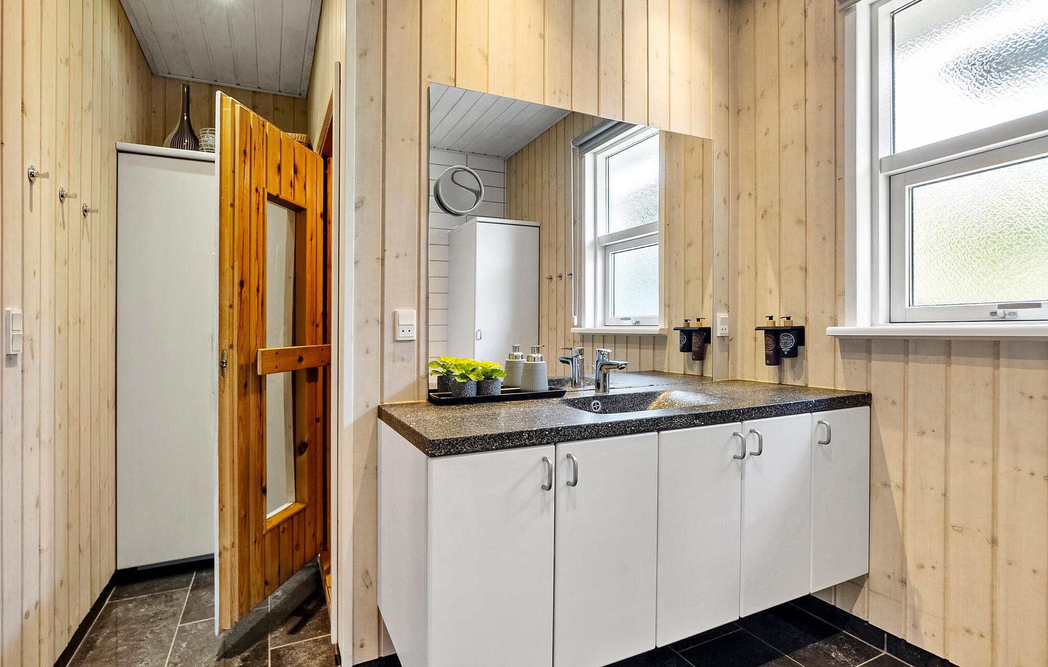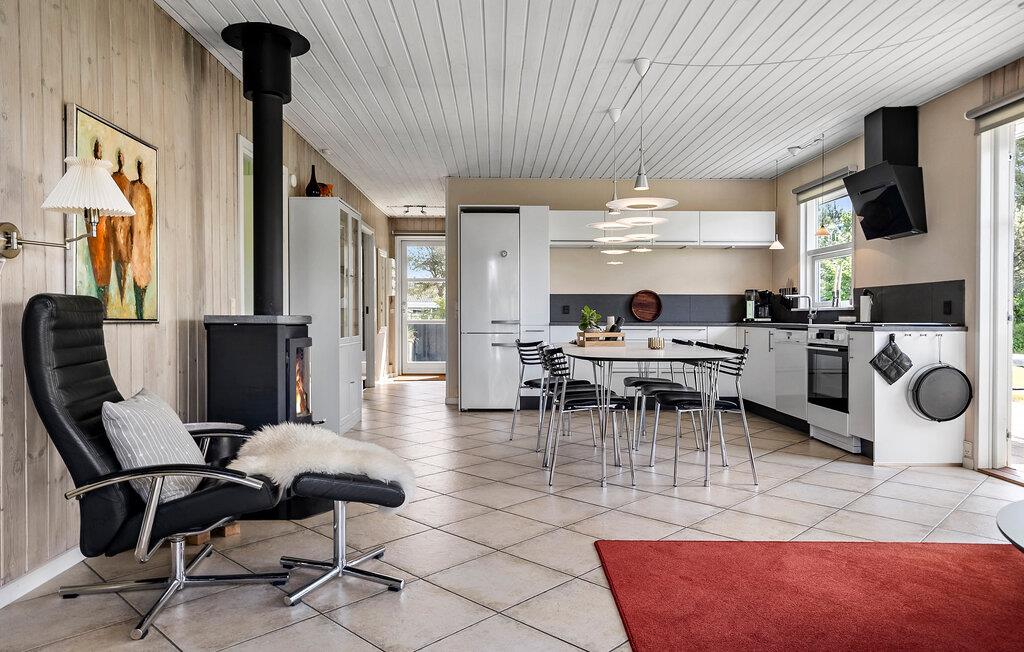 Tilbring afslappende dage i et familievenligt hus, der giver jer optimale betingelser for ferien med en stor have, overdækket terrasse og hjemlig atmosfære. Hele boligarealet i jeres feriehus er lyst og muntert møbleret, hvilket skaber en indbydende atmosfære for hele familien. Slap af i sofaerne, læs en bog eller nyd varmen fra brændeovnen på køligere dage. Lav mad sammen i køkkenet med direkte adgang til spiseområdet. Saunaen byder på behagelig afslapning efter en aktiv dag.